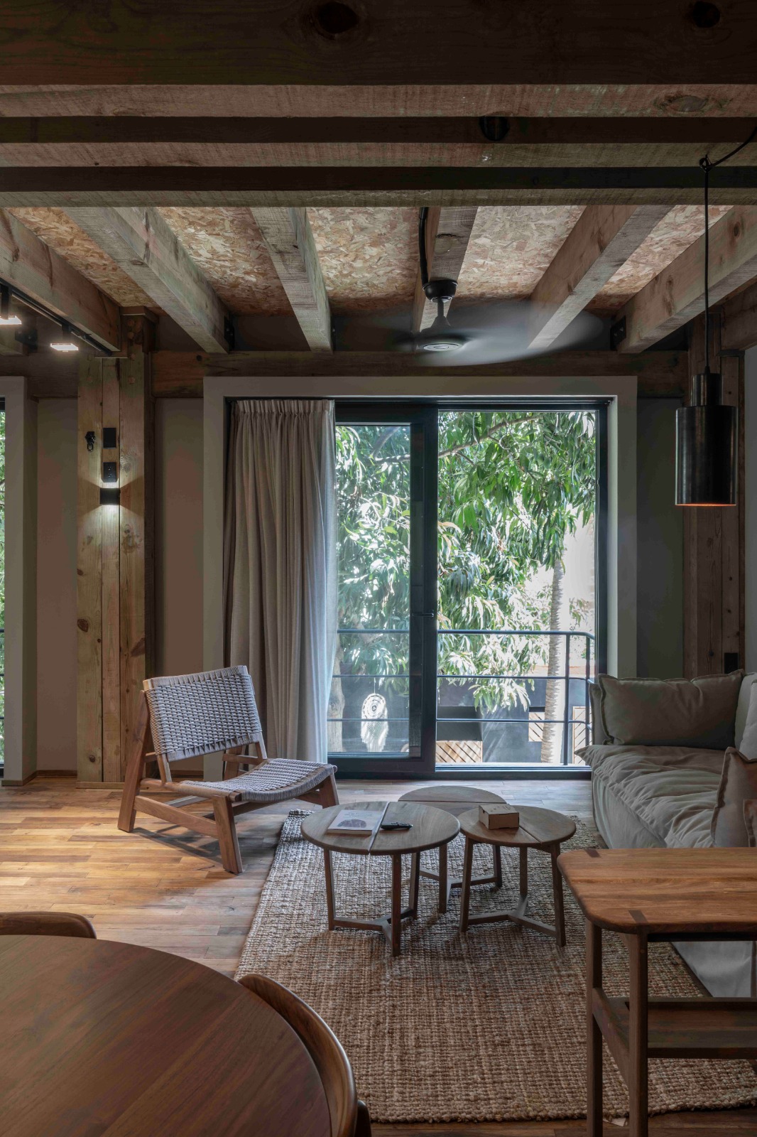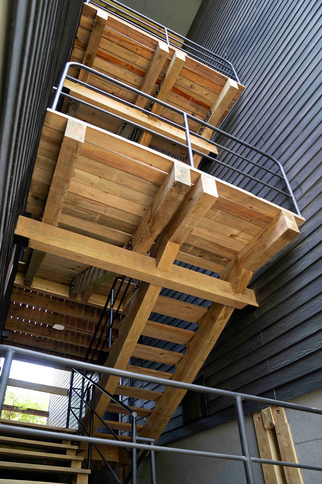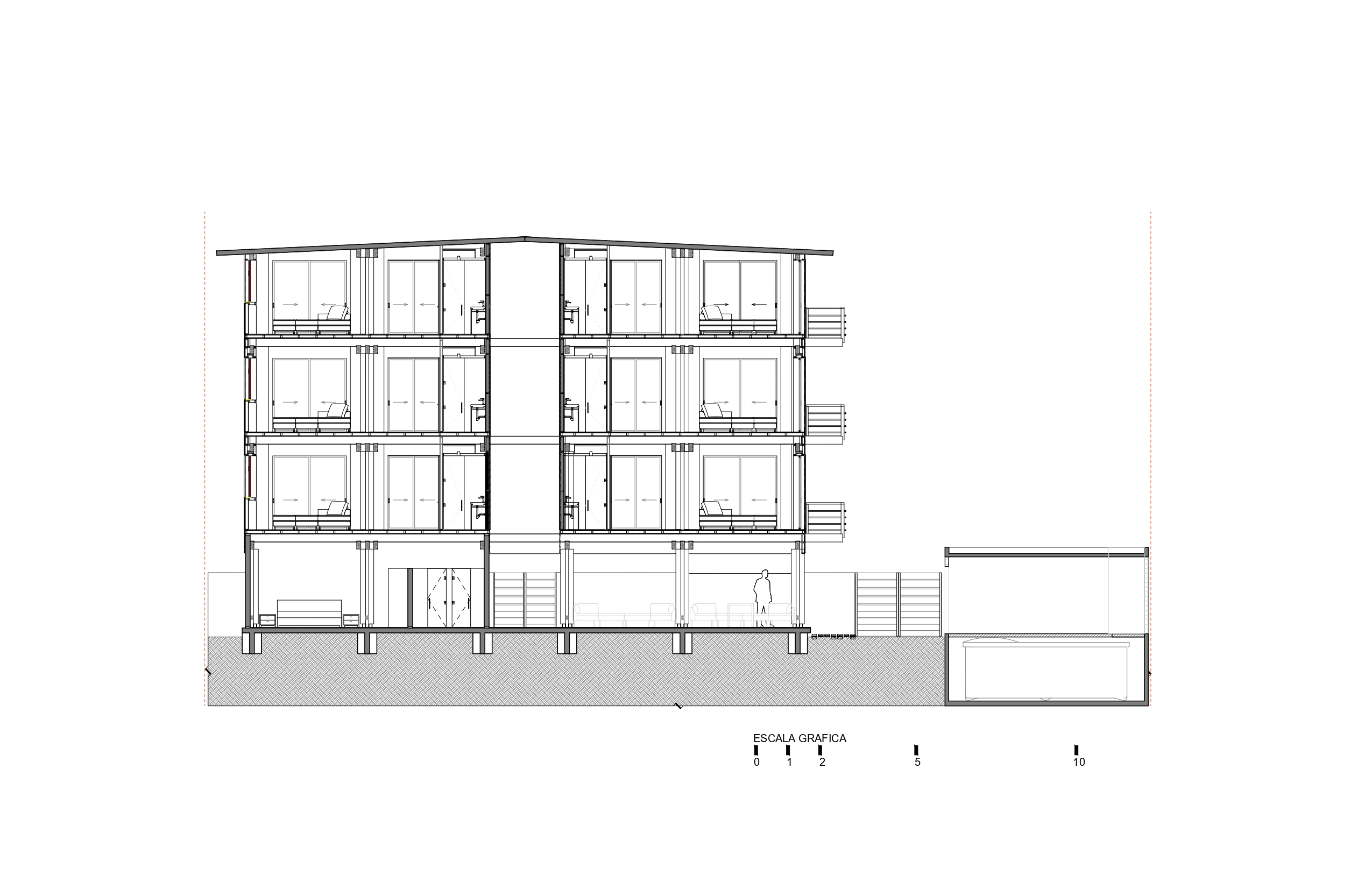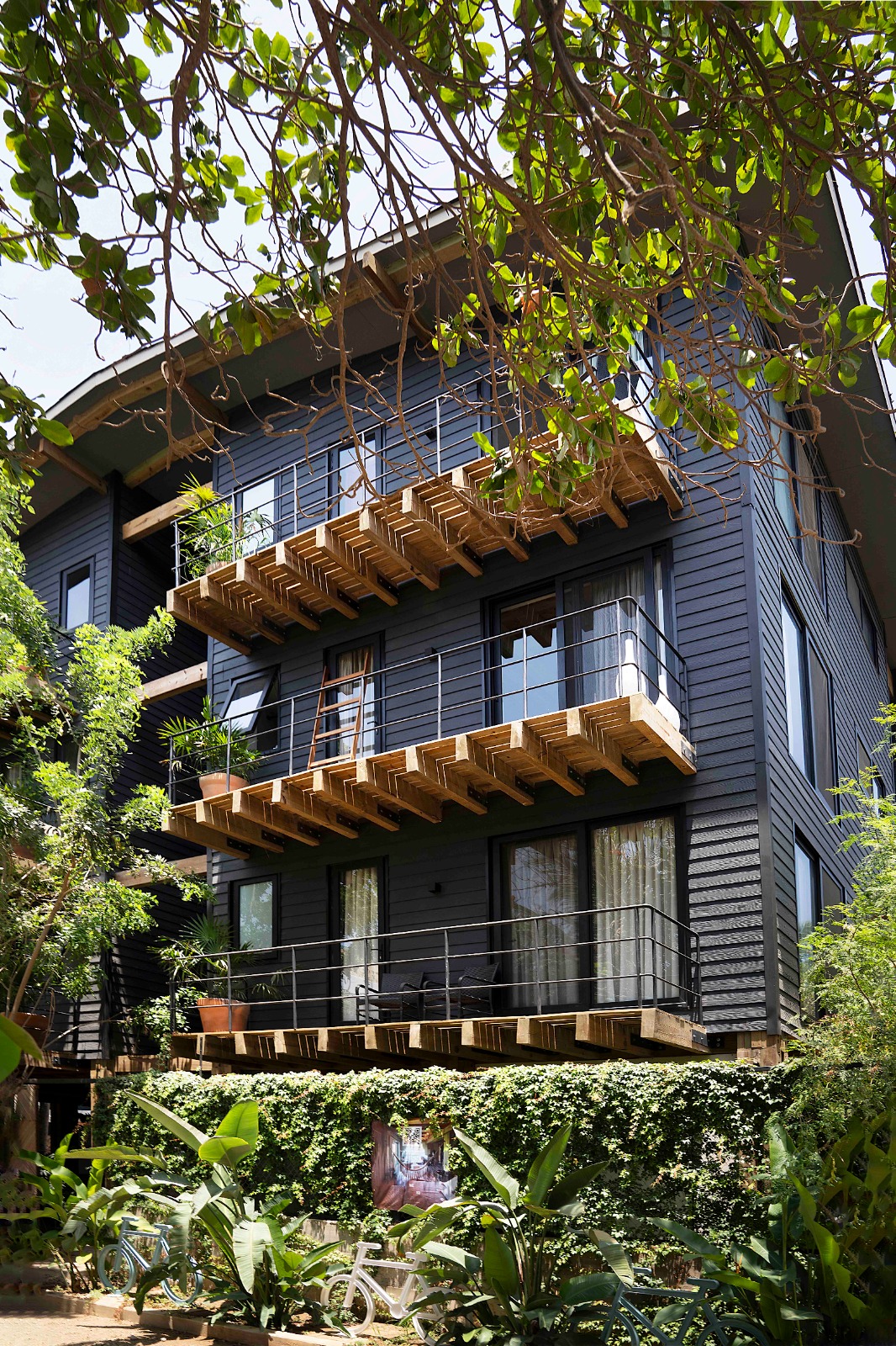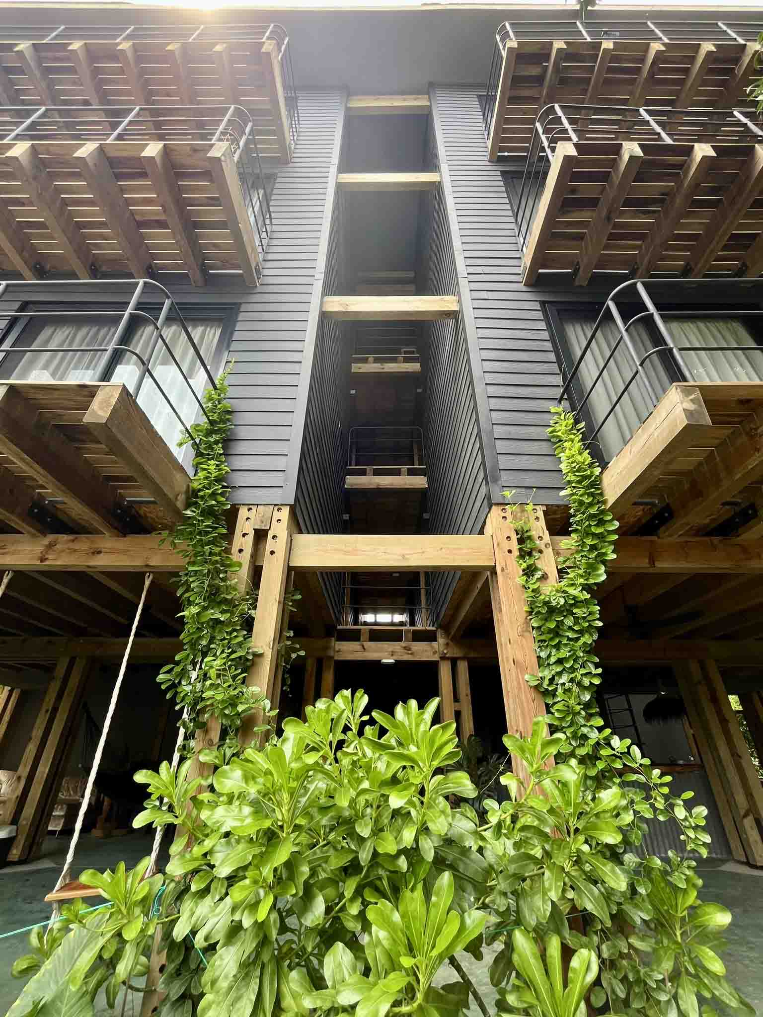 Construido con madera maciza de pino tratado y muros de paneles de fibrocemento con núcleo de poliuretano, el edificio apuesta por materiales innovadores que garantizan durabilidad, eficiencia térmica y confort acústico. Su esquema en cruz evita que las suites compartan muros, lo que mejora la privacidad, ventilación y distribución.