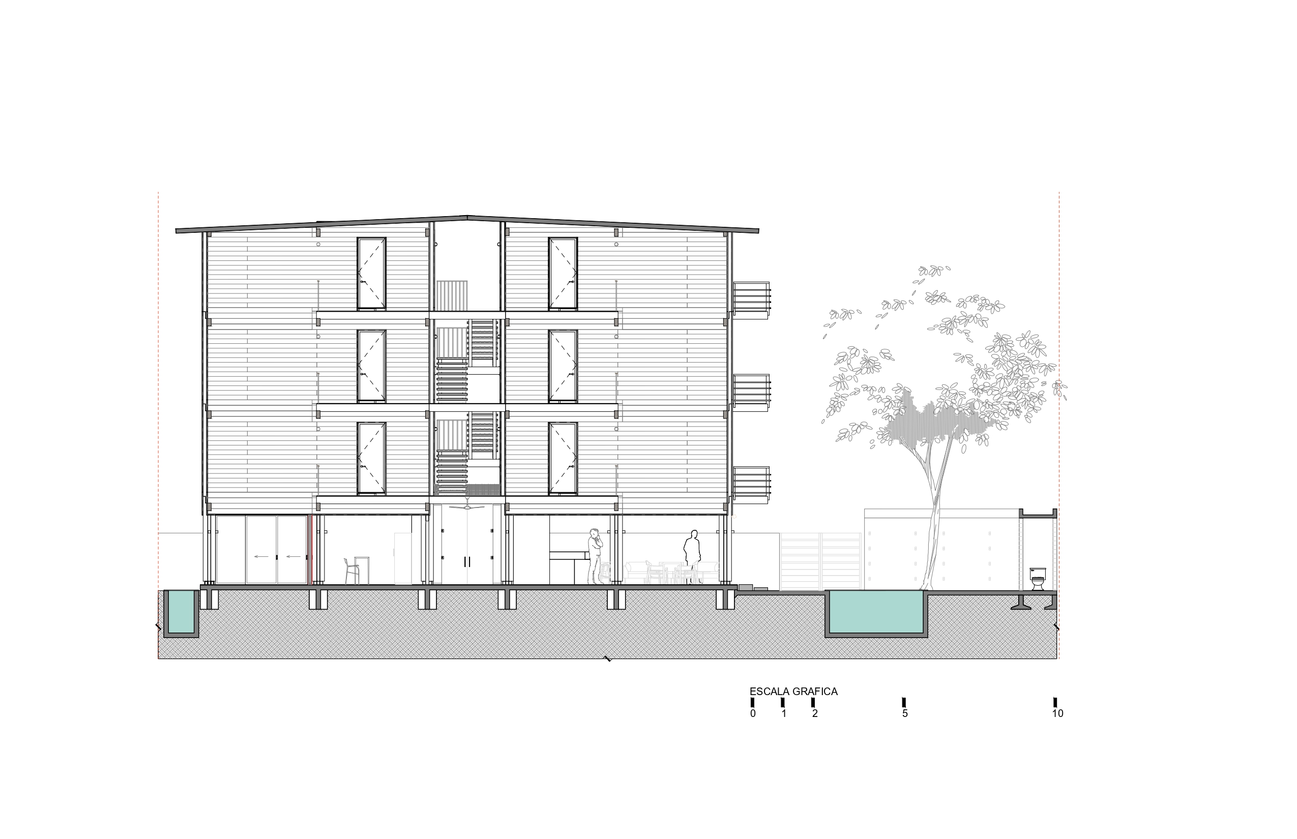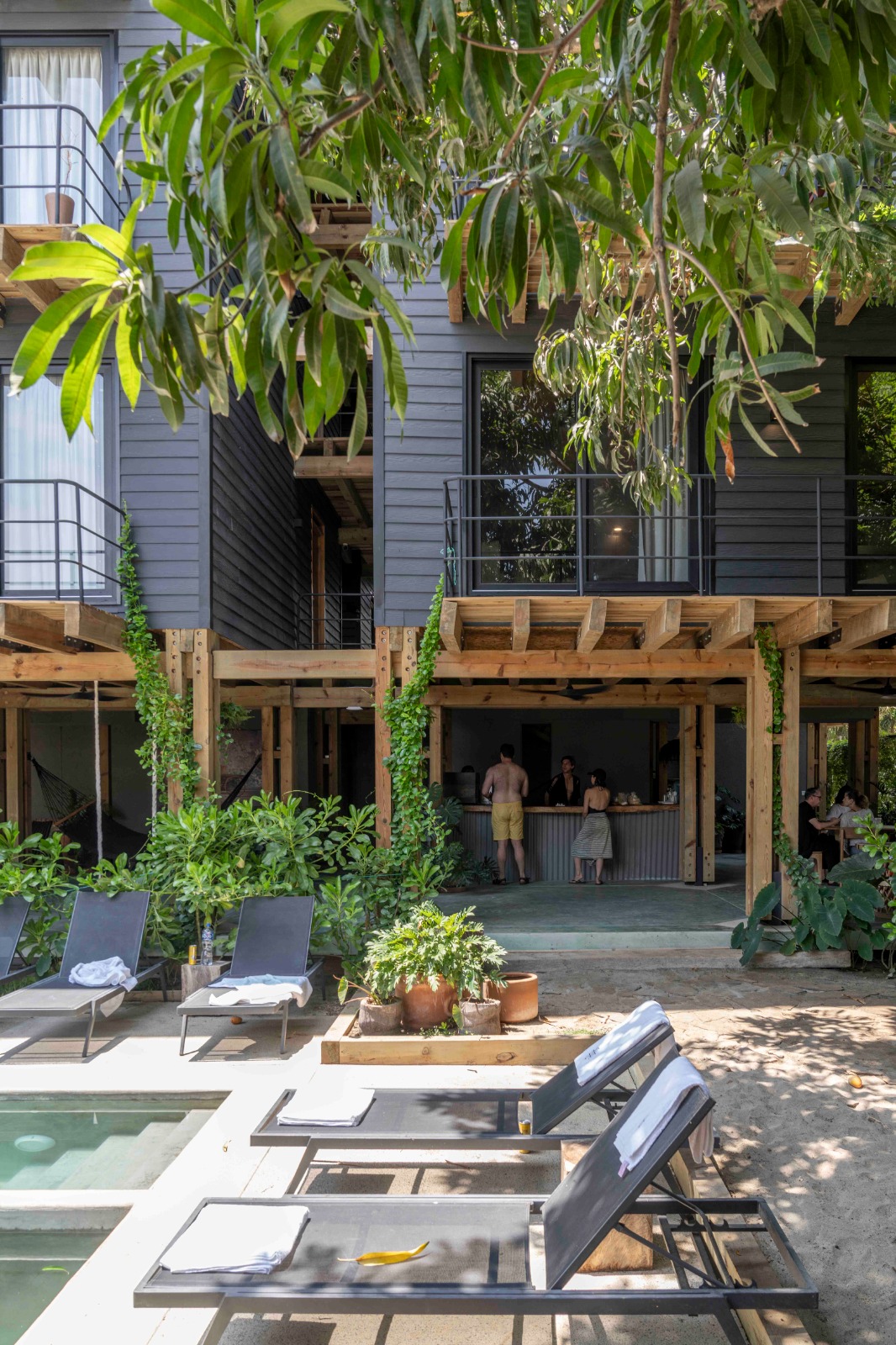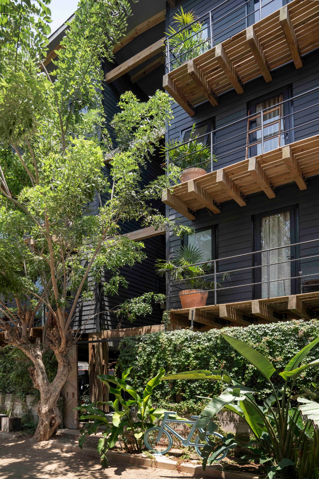 Uno de los aspectos clave del proyecto es su fuerte compromiso con la sostenibilidad. KINEKI La Punta incorpora sistemas de captación de agua pluvial, reciclaje y tratamiento de aguas, así como un diseño de paisaje con especies nativas. Su fachada de fibrocemento negro con textura de madera evoca la técnica japonesa Shou Sugi Ban, aportando una estética orgánica y atemporal.
