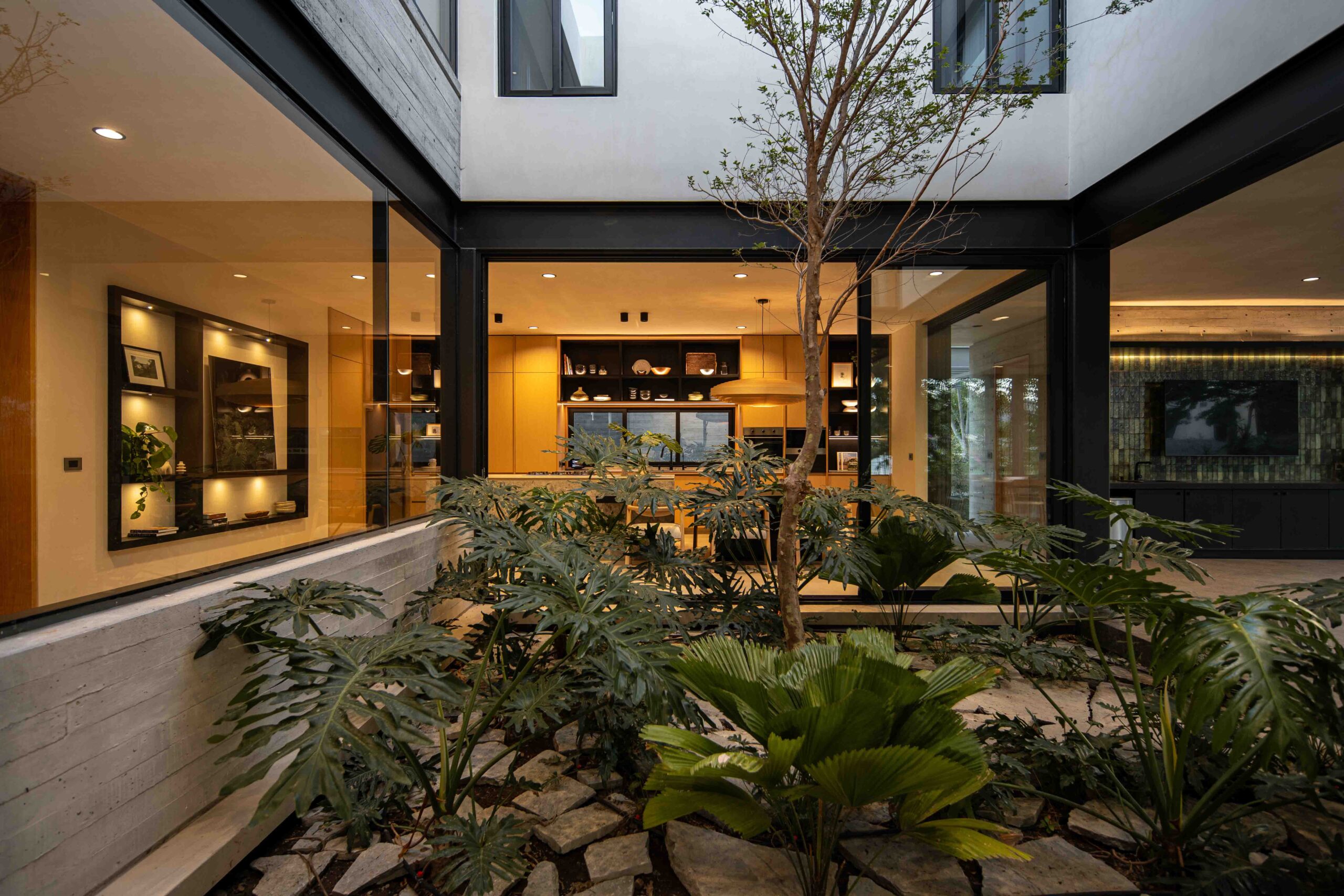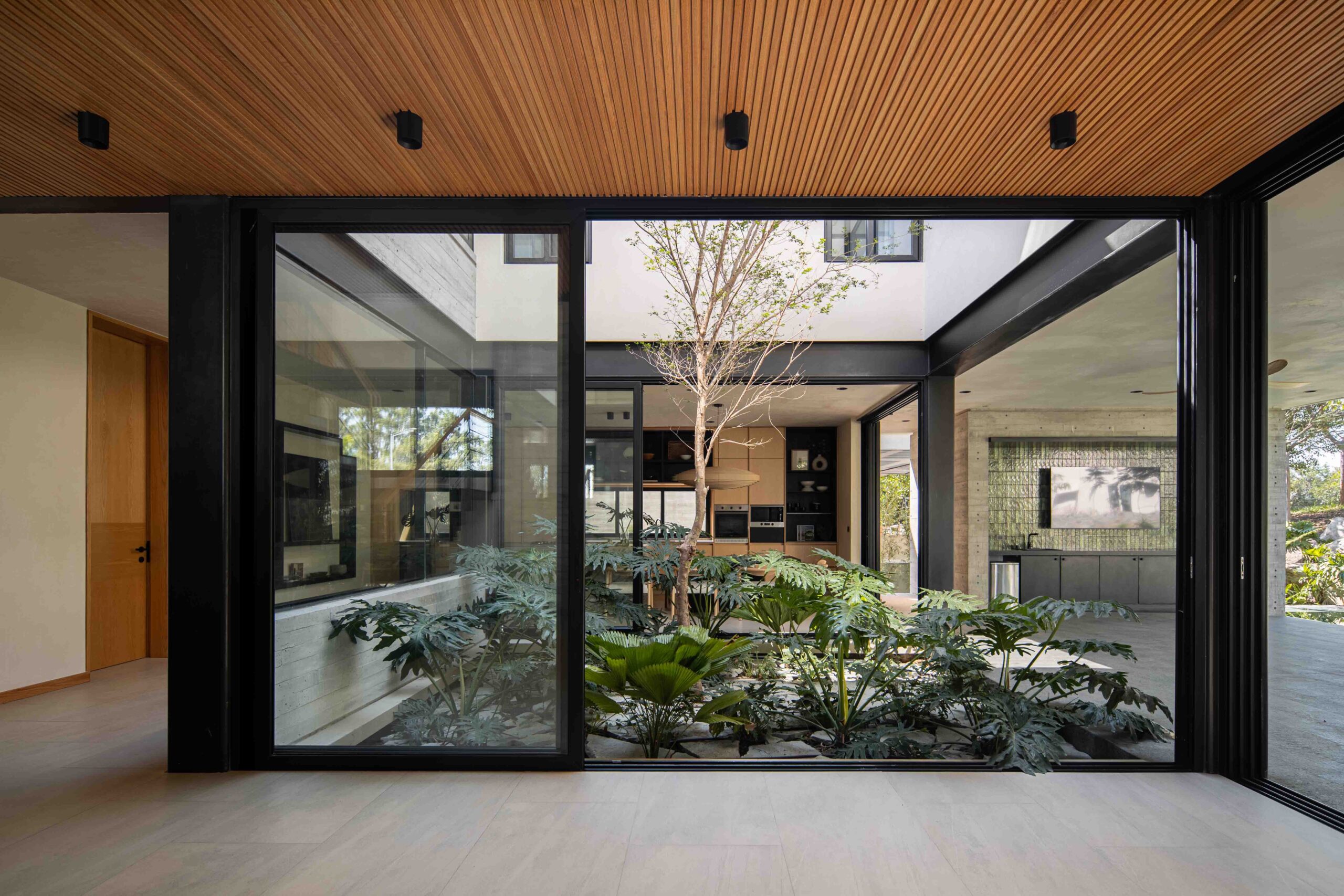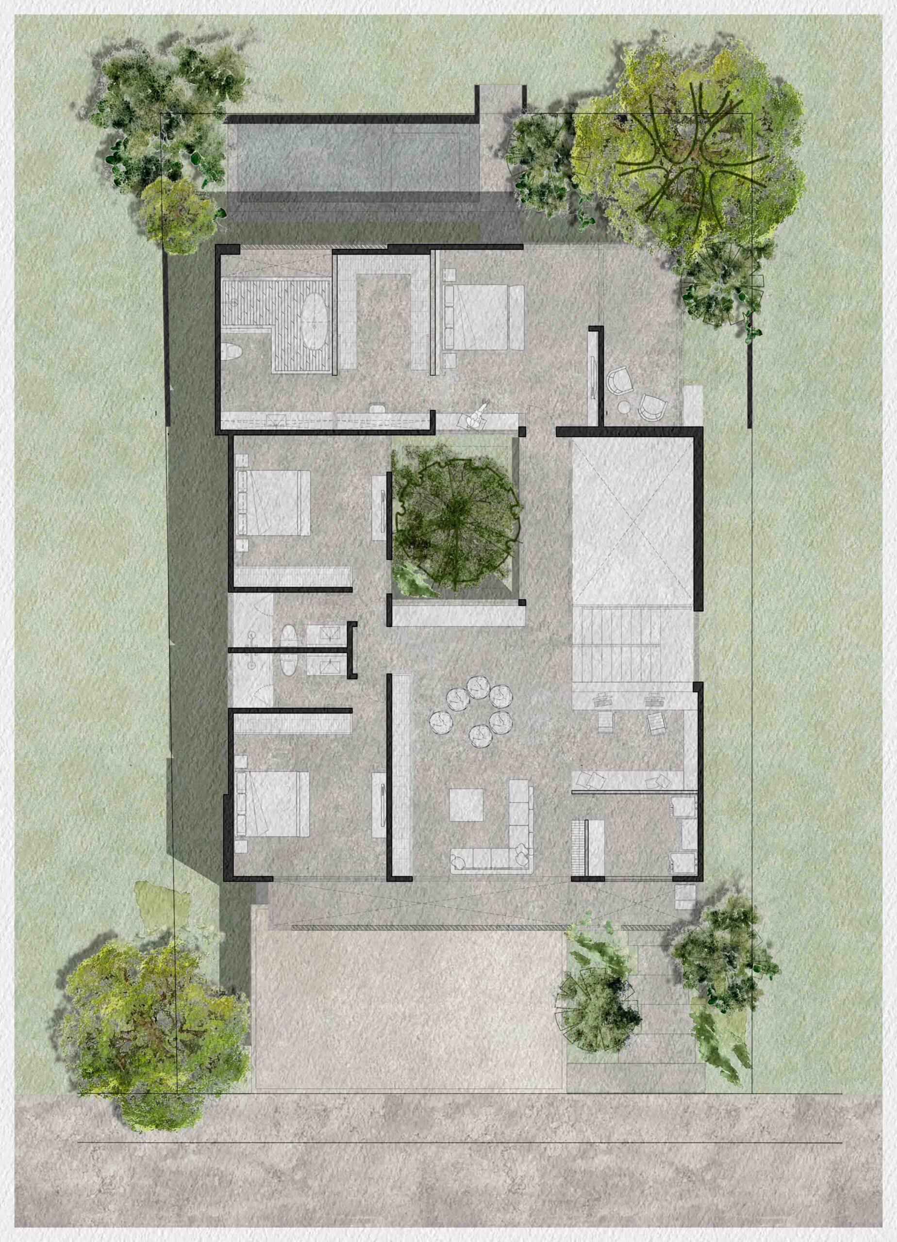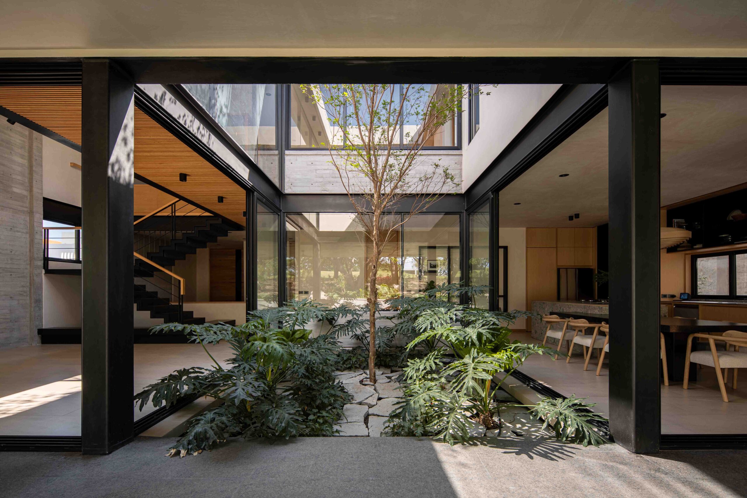 El corazón de la vivienda es un patio interior que ordena y conecta los espacios. Más que un vacío, es un umbral, un núcleo de luz y aire que permite que la casa respire, convirtiéndose en la tangente entre la arquitectura y el entorno natural. Su diseño está pensado para enriquecer la experiencia de quienes lo habitan: la luz cambia a lo largo del día, el viento se percibe entre las hojas y la lluvia deja su rastro en la piedra.