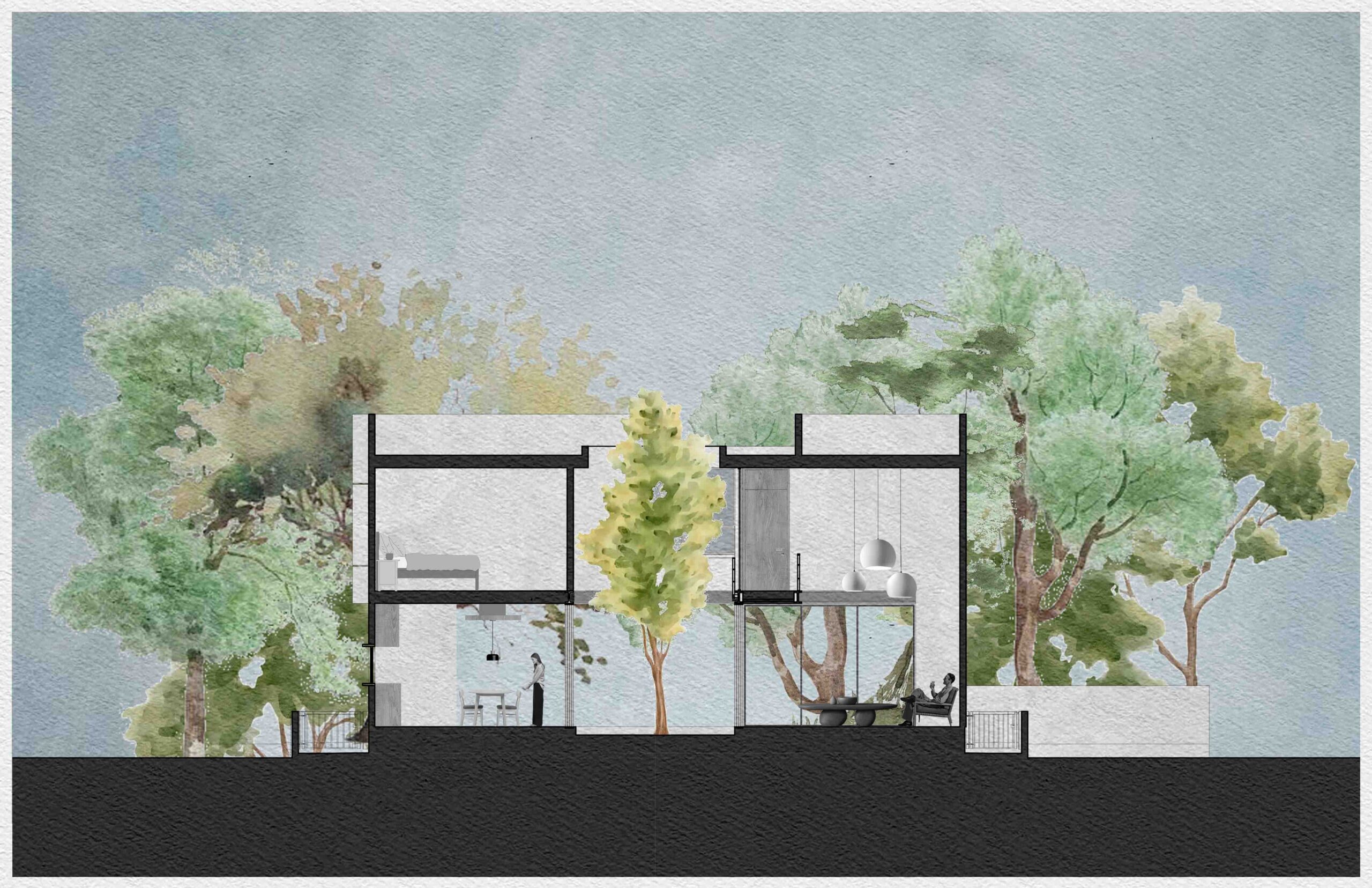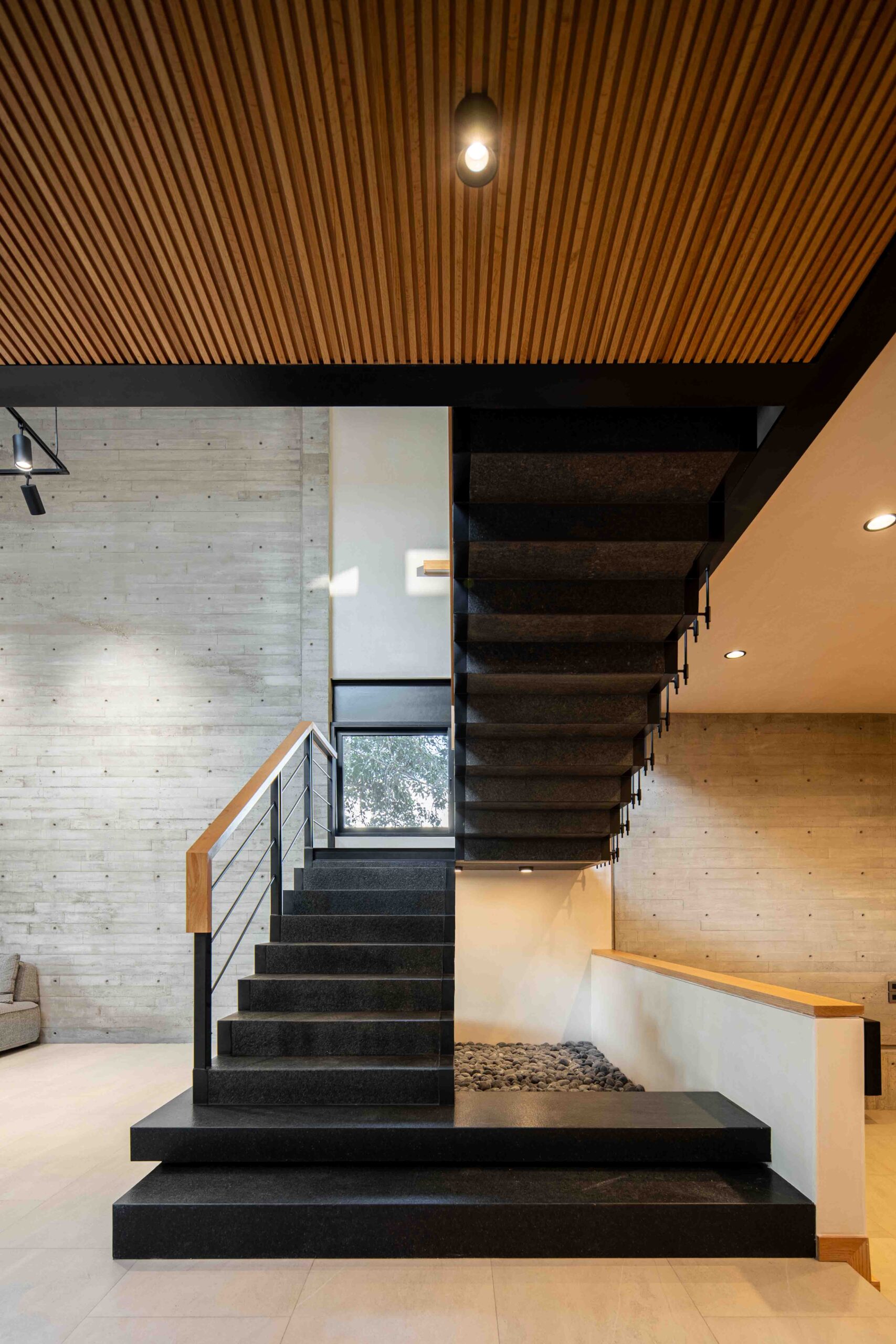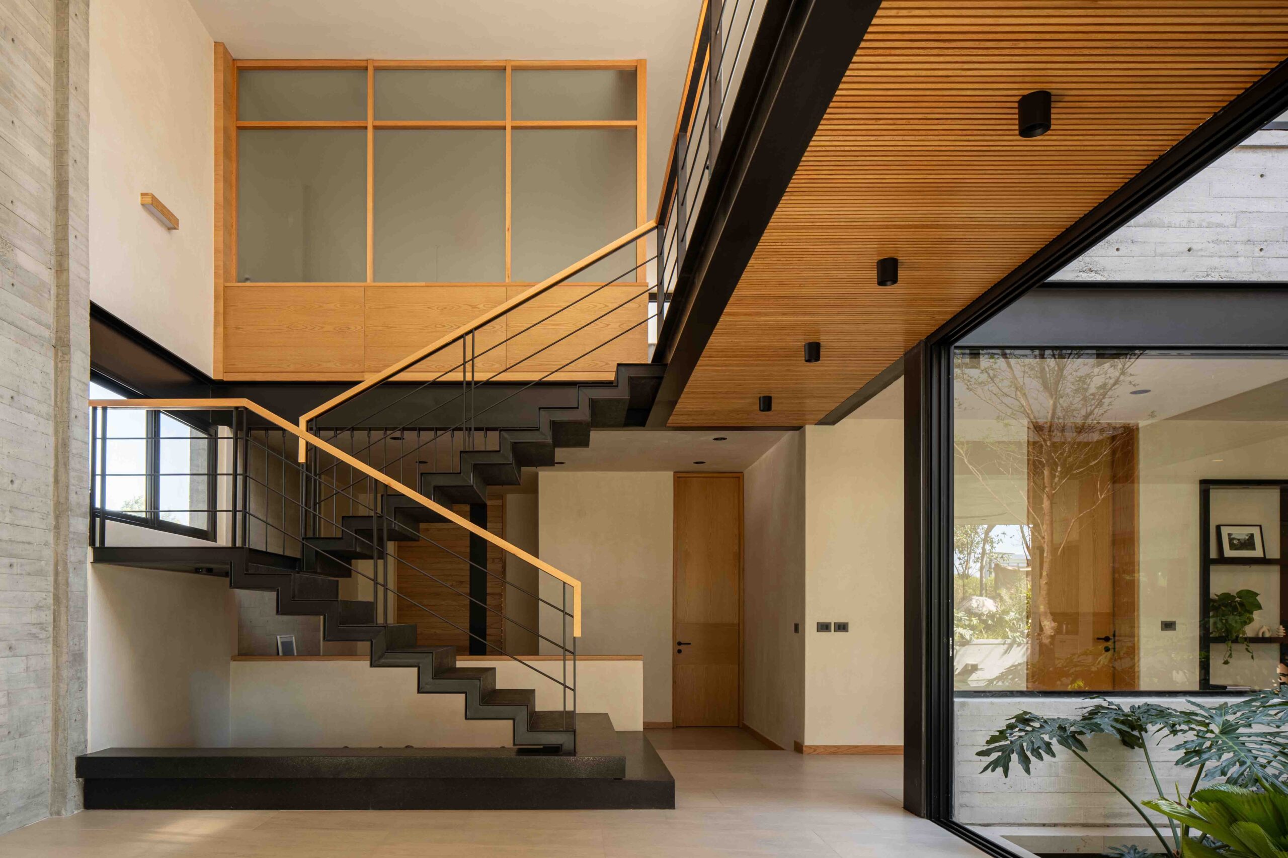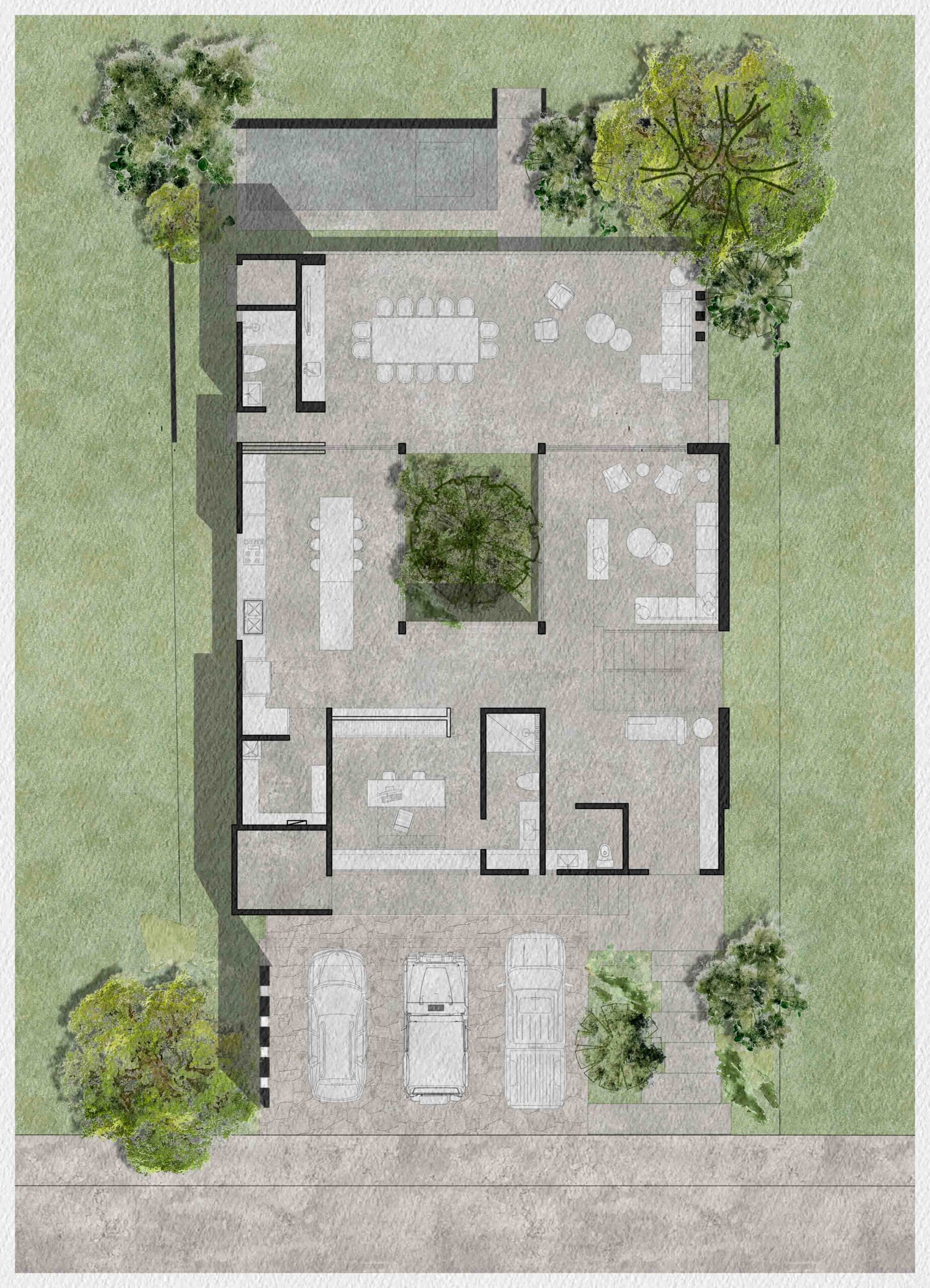 El corazón de la vivienda es un patio interior que ordena y conecta los espacios. Más que un vacío, es un umbral, un núcleo de luz y aire que permite que la casa respire, convirtiéndose en la tangente entre la arquitectura y el entorno natural. Su diseño está pensado para enriquecer la experiencia de quienes lo habitan: la luz cambia a lo largo del día, el viento se percibe entre las hojas y la lluvia deja su rastro en la piedra.