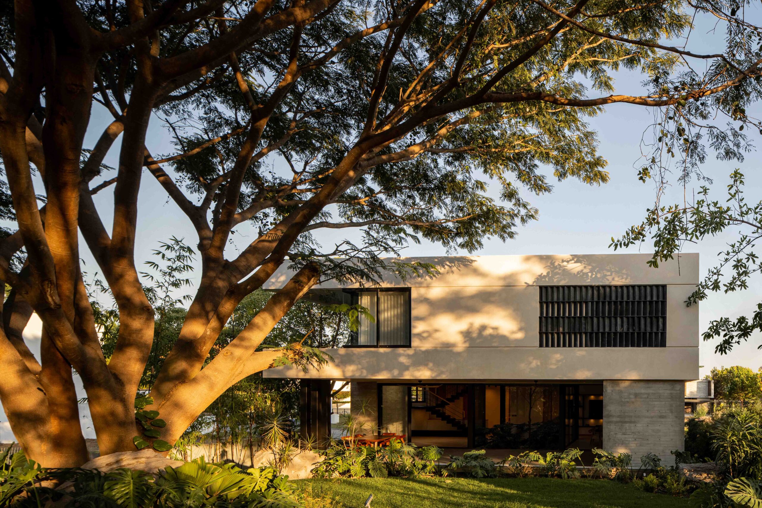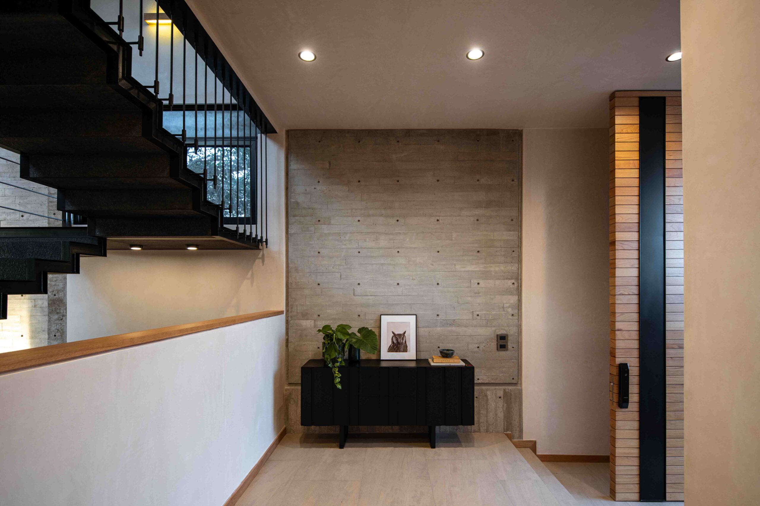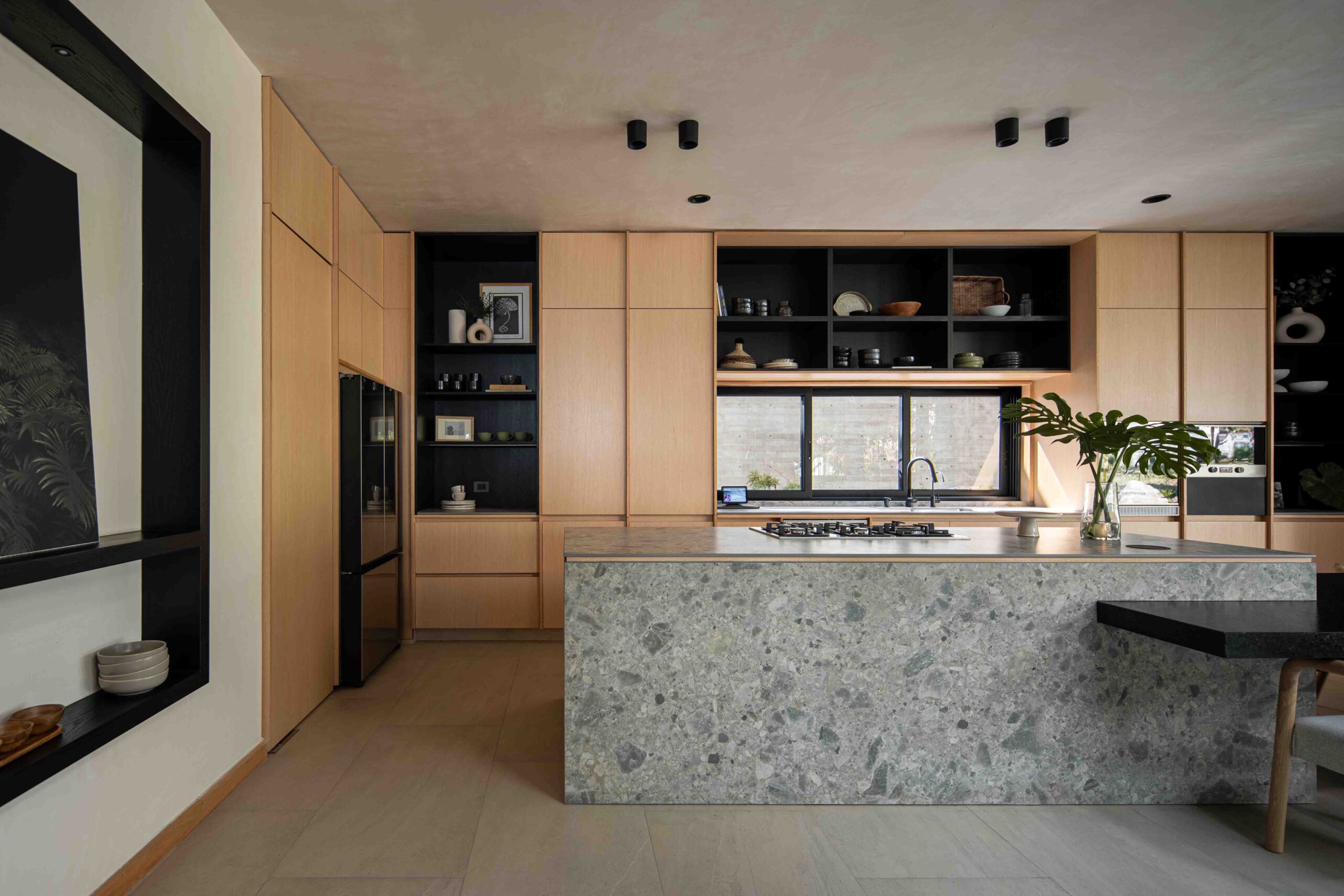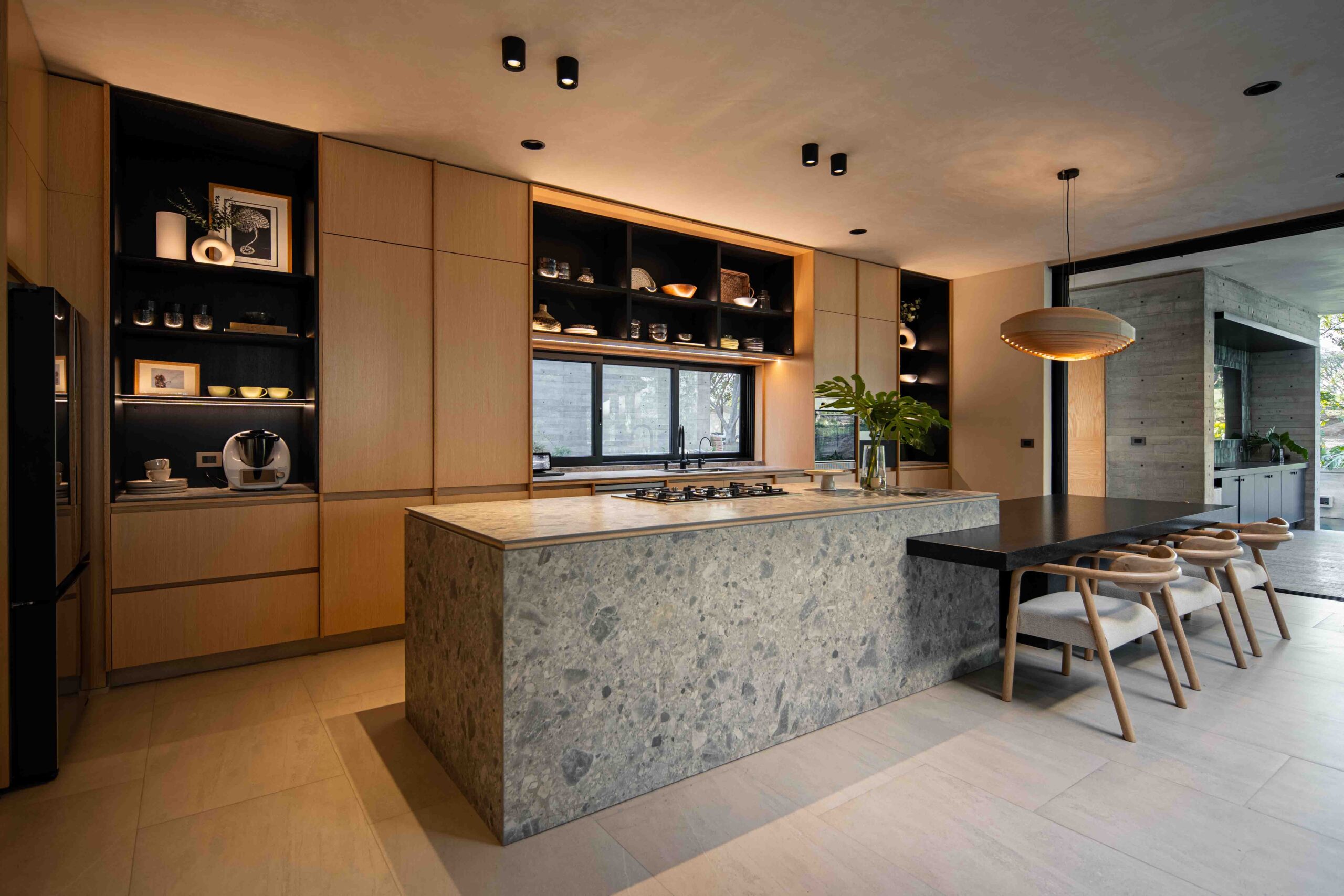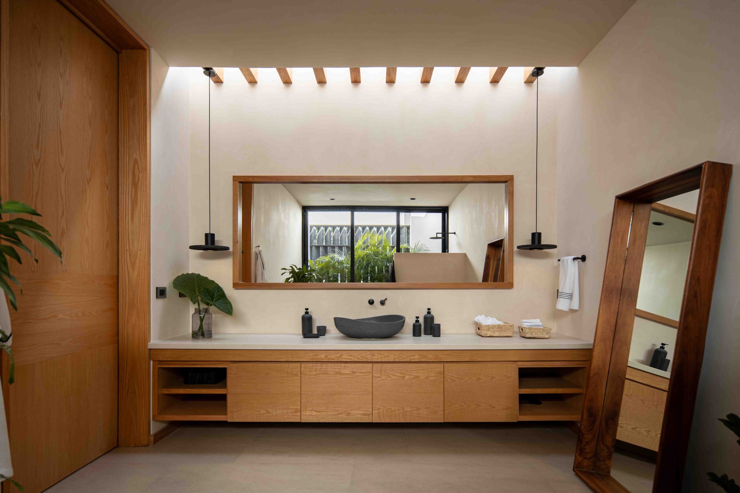 Los acabados no buscan imponerse, sino integrarse con la textura del paisaje, dialogando con la naturaleza sin competir con ella. La madera clara, la piedra natural, el concreto aparente y el chukum establecen una conversación de tonalidades y sensaciones que evocan lo orgánico, lo perdurable, lo esencial. Cada material, con su pátina y su peso, habla de la tierra, del paso del tiempo, de la vida que se despliega en el habitar cotidiano. Envejecerán con la casa, transformándose con ella, en un proceso continuo de cambio y permanencia.
