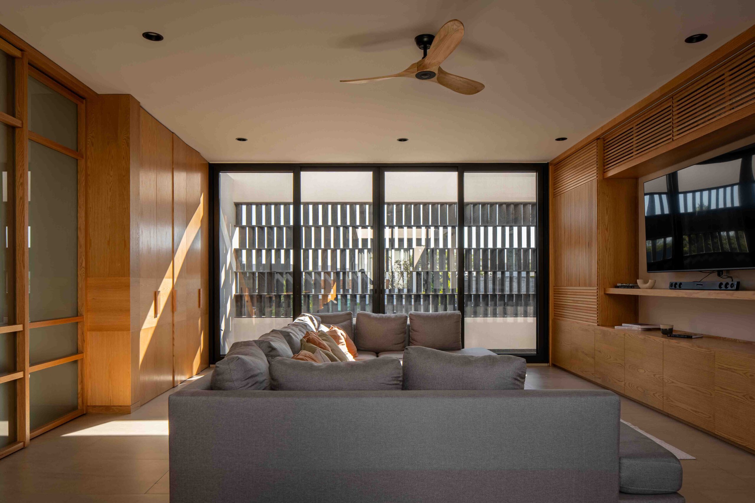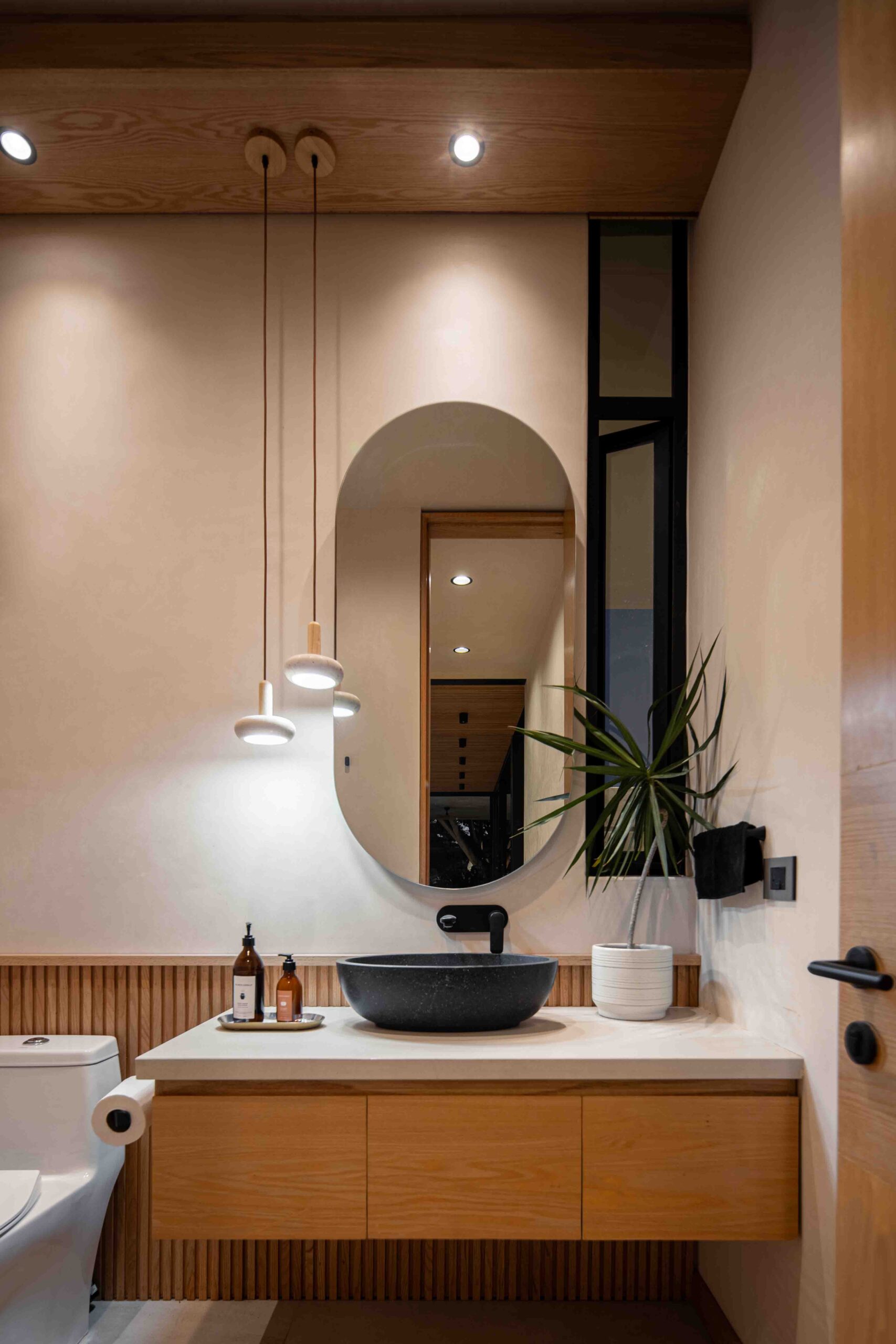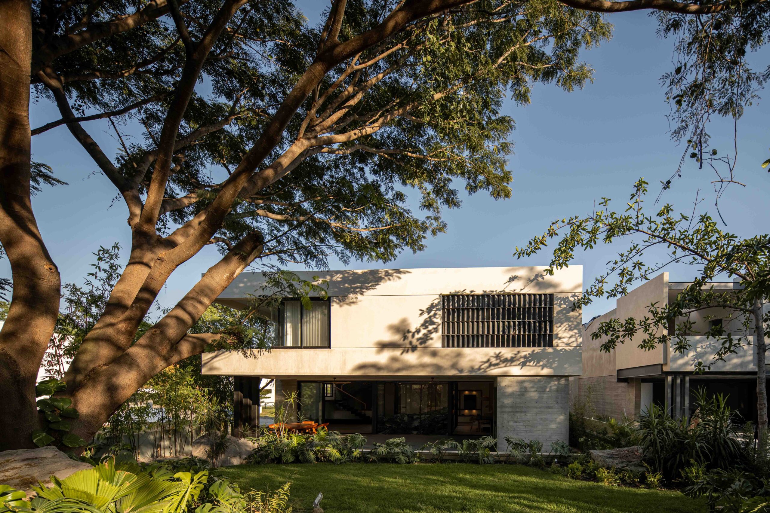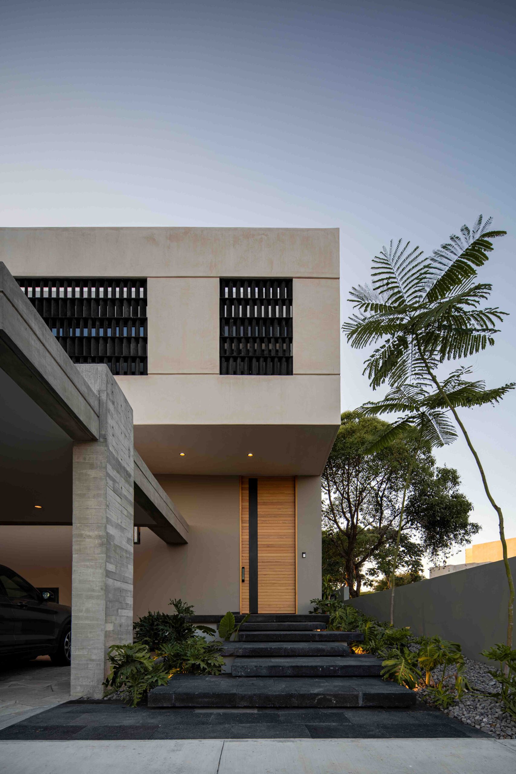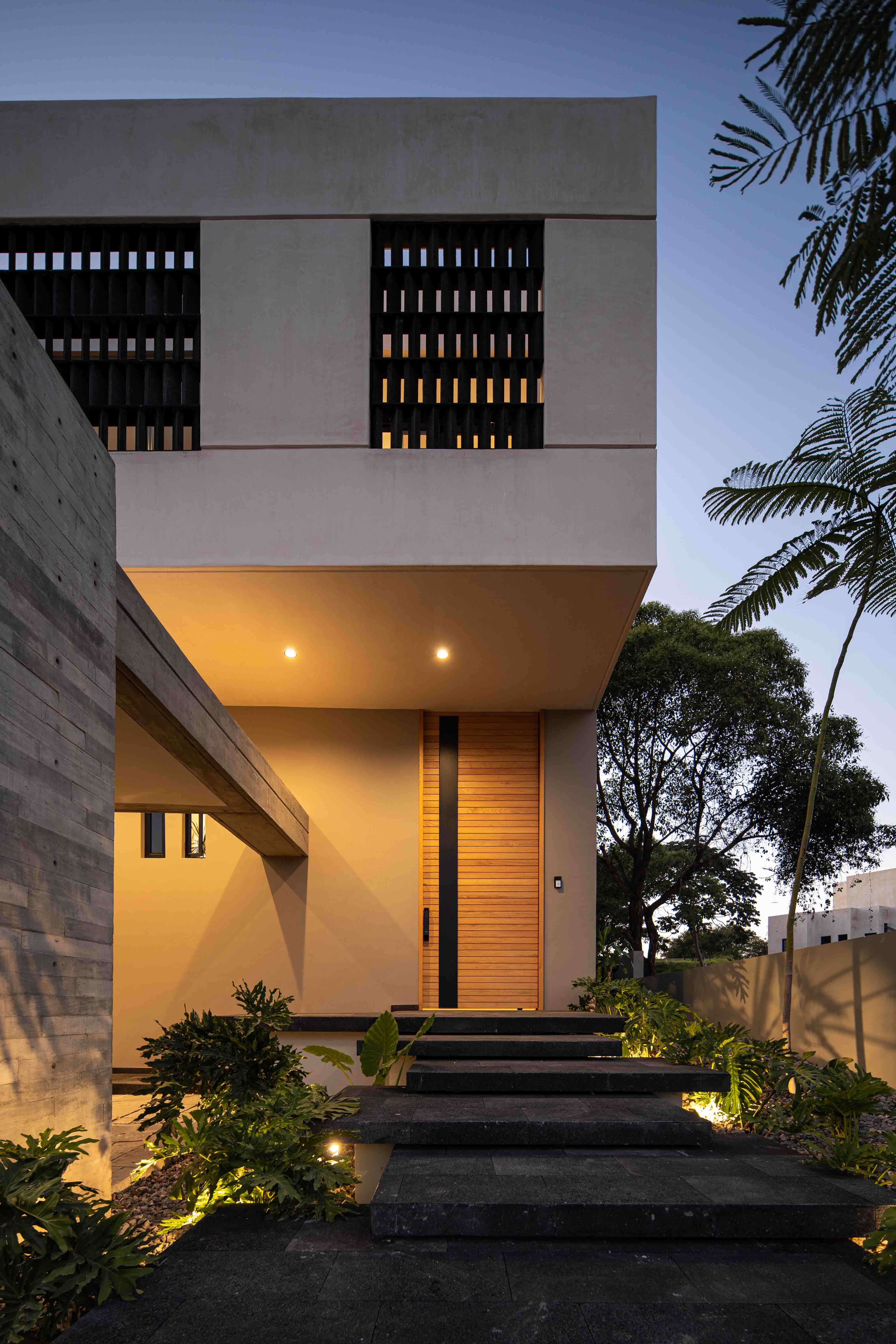 Los acabados no buscan imponerse, sino integrarse con la textura del paisaje, dialogando con la naturaleza sin competir con ella. La madera clara, la piedra natural, el concreto aparente y el chukum establecen una conversación de tonalidades y sensaciones que evocan lo orgánico, lo perdurable, lo esencial. Cada material, con su pátina y su peso, habla de la tierra, del paso del tiempo, de la vida que se despliega en el habitar cotidiano. Envejecerán con la casa, transformándose con ella, en un proceso continuo de cambio y permanencia.