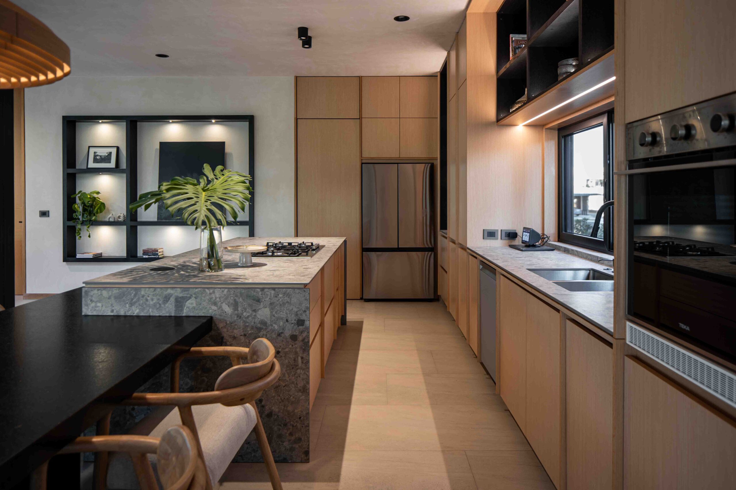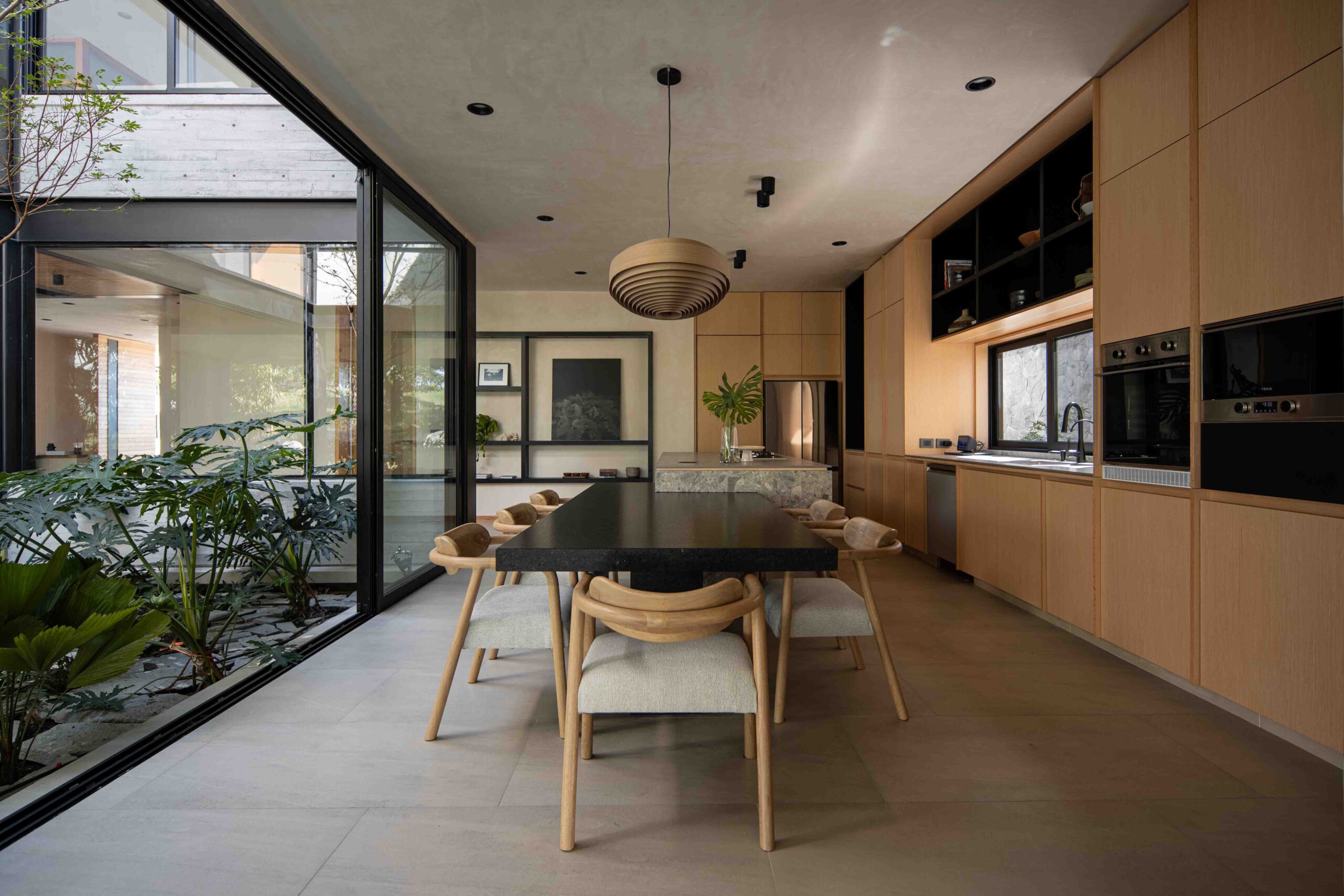 La cocina y el comedor se componen de tonalidades más neutras, incorporando mobiliario en colores negros y grises, con piezas en chapa de madera de nogal como contraste. La intención en estos espacios, es darle mayor importancia a la vista que se tiene hacia la terraza y el campo de golf, por medio de grandes ventanales a lo largo de estos espacios.