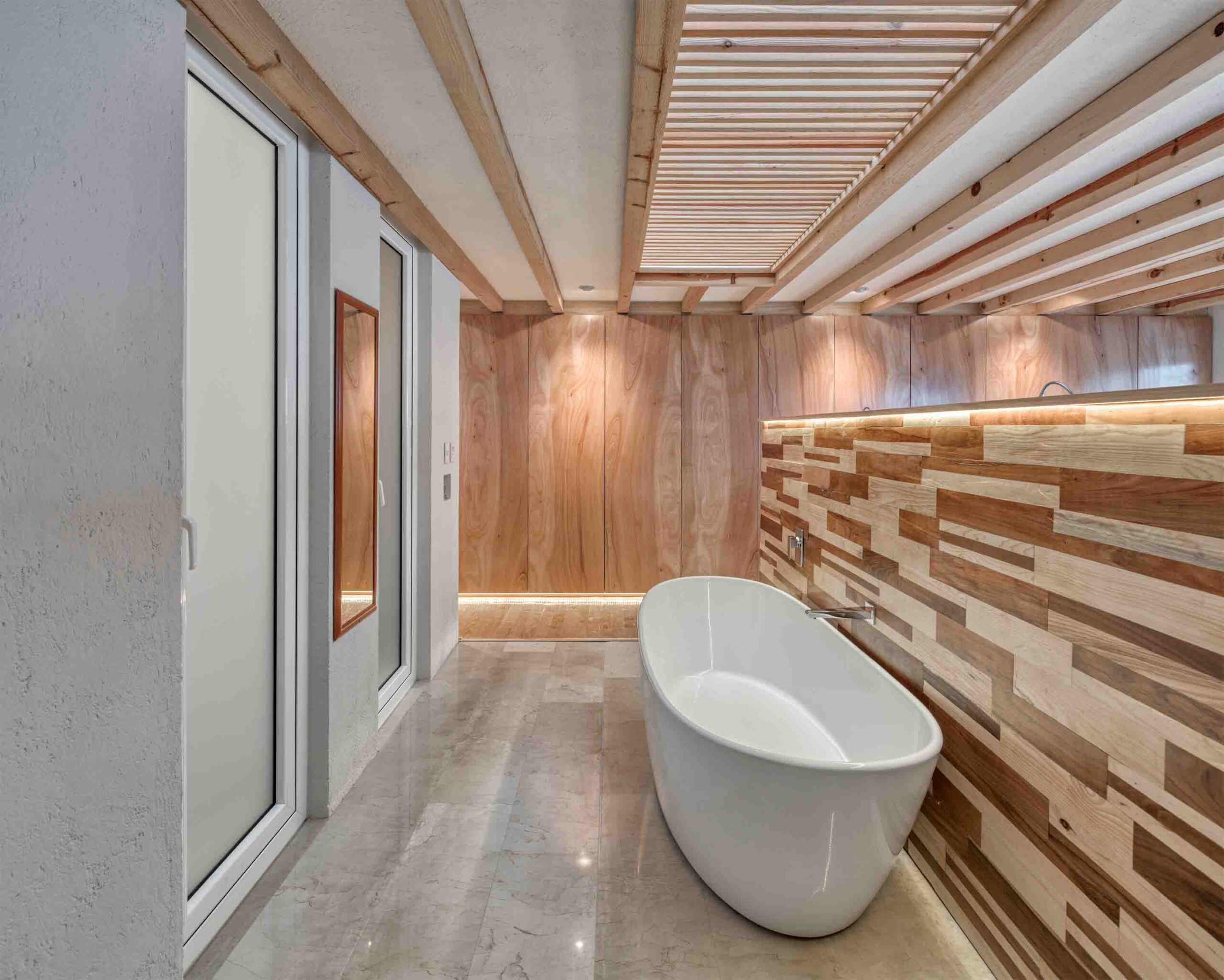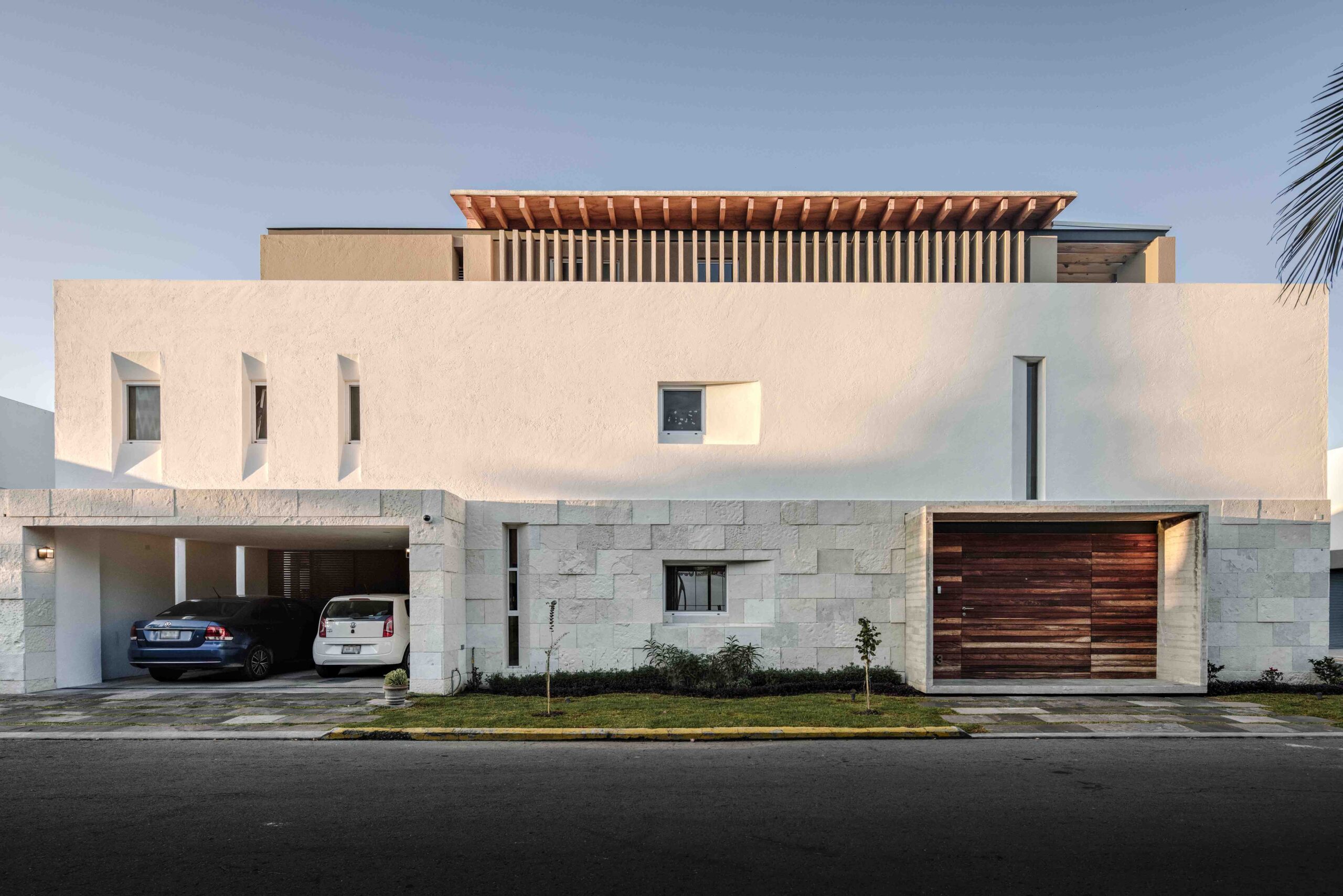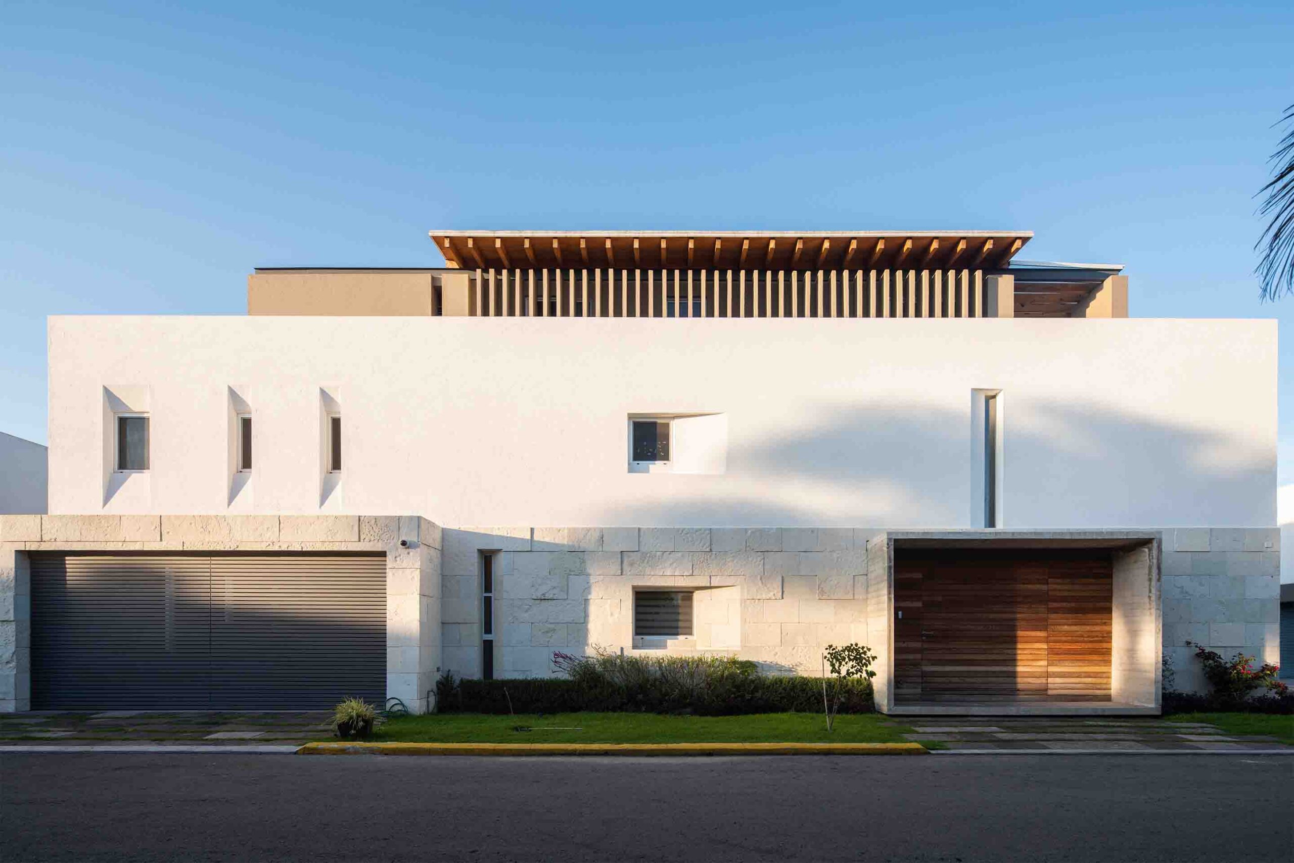 Las fachadas se conciben a partir de planteamientos clásicos (base, fuste y capitel). Se genera un basamento pétreo con un marco de concreto aparente y una cálida puerta de madera tipo tzalam. El siguiente nivel presenta un acabado rústico en color blanco, mientras que el remate incluye colores cálidos y cartelas con viguerías de madera.