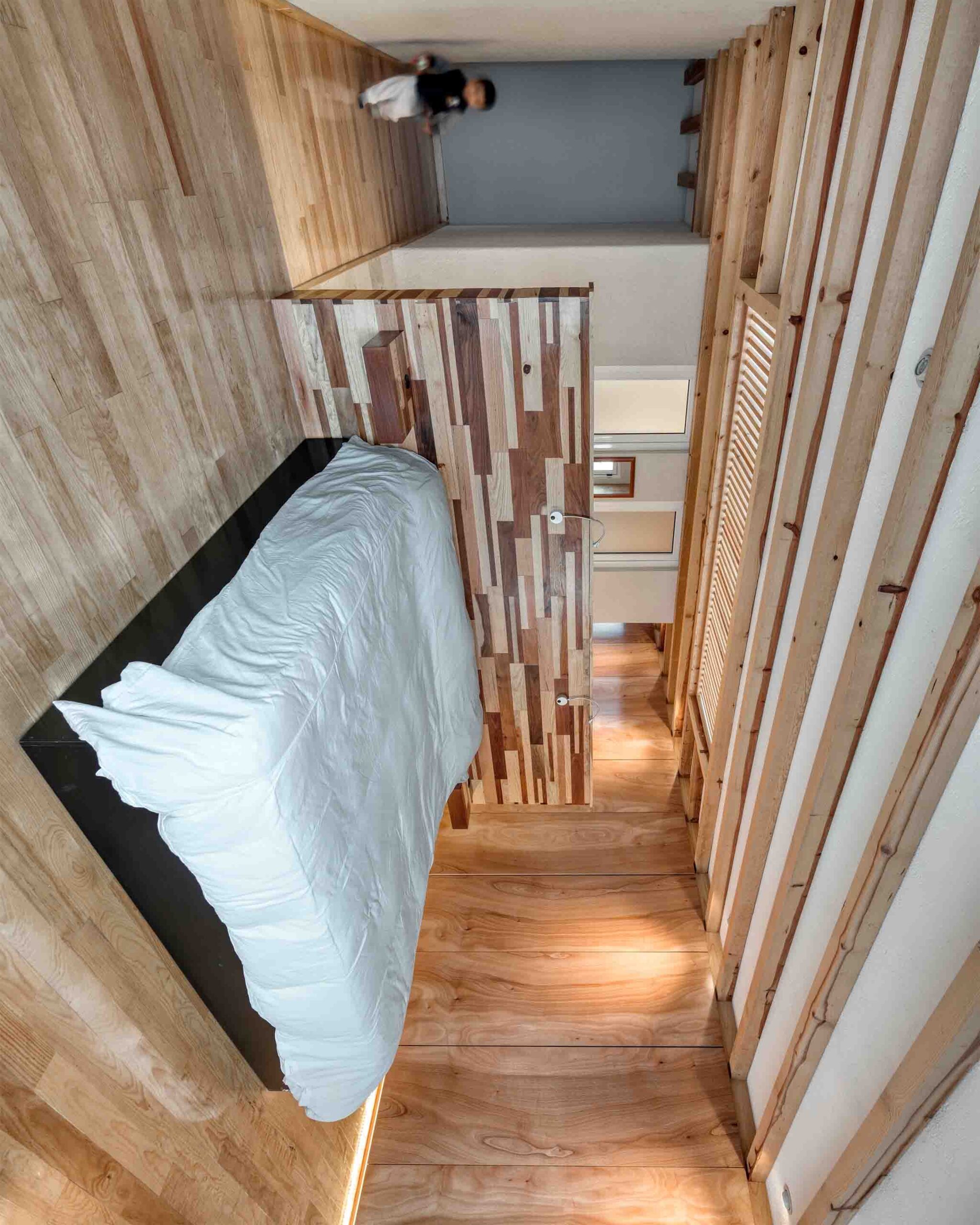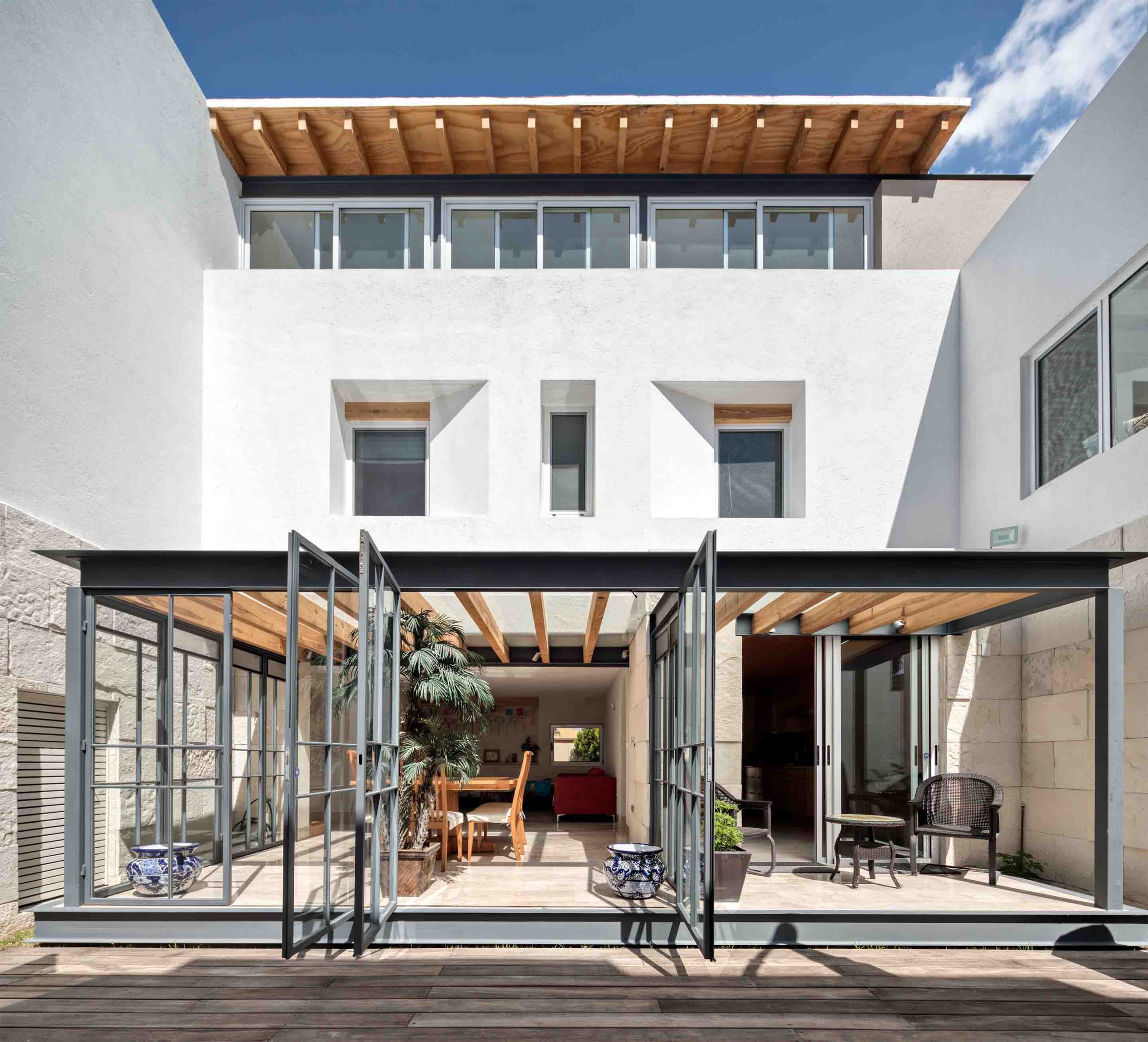 La secuencia espacial se organiza en forma de cruz que atraviesa esta ‘caja de zapatos’. En la planta baja se resuelve todo el programa público y de servicio; en el primer nivel se ubican los dormitorios, y en el último nivel se disponen una sala de TV y una terraza desde donde se aprecian los volcanes, así como un oratorio.