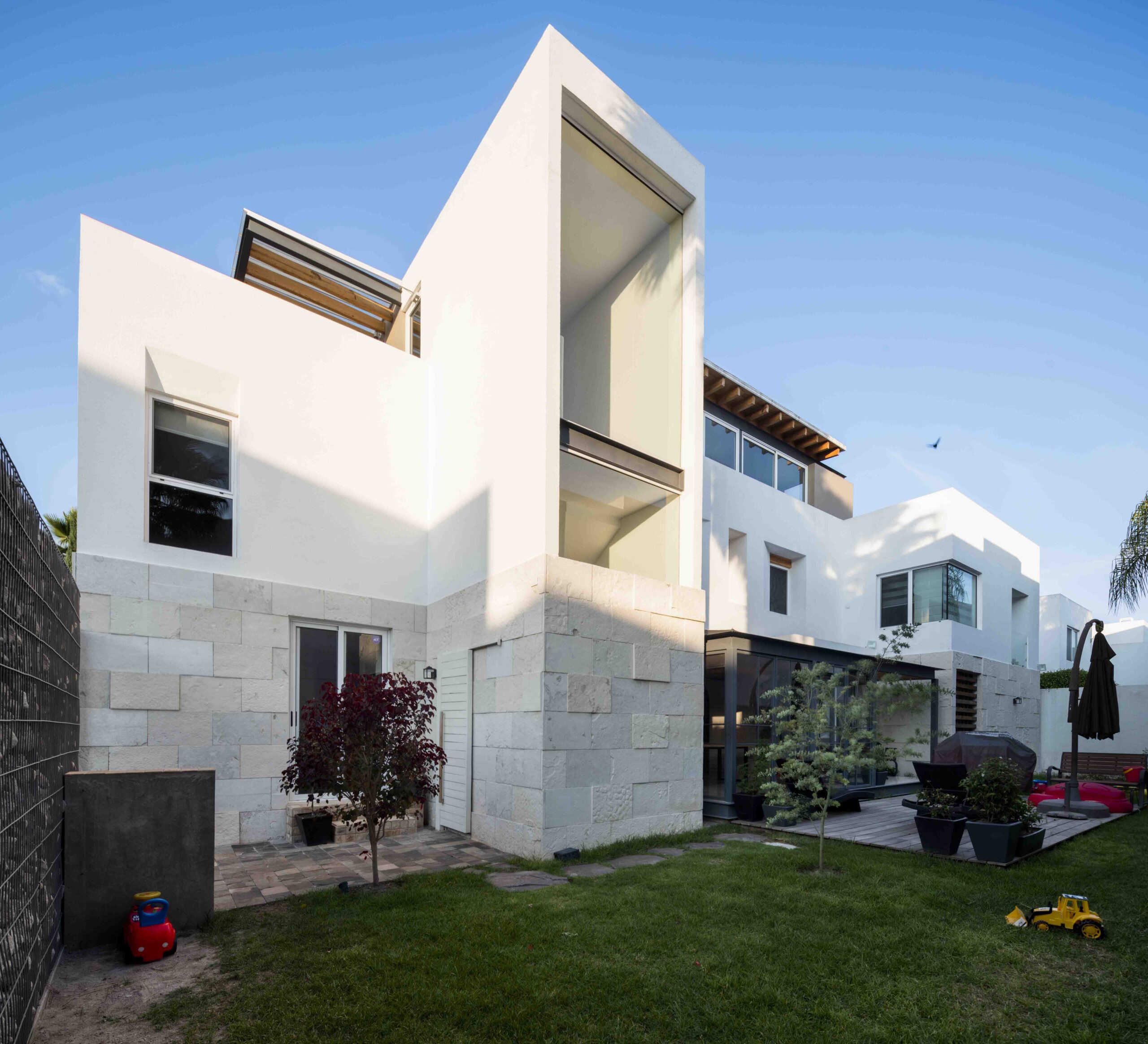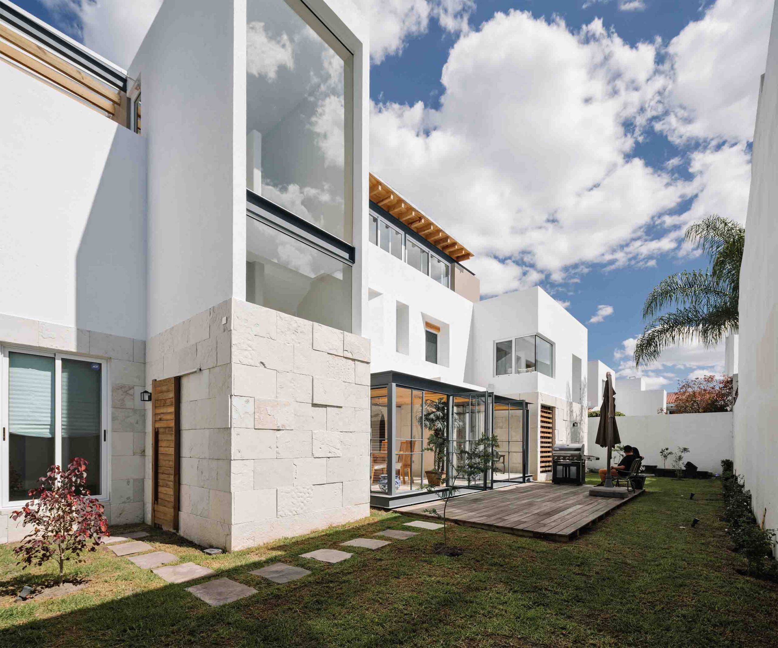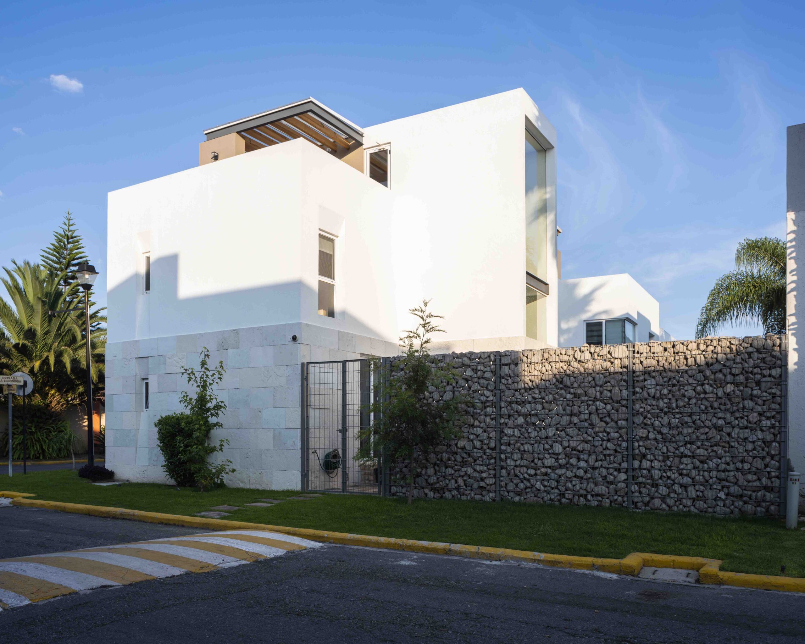 El esquema consiste en un único volumen que agrupa todo el programa y parece flotar sobre el predio de 400 m2. Este volumen se libera de la colindancia sur para generar un jardín que inunda de verde y calor las habitaciones en todos los niveles, integrándose de manera discreta, callada pero empática a la escala peatonal. Además, respeta las restricciones del condominio y genera espacios verdes que benefician al vecindario.