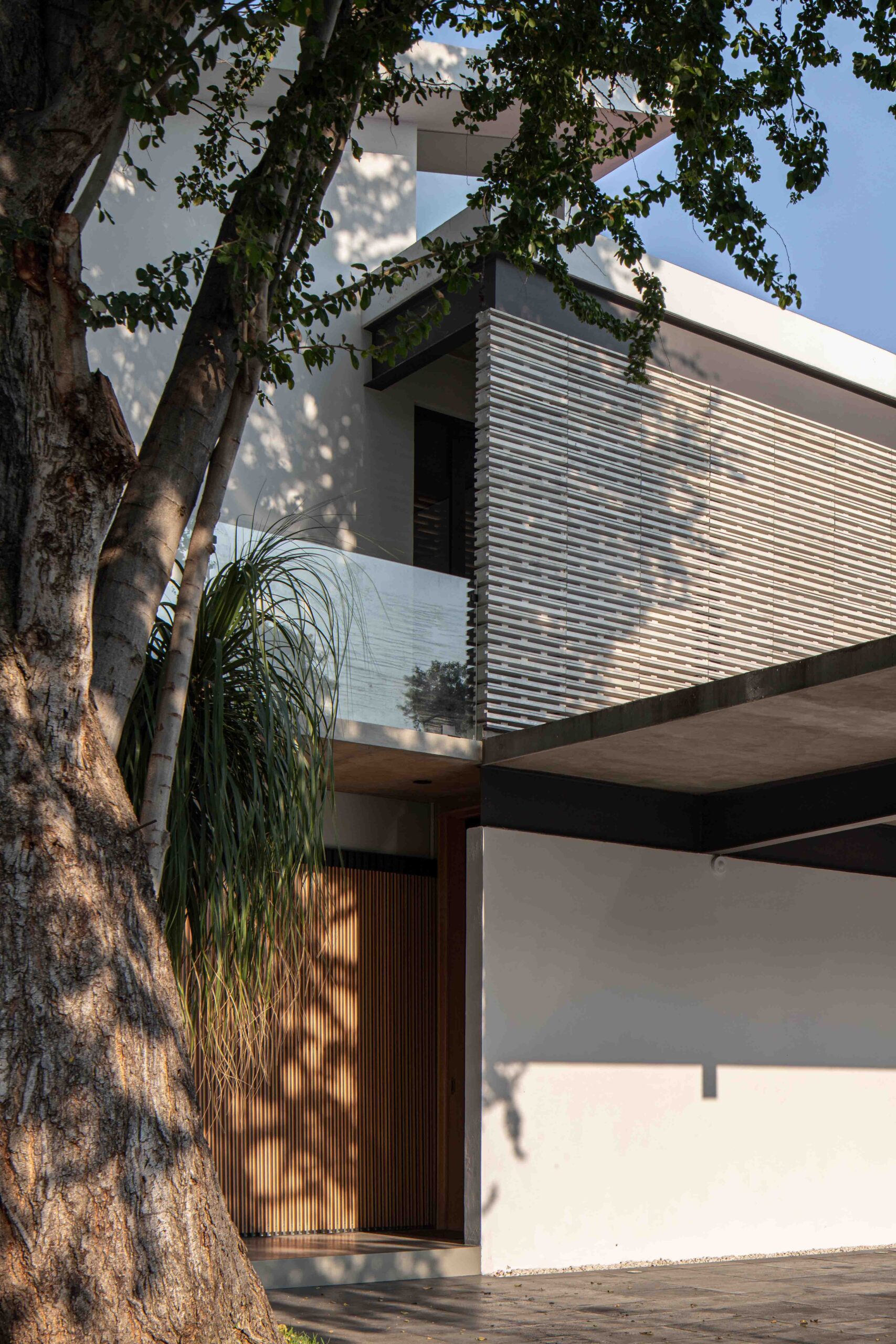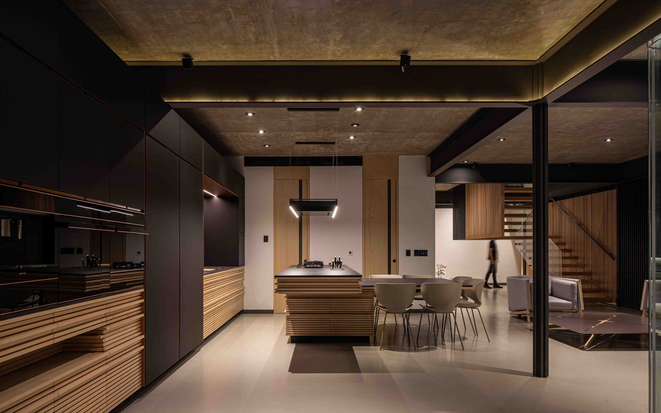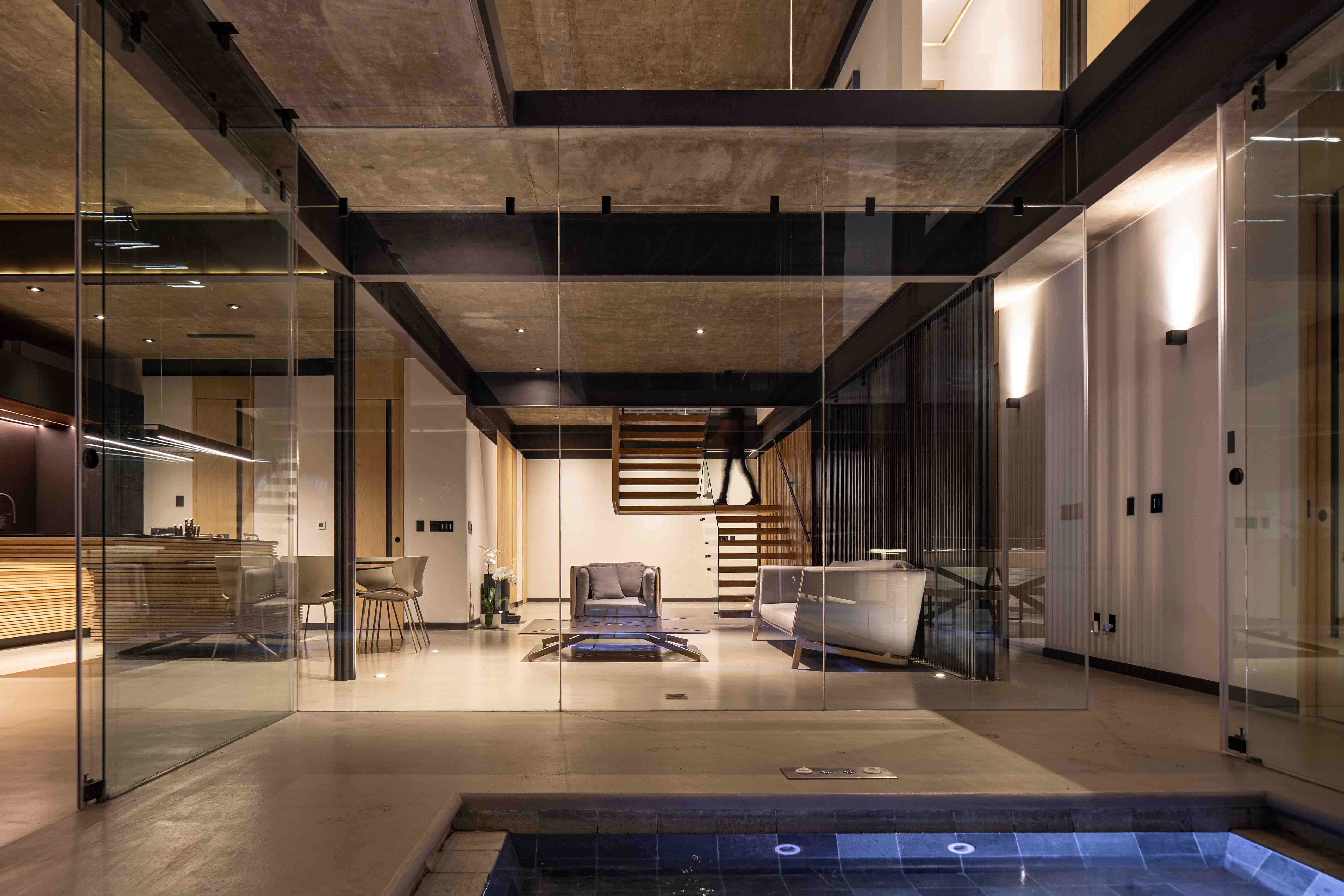 En planta baja, el ingreso se da a través de un vestíbulo central que jerarquiza el eje de circulación y enmarca la escalera principal, concebida como una pieza escultórica que articula la circulación vertical en ambos niveles y en sentido horizontal se integra a una celosía que divide esencialmente las recámaras de vistas con el área social. La cocina, de diseño abierto y elegante funcionalidad, se vincula directamente con el comedor y la sala, generando una continuidad espacial que desemboca en la terraza exterior y alberca. Grandes planos de cristal de piso a techo eliminan las barreras visuales entre interior y exterior, generando una percepción de transparencia y amplitud.