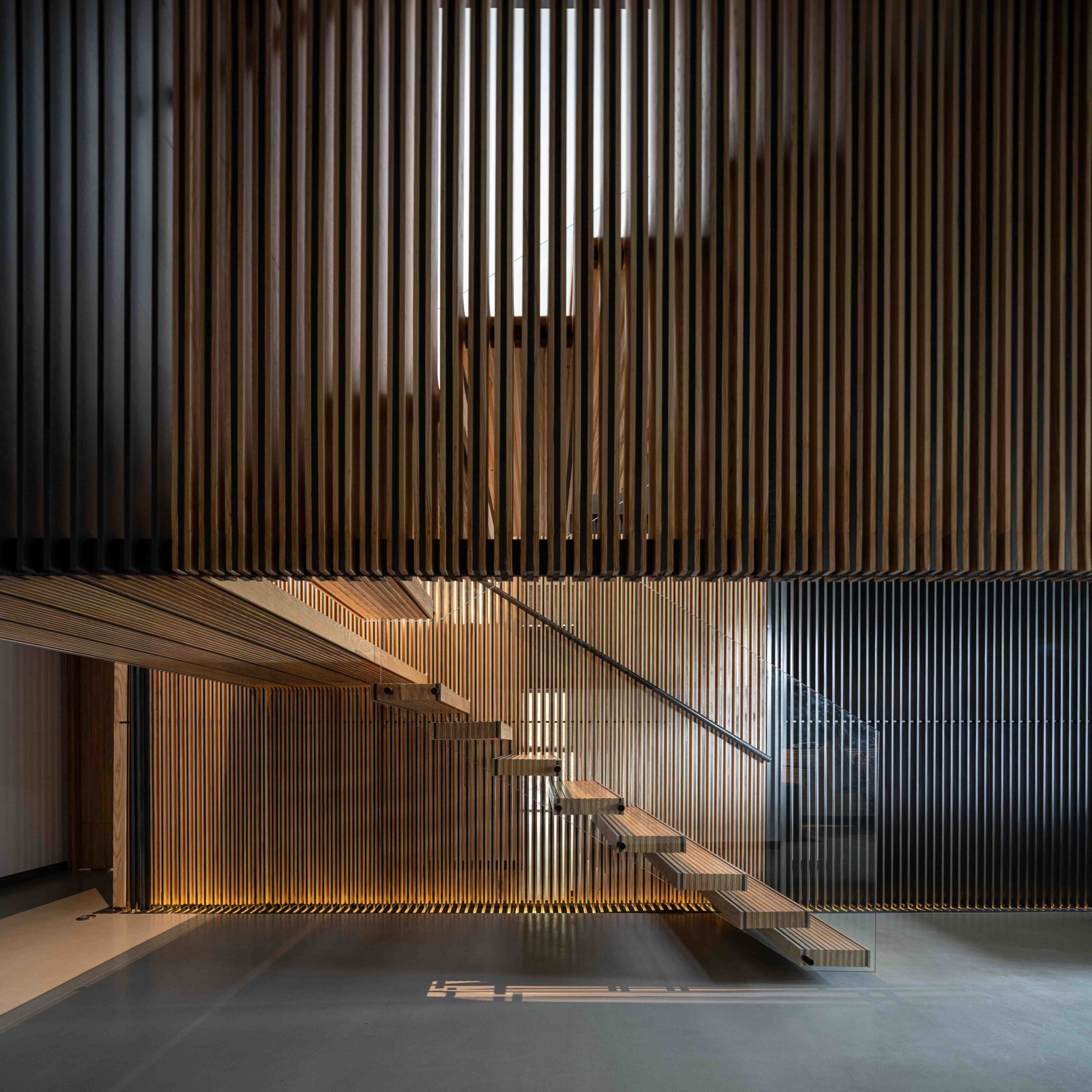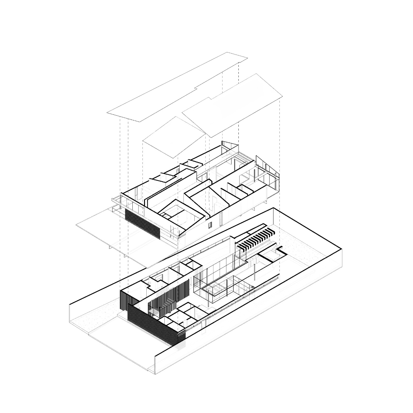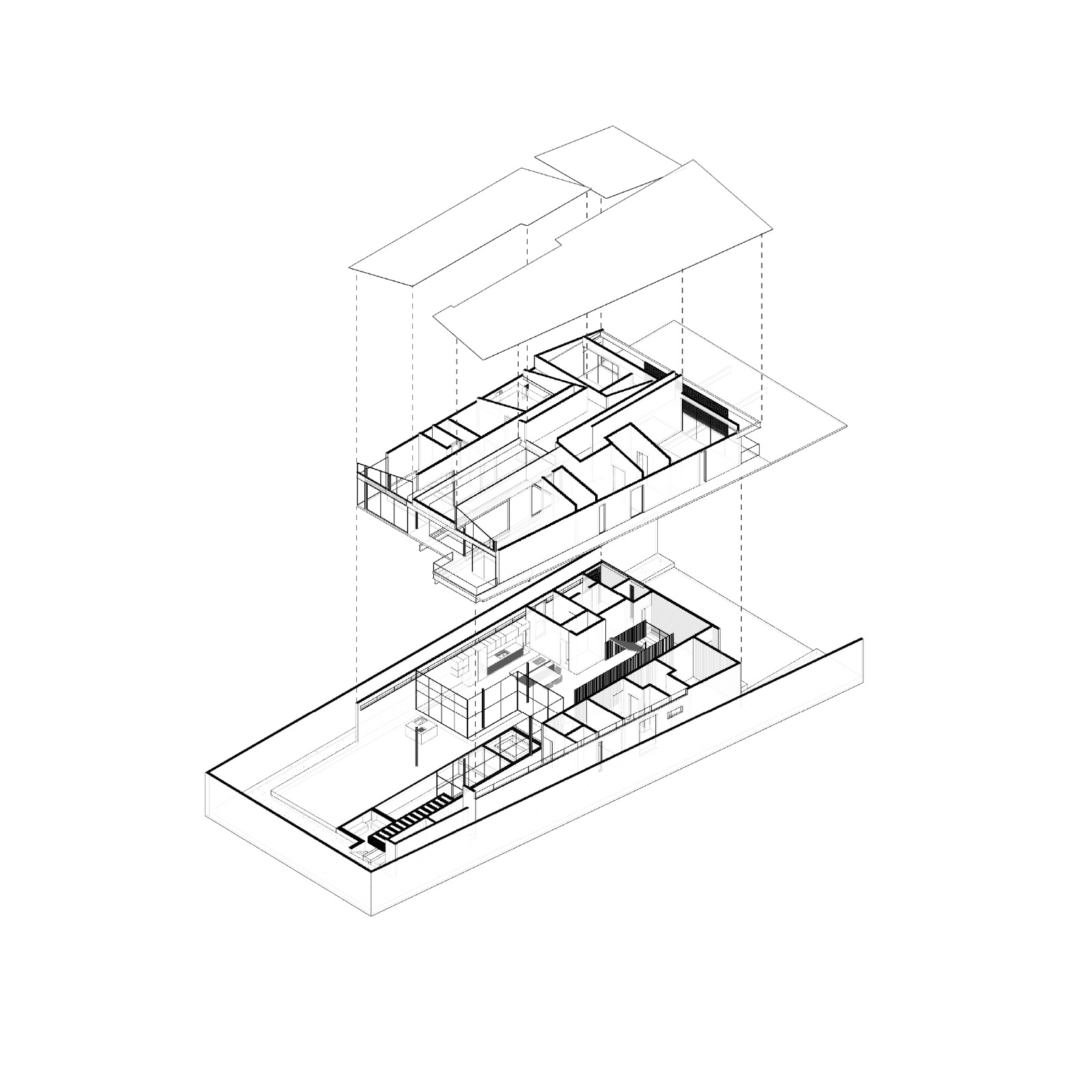 En planta baja, el ingreso se da a través de un vestíbulo central que jerarquiza el eje de circulación y enmarca la escalera principal, concebida como una pieza escultórica que articula la circulación vertical en ambos niveles y en sentido horizontal se integra a una celosía que divide esencialmente las recámaras de vistas con el área social. La cocina, de diseño abierto y elegante funcionalidad, se vincula directamente con el comedor y la sala, generando una continuidad espacial que desemboca en la terraza exterior y alberca. Grandes planos de cristal de piso a techo eliminan las barreras visuales entre interior y exterior, generando una percepción de transparencia y amplitud.