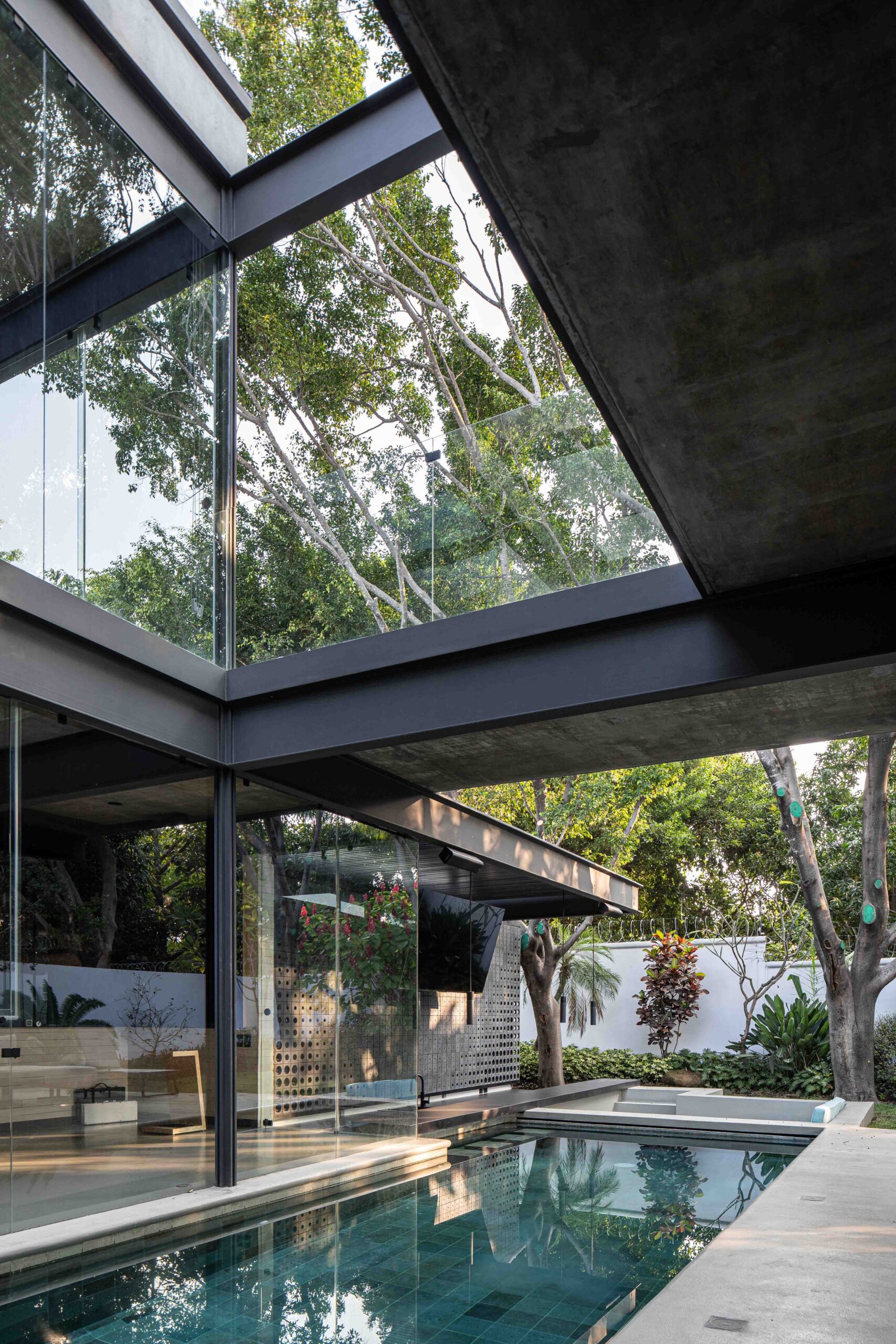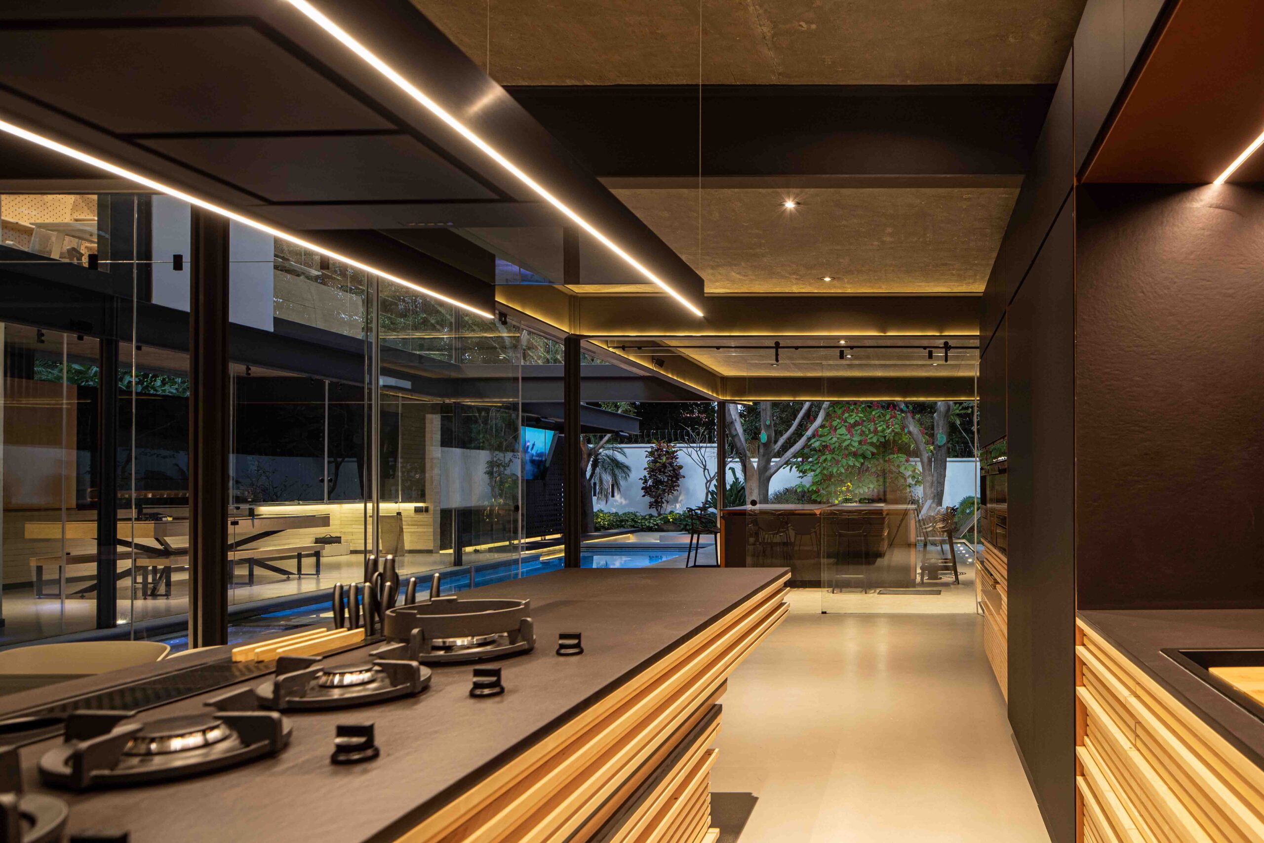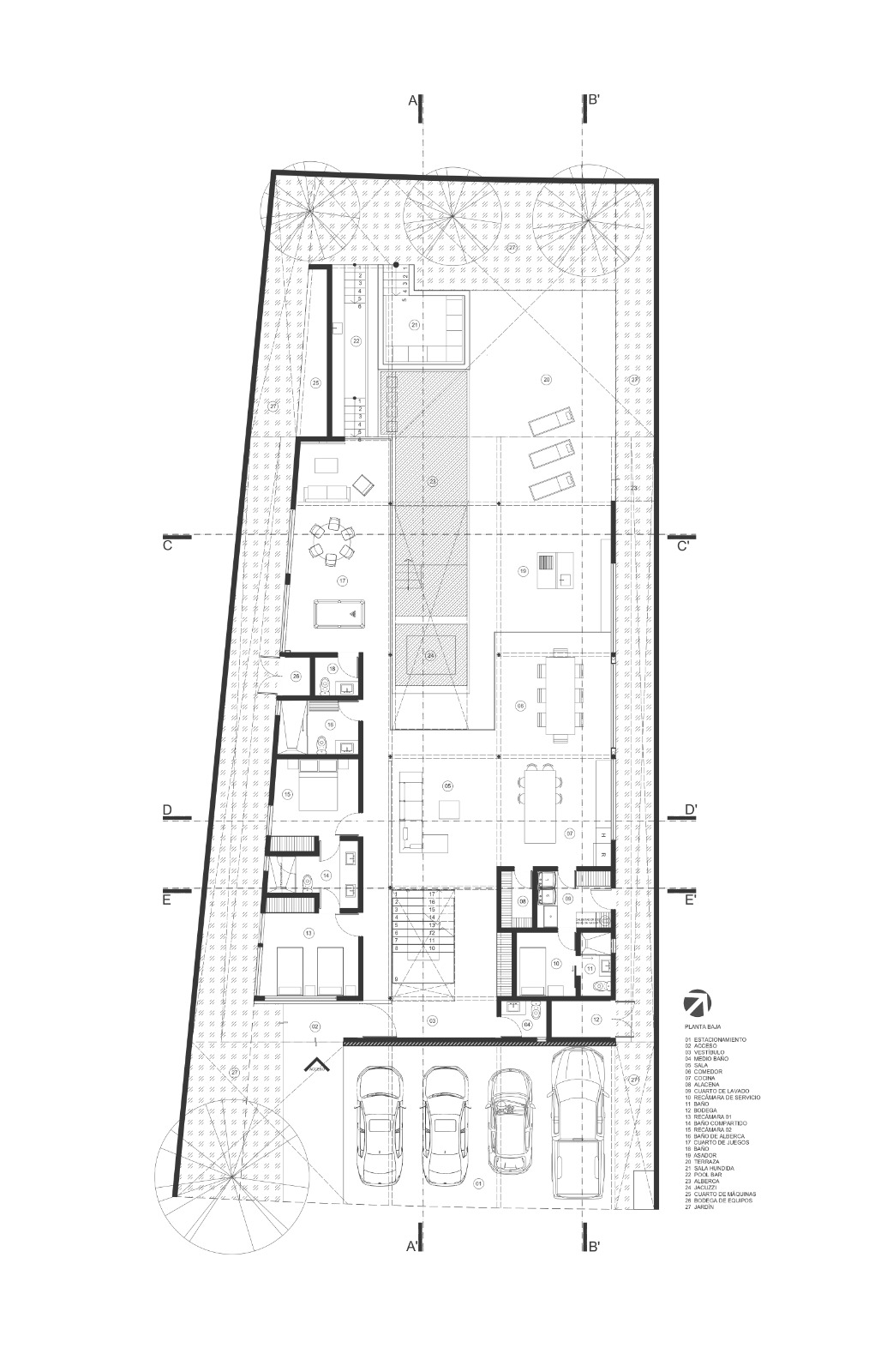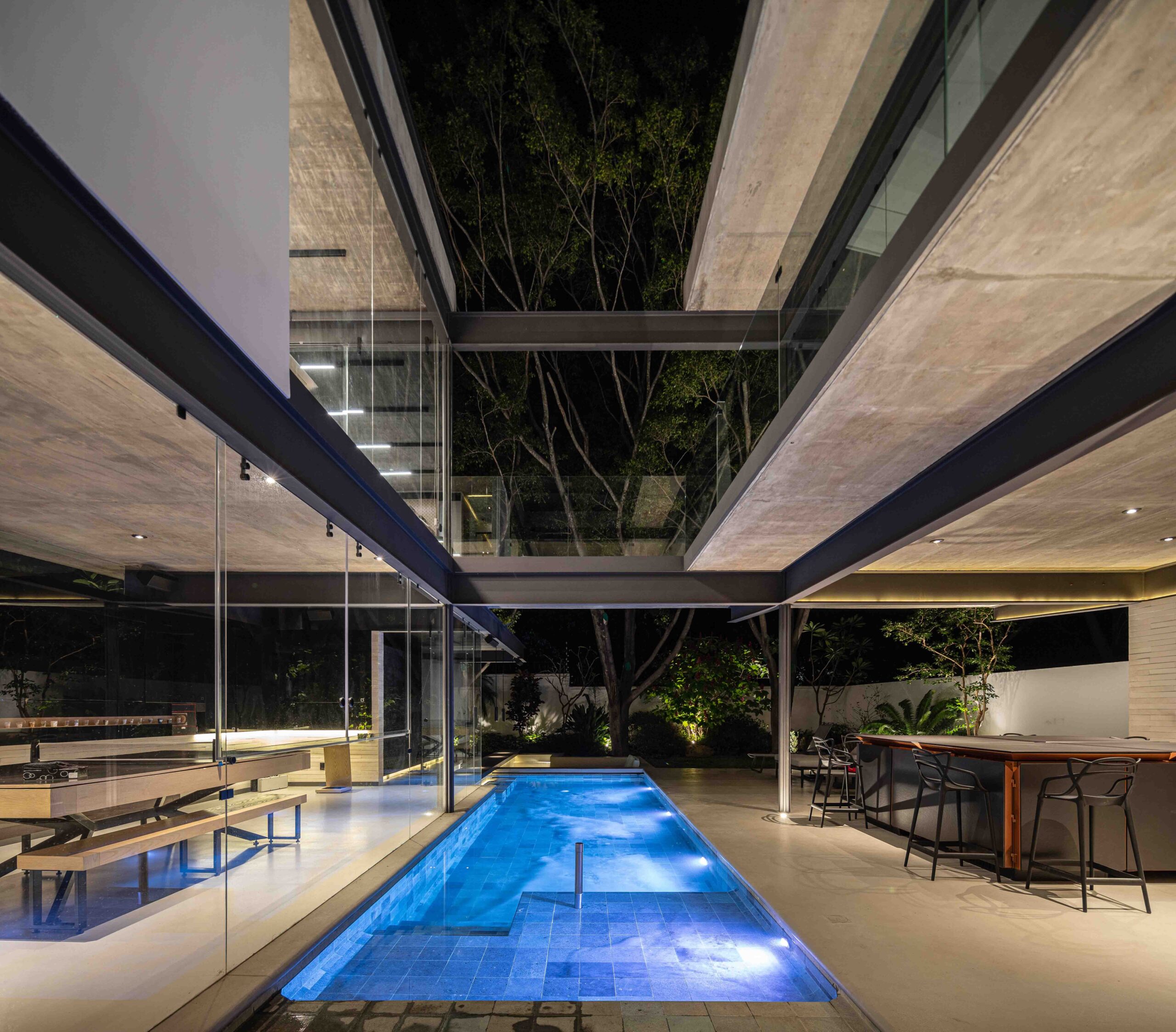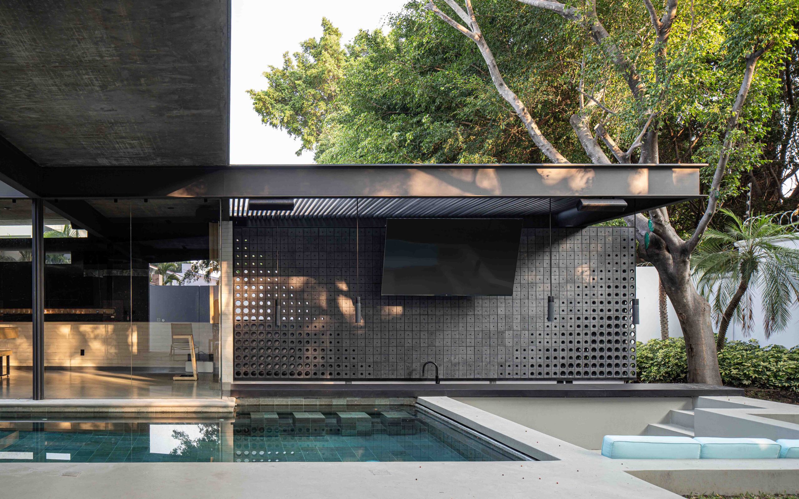 Al centro del conjunto se despliega una alberca de trazo rectangular, elemento protagónico del proyecto, que actúa como eje articulador entre los núcleos sociales: sala, comedor, terraza y área de juegos. Esta última relación espacial se refuerza al integrar visualmente la alberca, la cual cuenta con un pool bar y jacuzzi; concebidas para el disfrute familiar y social. El cuerpo de agua se extiende hacia el jardín posterior, estableciendo un eje de remate visual.