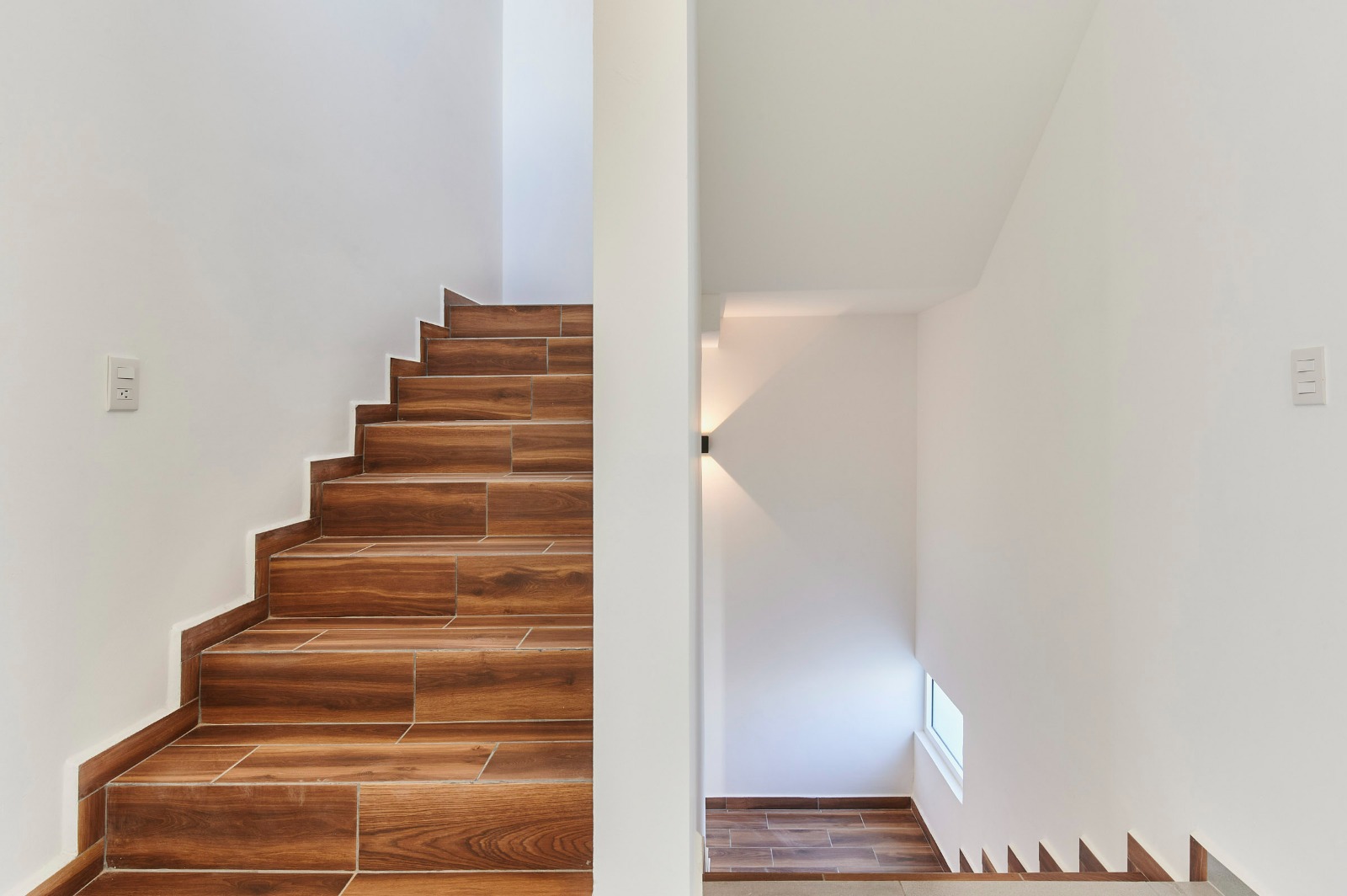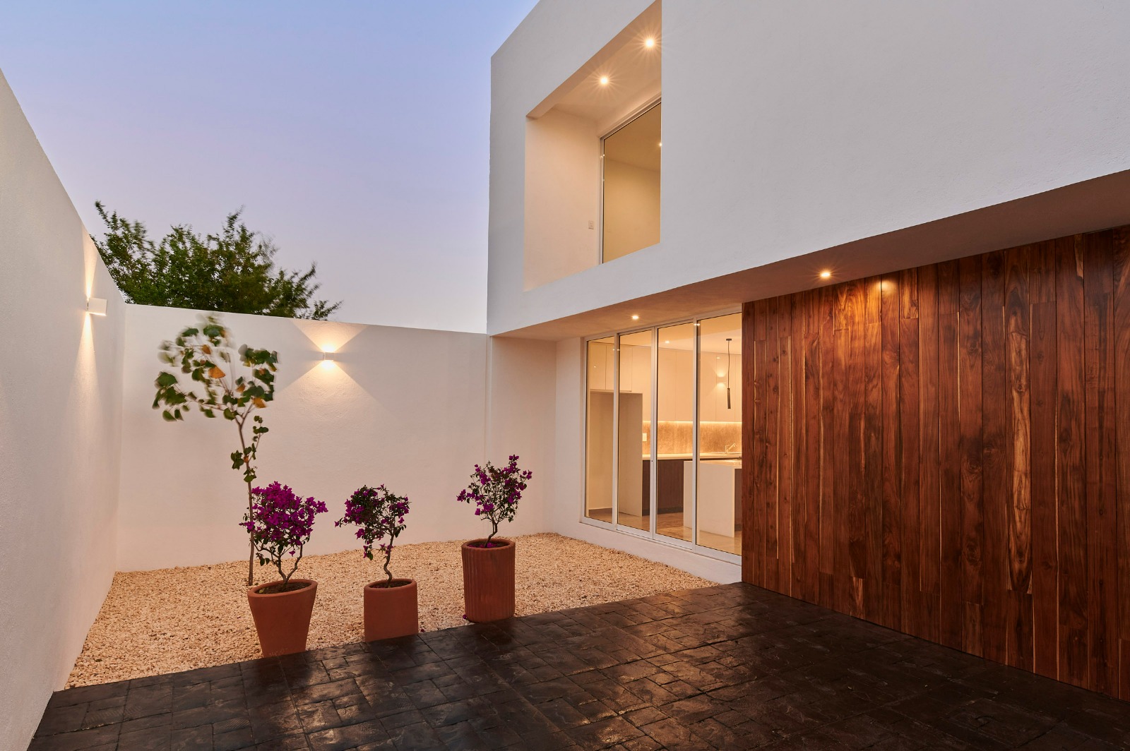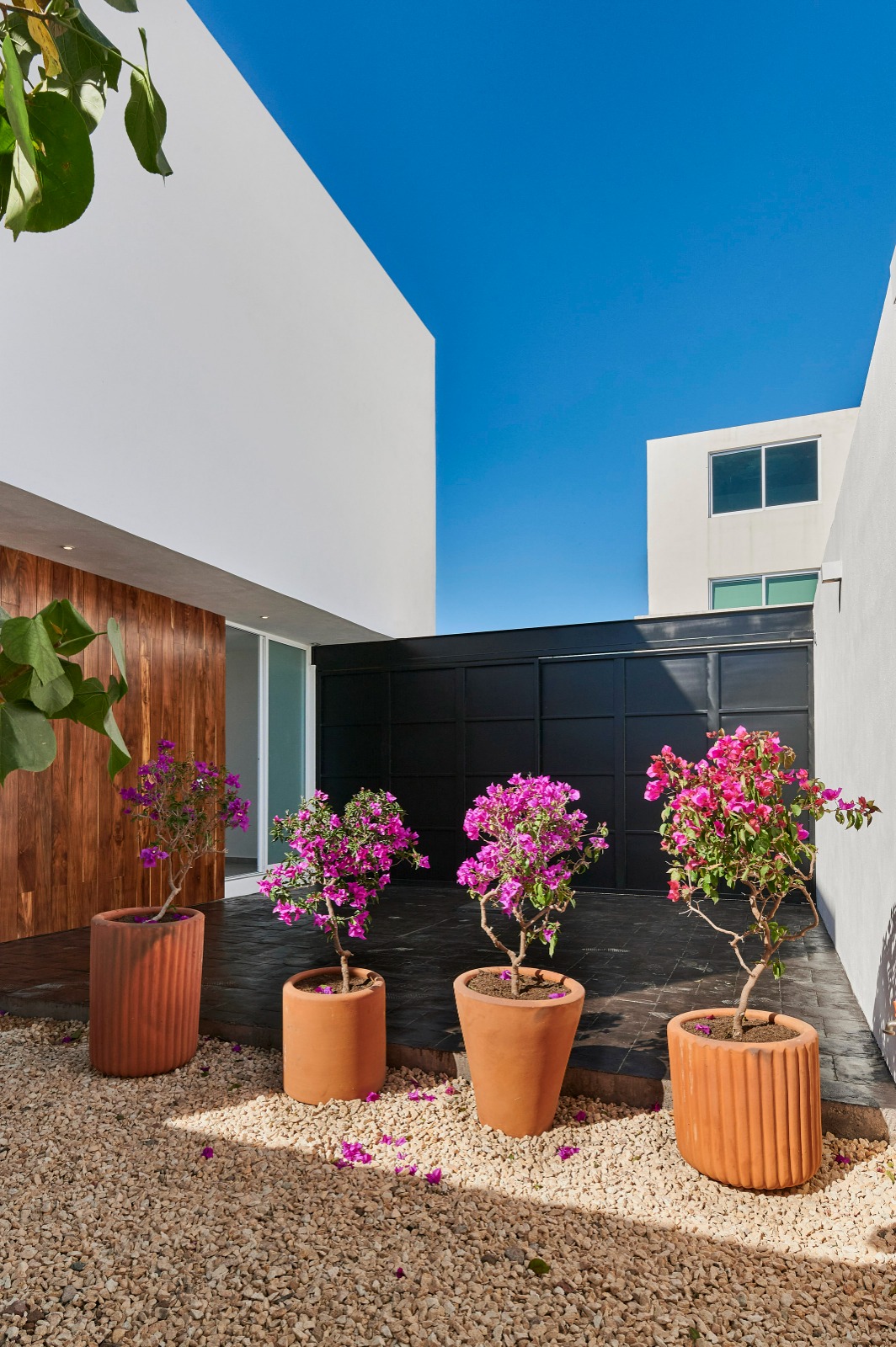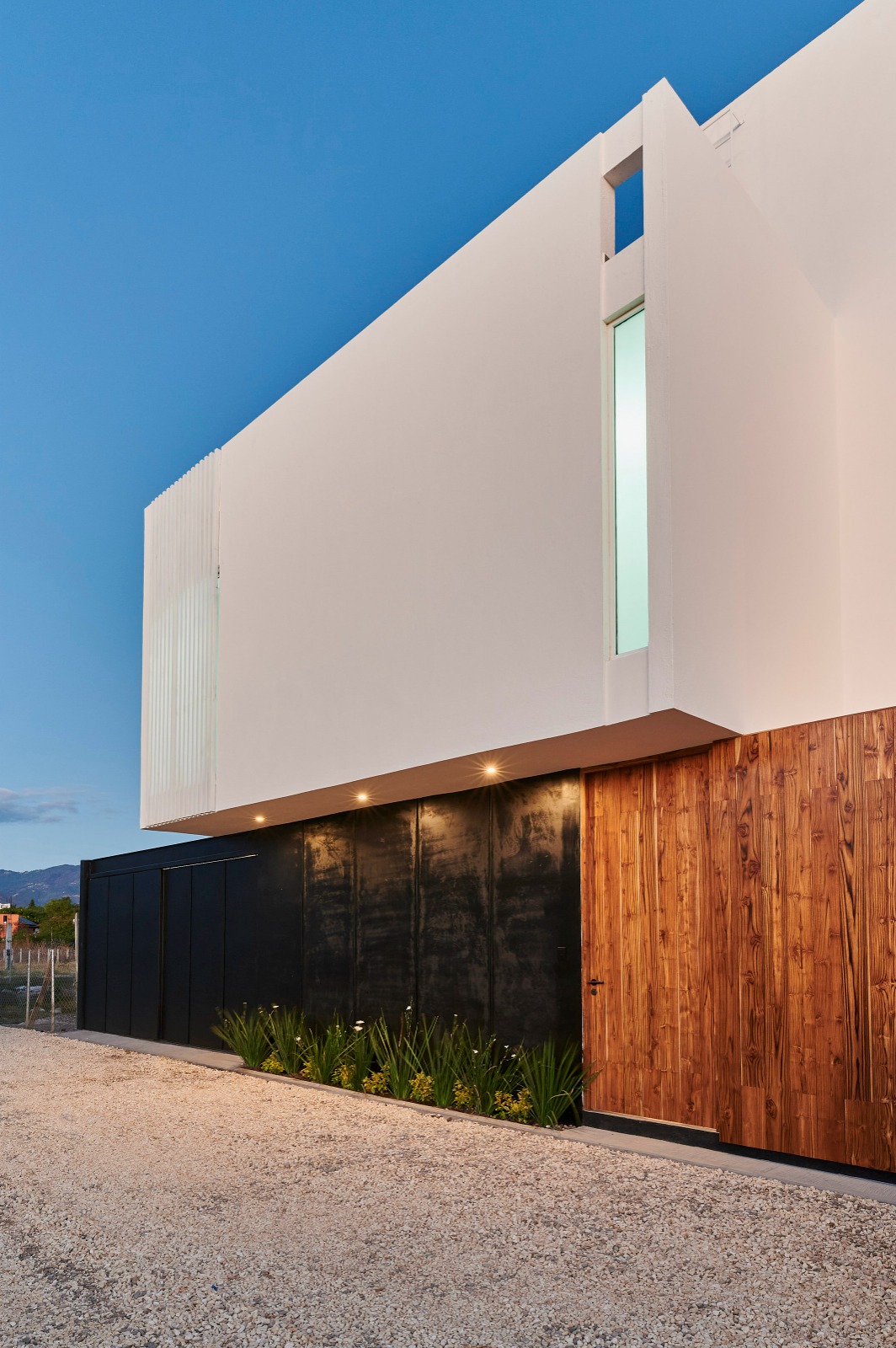 La fachada de la casa se caracteriza por la interacción de tres materiales predominantes. El blanco aporta luminosidad y amplitud, la madera introduce calidez y un toque natural, mientras que el negro, presente en las estructuras metálicas de la herrería, genera contraste y complementa el conjunto con un toque moderno.