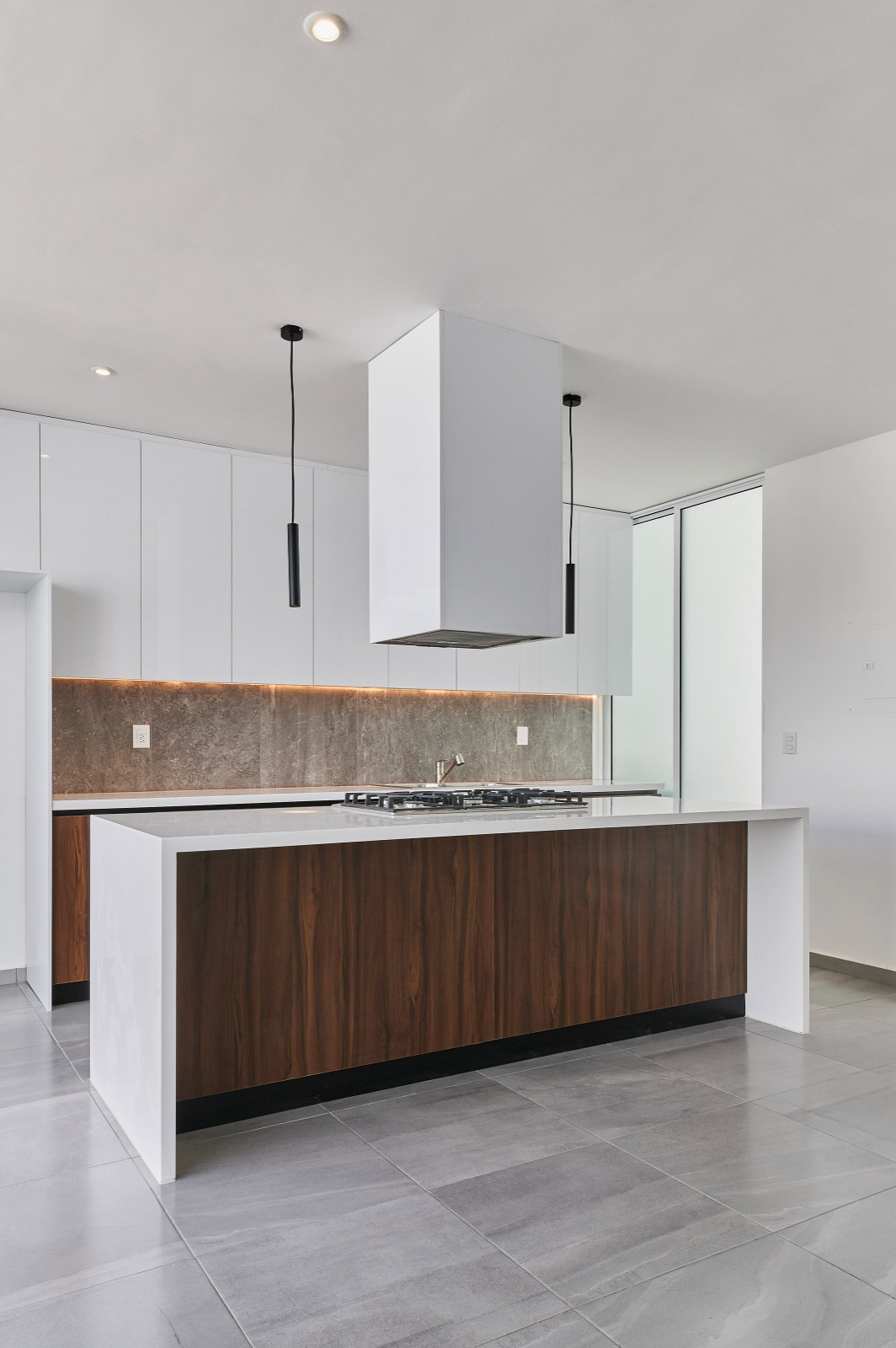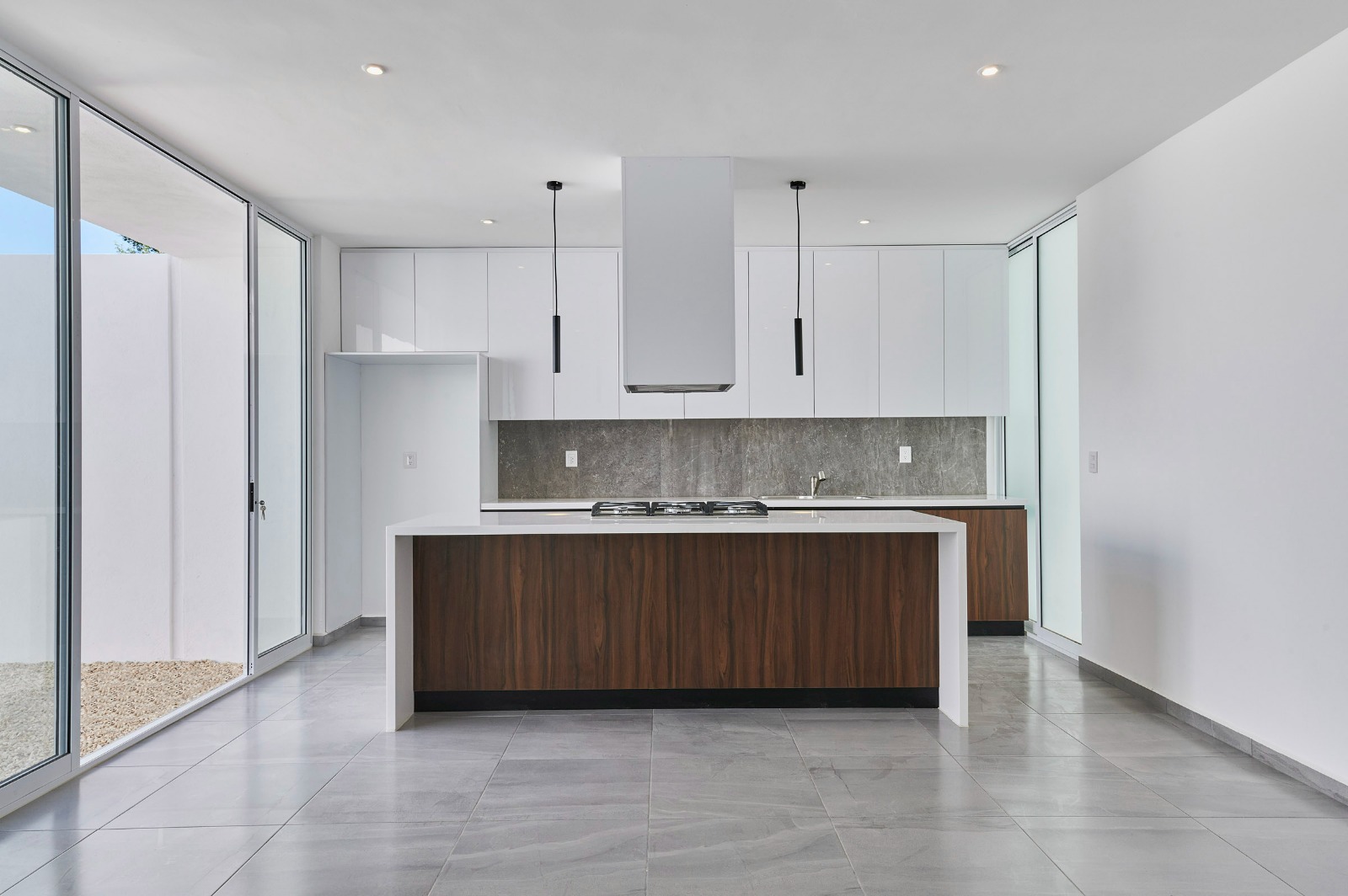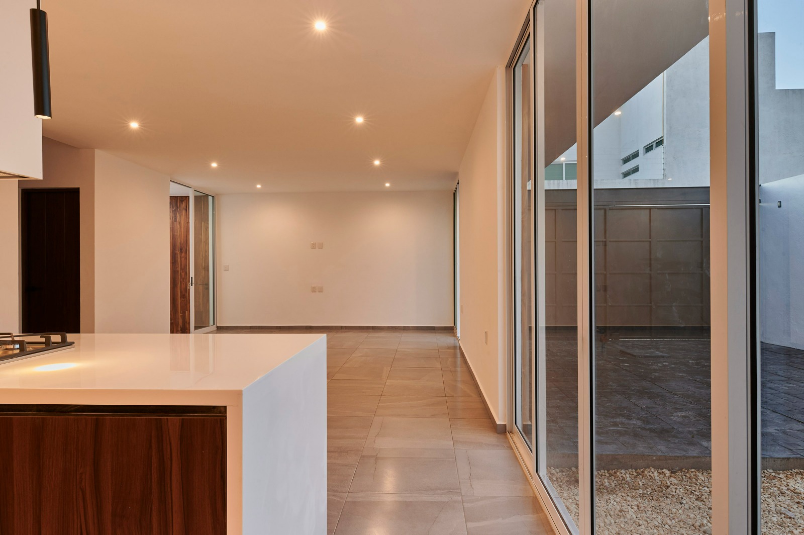 Los grandes ventanales de piso a techo, colocados estratégicamente en el espacio, permiten que el exterior se integre ofreciendo vistas sin interrupción, lo que genera una amplia percepción del espacio y crea una conexión directa con el patio posterior.