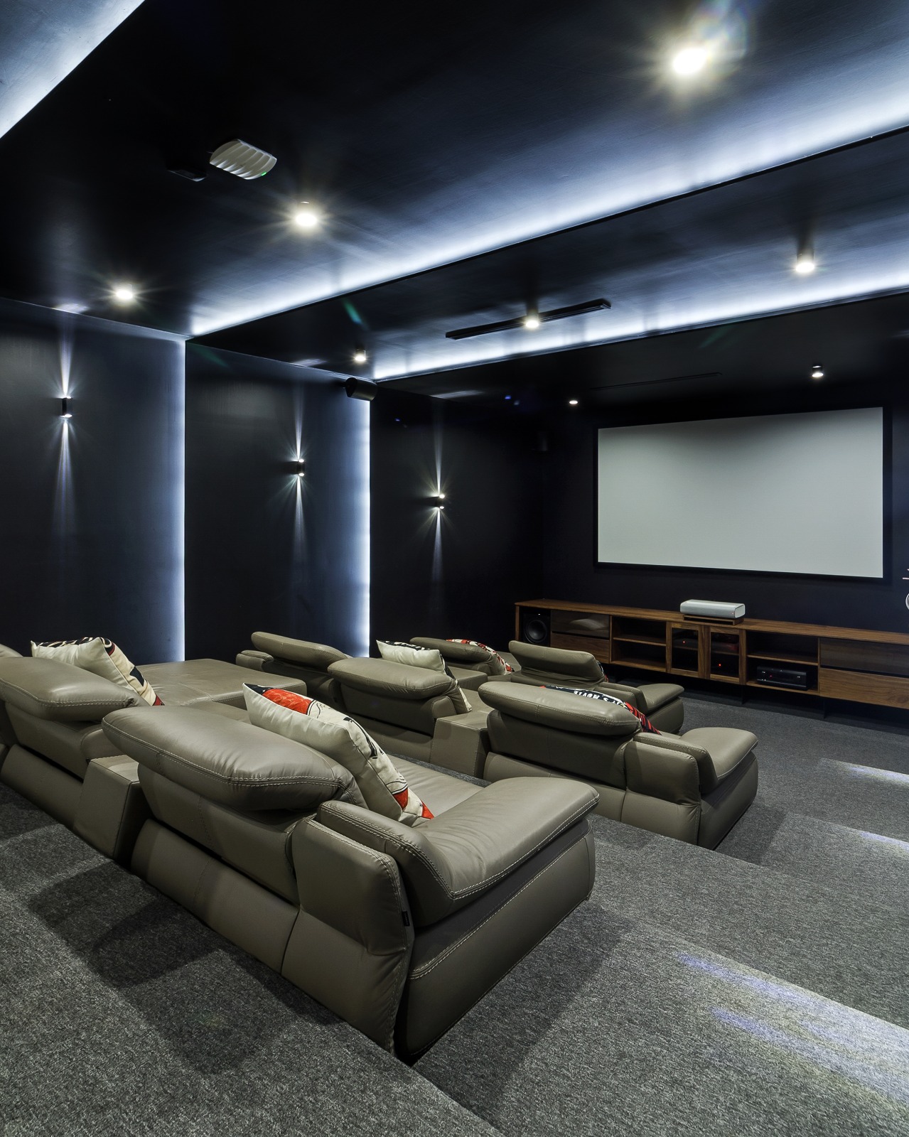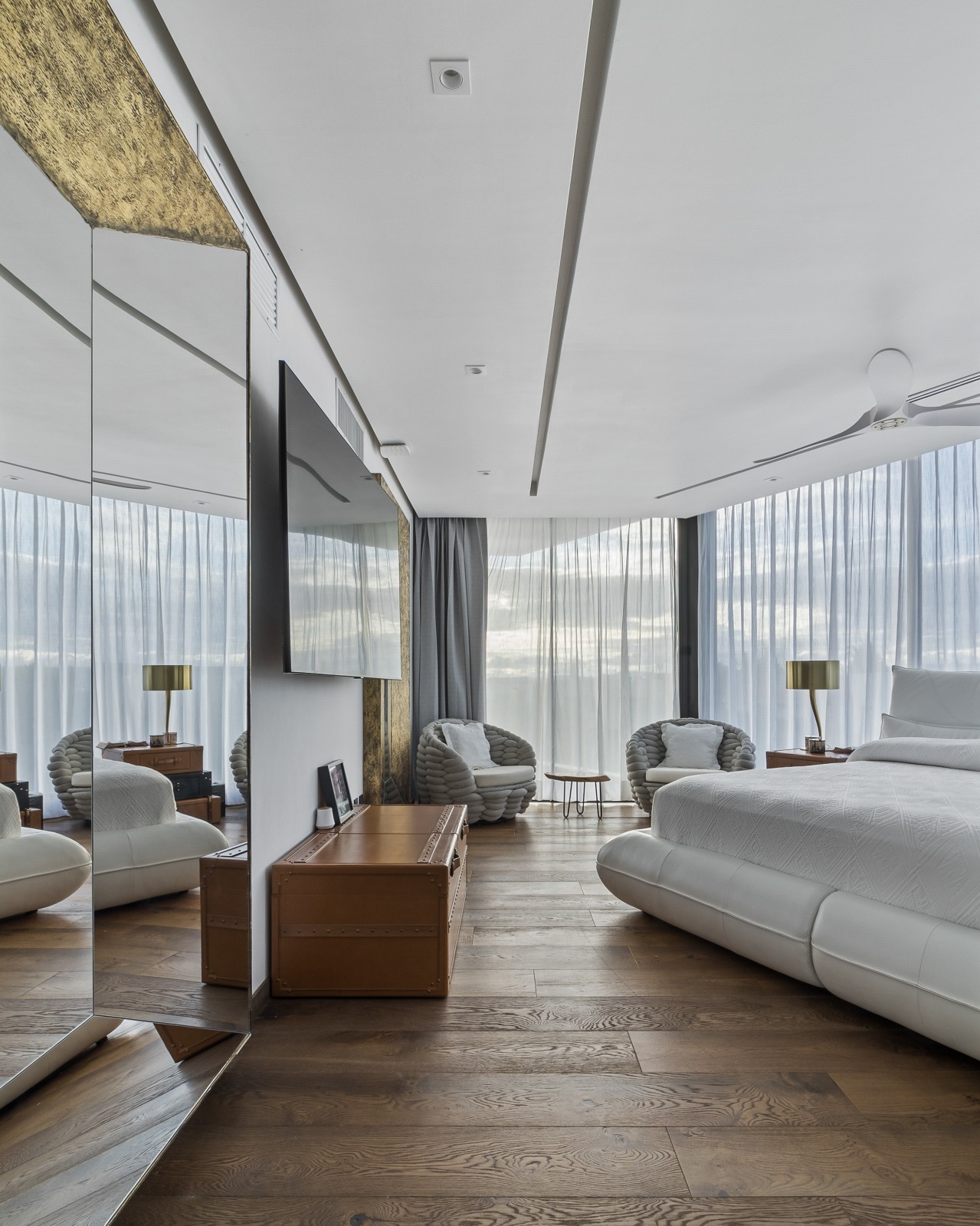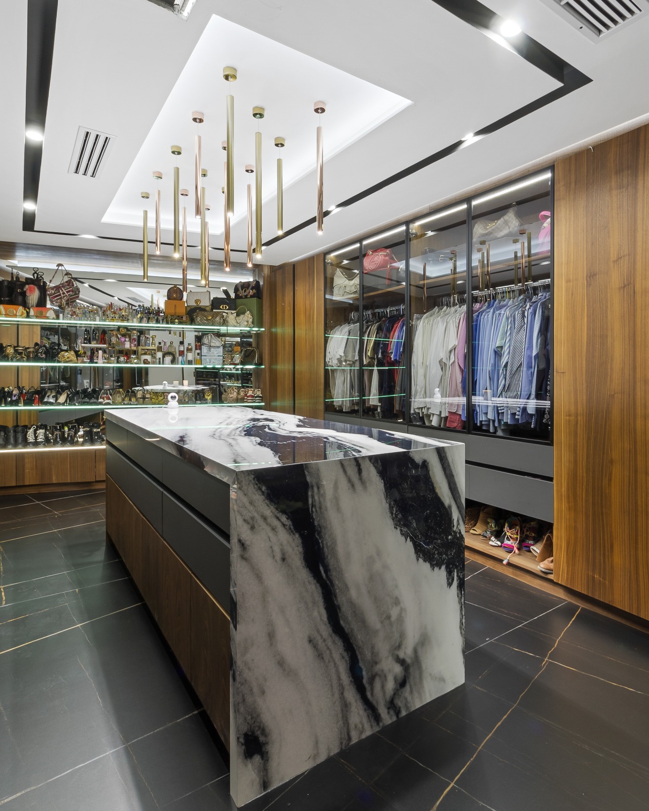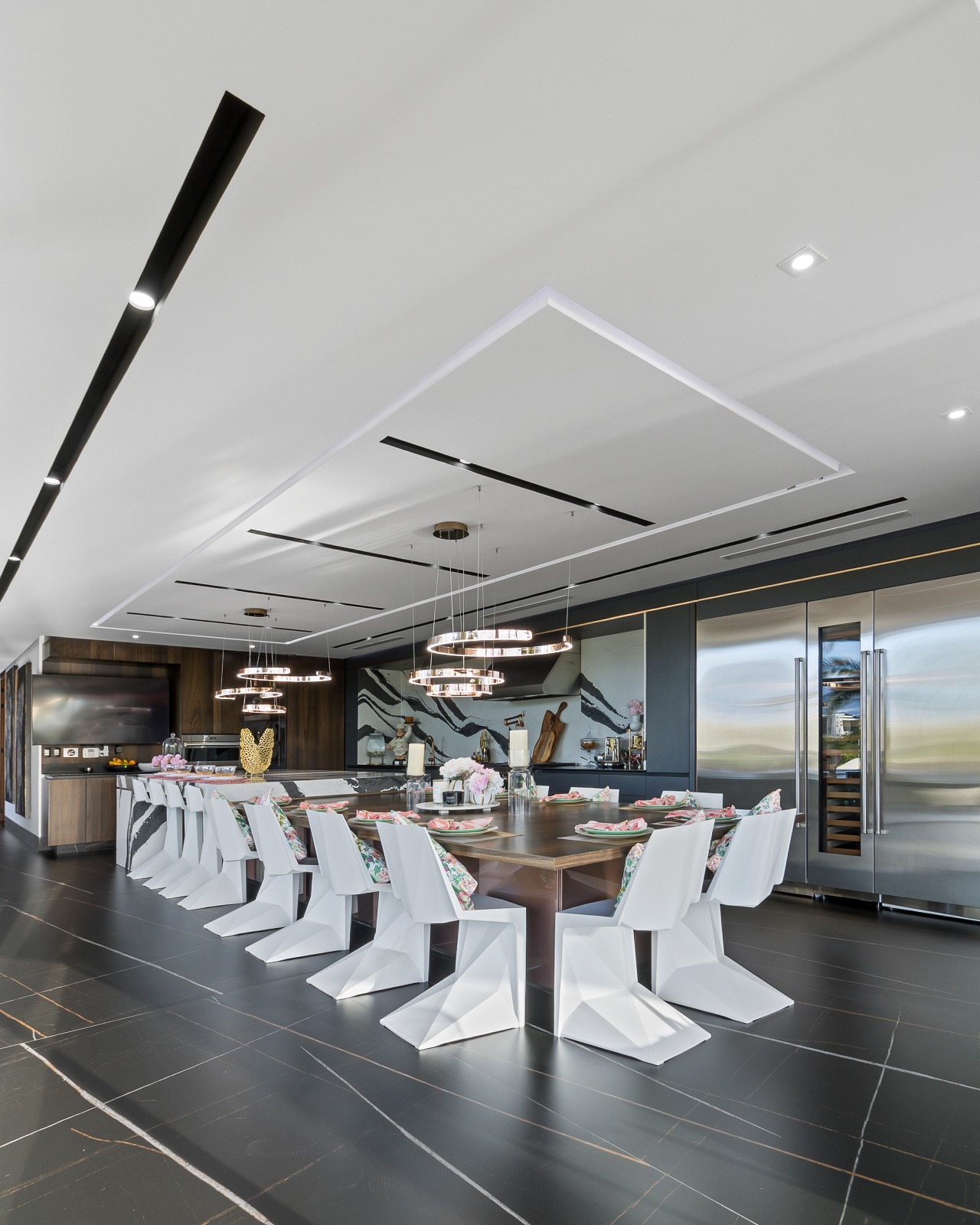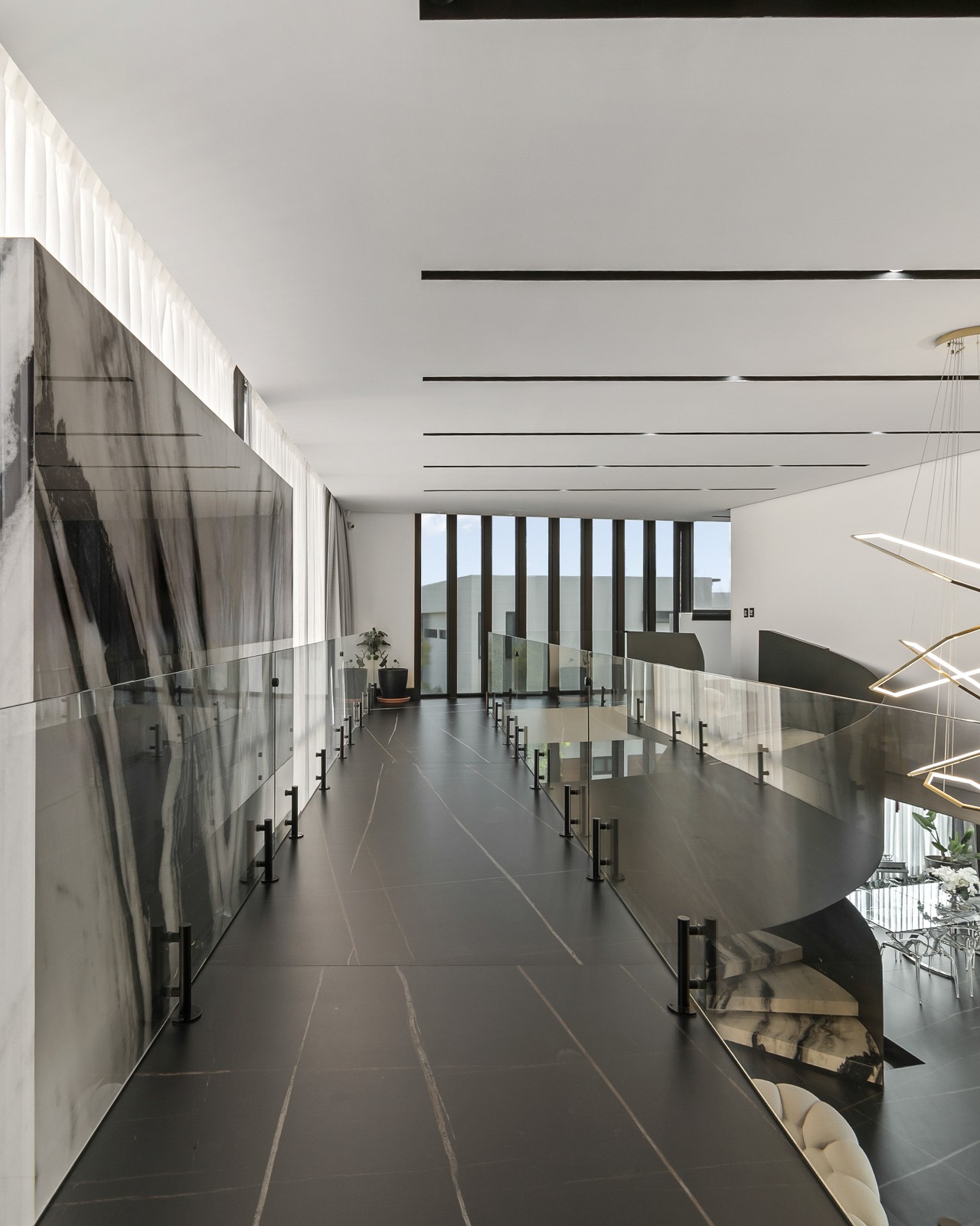 Los materiales empleados fueron seleccionados con el objetivo de potenciar la experiencia espacial. Los contrastes entre superficies lisas y texturizadas, entre tonos neutros y acentos oscuros, generan un equilibrio visual que enriquece cada rincón. En los espacios sociales, el mármol, la madera y el cristal se entrelazan con el paisaje exterior, otorgando calidez y elegancia. Todo esto bajo un mismo concepto: la arquitectura como un escenario para la vida, pero también como una obra de arte en sí misma.