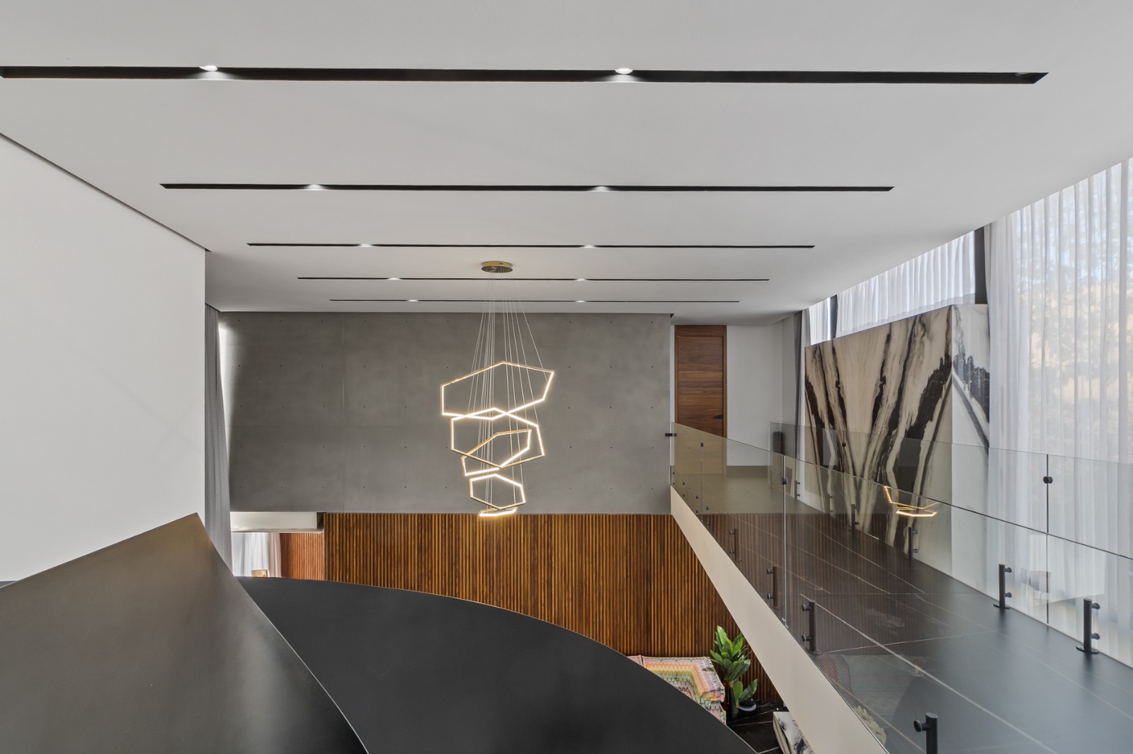 La escalera principal, con su trazo curvo y escultórico, se convierte en un punto focal dentro del espacio. Más que un elemento de circulación, es una pieza artística que aporta movimiento y carácter al conjunto. Cada línea, cada textura, parece formar parte de una gran escultura habitable, donde lo funcional se vuelve estético. El mobiliario y los acabados refuerzan esta visión, generando una atmósfera sofisticada y coherente.