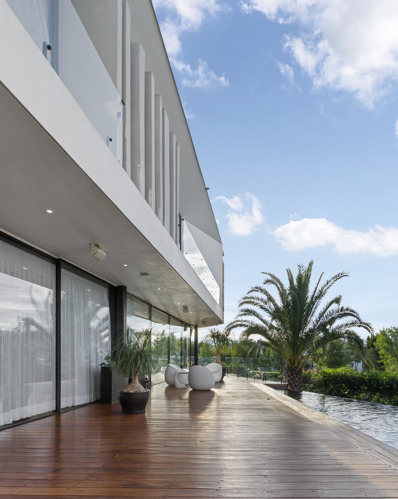 En el área exterior, la terraza y la alberca se convierten en extensión natural de la sala y el comedor. La continuidad visual y espacial entre el interior y el exterior es absoluta, gracias a los grandes ventanales corredizos que se abren por completo. El agua de la alberca refleja tanto el cielo como la volumetría blanca y sobria de la vivienda, generando un juego de transparencias y destellos que refuerzan la sensación de tranquilidad. La vegetación perimetral se integra al diseño de la terraza, envolviendo el espacio y proporcionando privacidad sin aislarlo del entorno.
