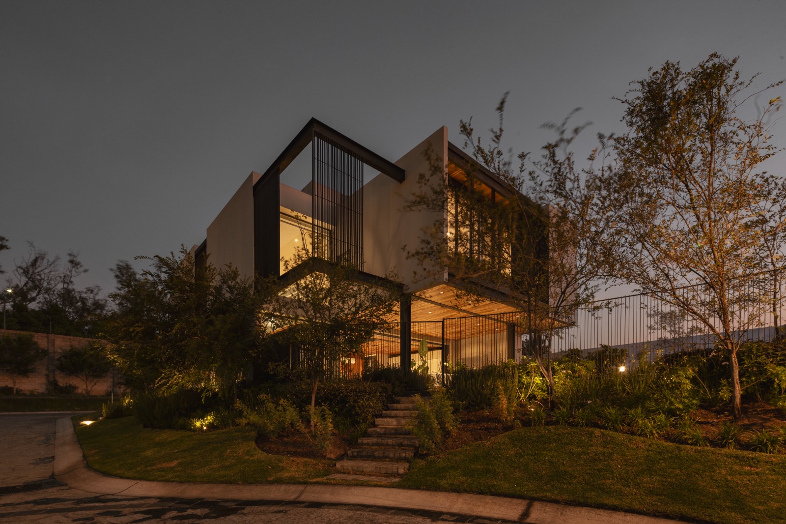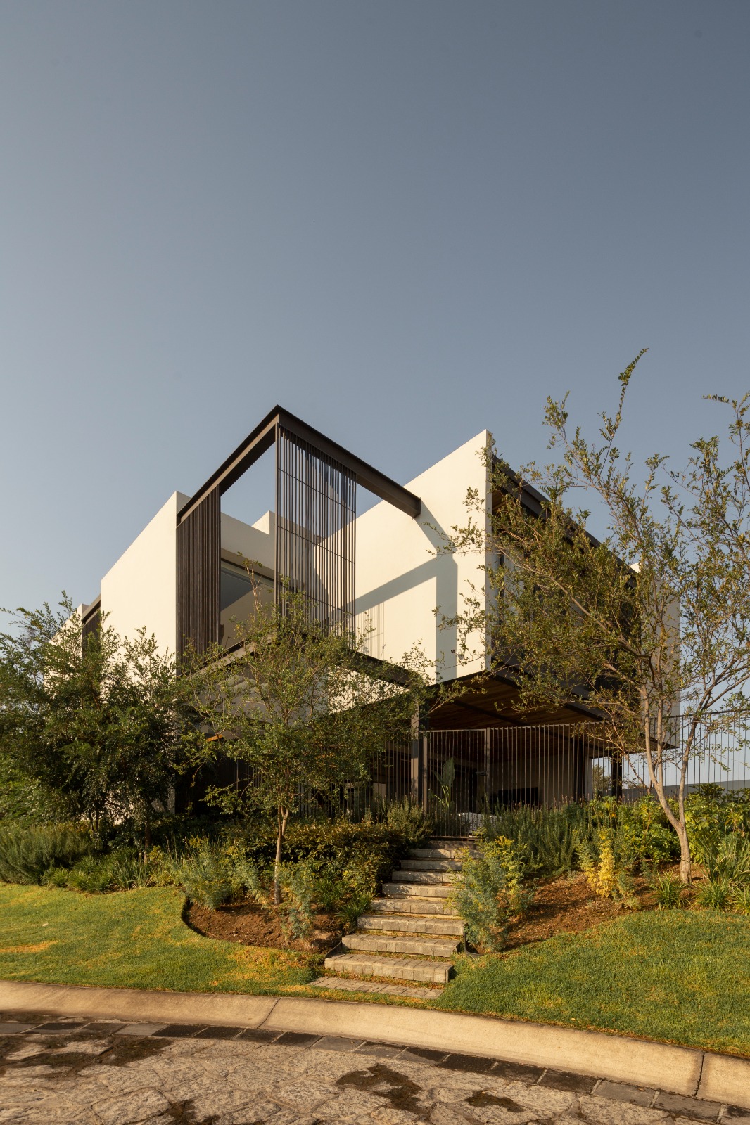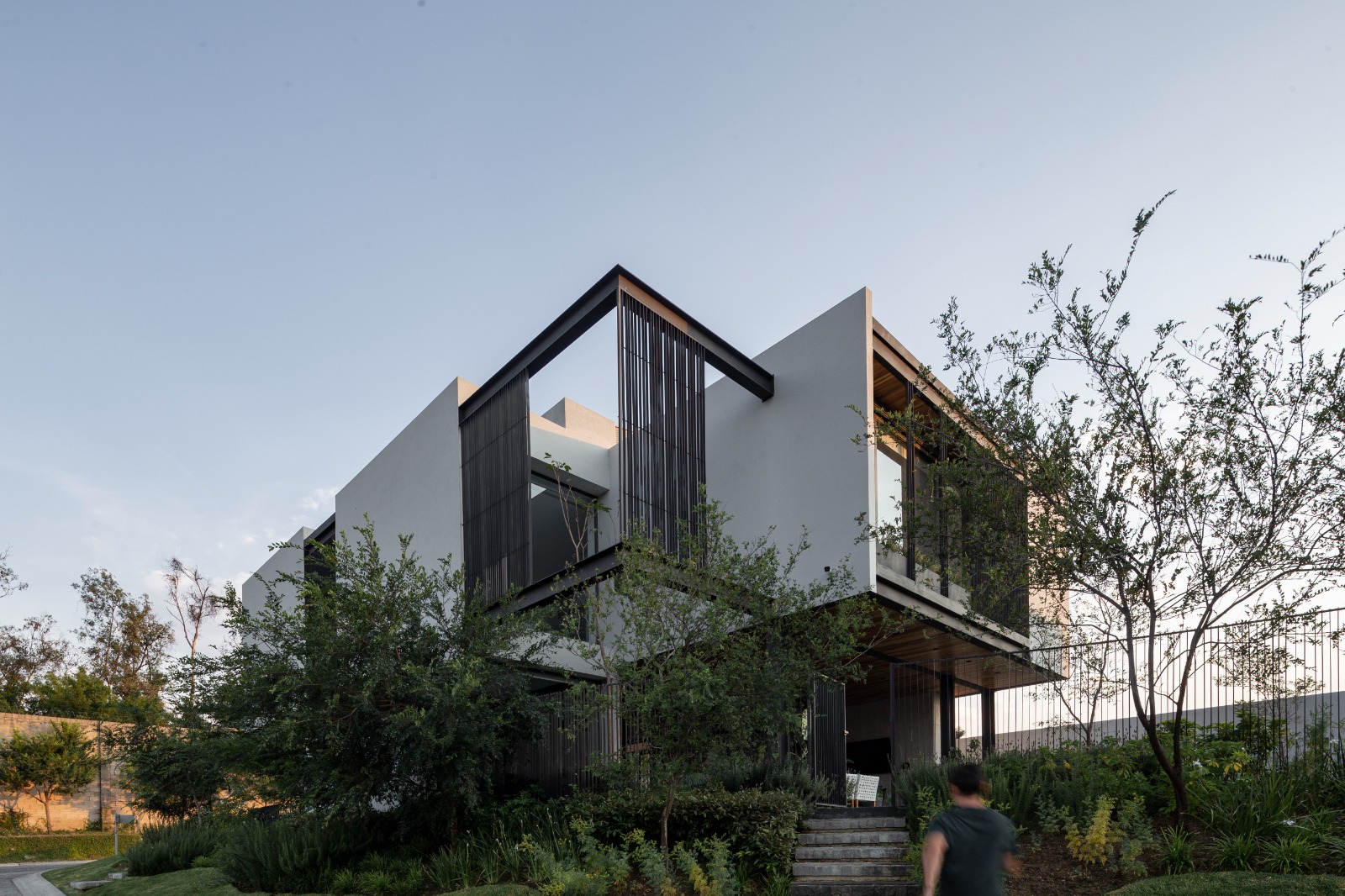 La arquitectura del proyecto se fortalece por el paisajismo, ya que enfatiza diferentes lugares de la vivienda tanto en su interior como en su exterior, desde el patio interior de sótano que te lleva en su cubo de circulaciones hasta planta alta, donde las copas de los árboles te dan la bienvenida y enfatizan estos puentes de acero que te llevan a los diferentes espacios de la vivienda.