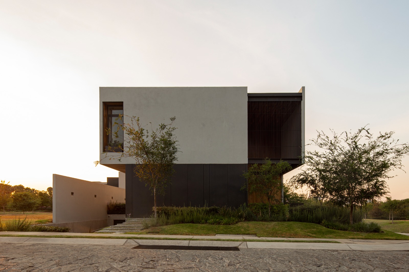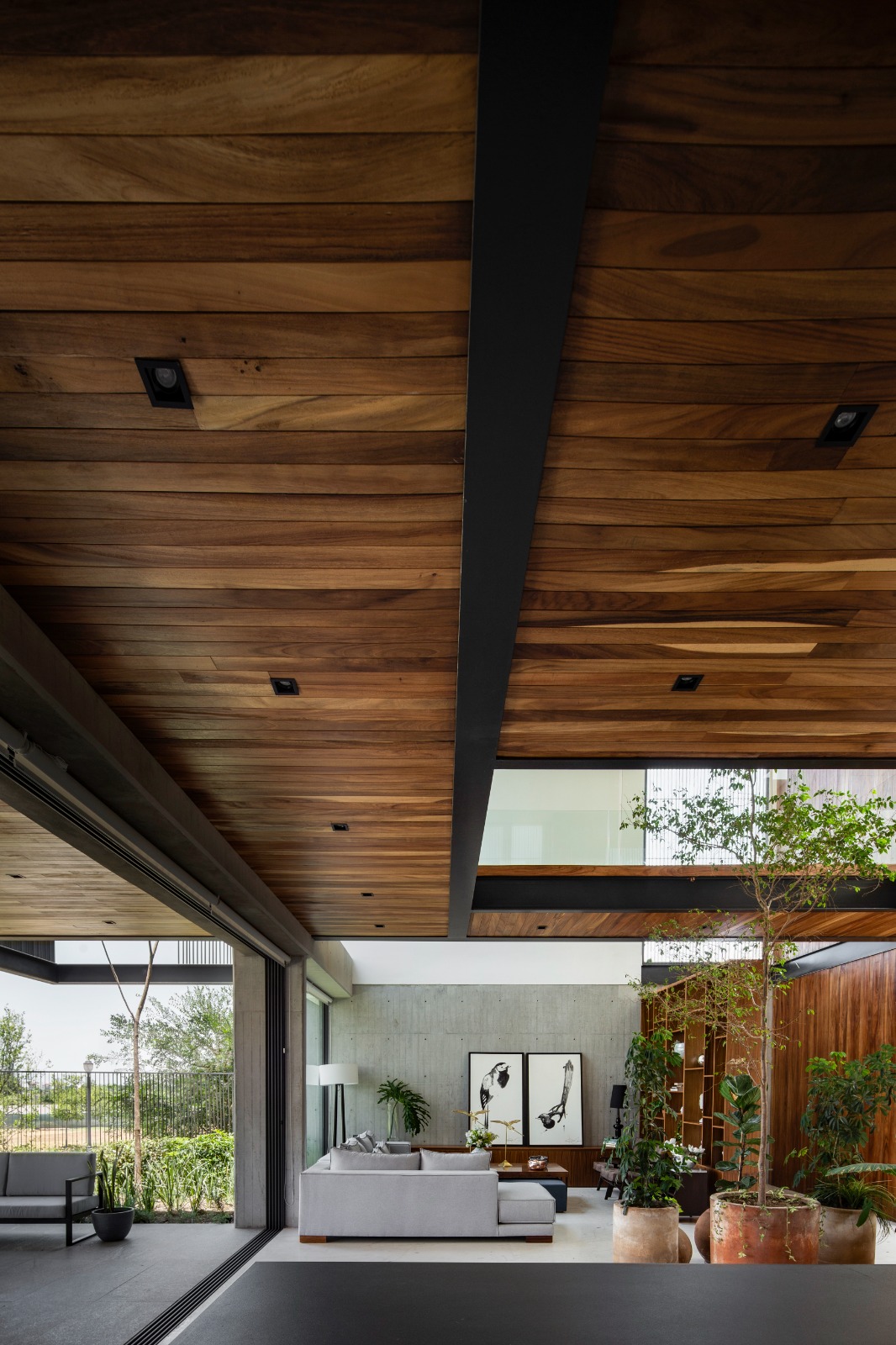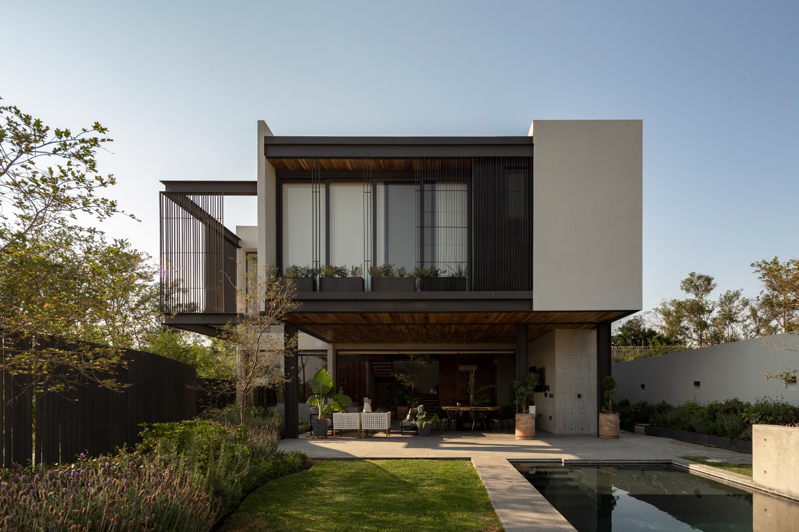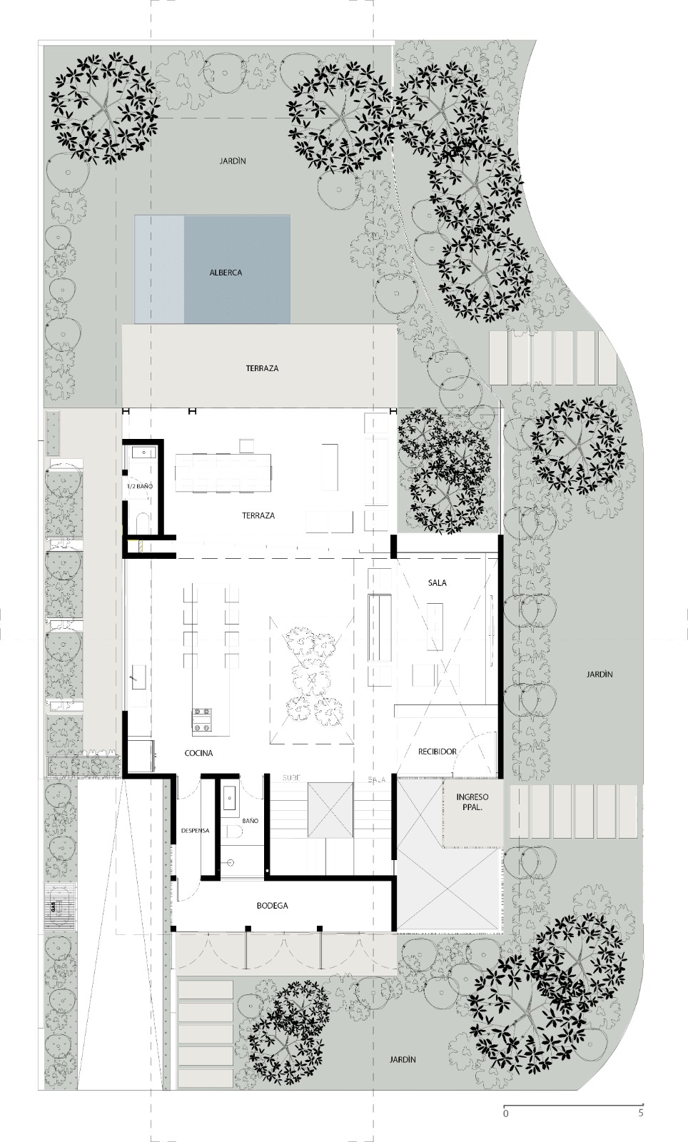 La arquitectura del proyecto se fortalece por el paisajismo, ya que enfatiza diferentes lugares de la vivienda tanto en su interior como en su exterior, desde el patio interior de sótano que te lleva en su cubo de circulaciones hasta planta alta, donde las copas de los árboles te dan la bienvenida y enfatizan estos puentes de acero que te llevan a los diferentes espacios de la vivienda.