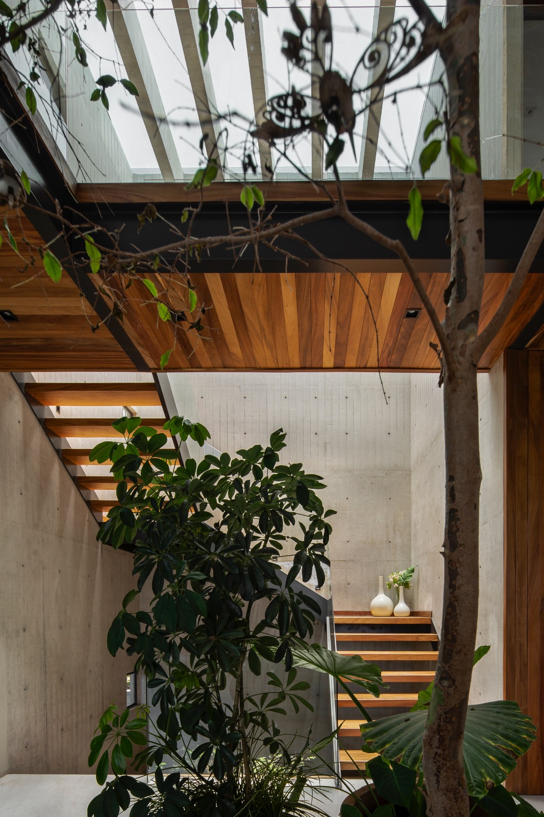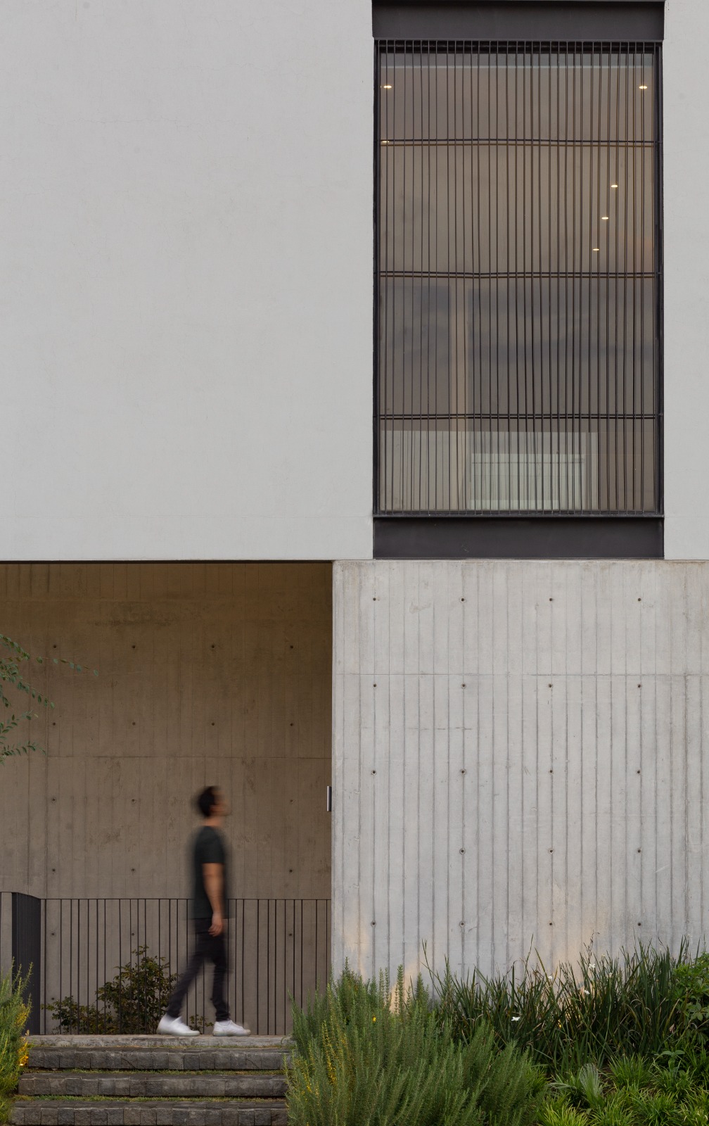 La conversación entre el paisajismo y la arquitectura es parte esencial del proyecto, ya que la vegetación emerge del exterior para situarse en el interior. Creando un recorrido a lo largo de los muros de concreto y la celosía de acero que se convierte en un muro verde gracias al follaje de las plantas que crean esta permeabilidad del interior con el exterior.
