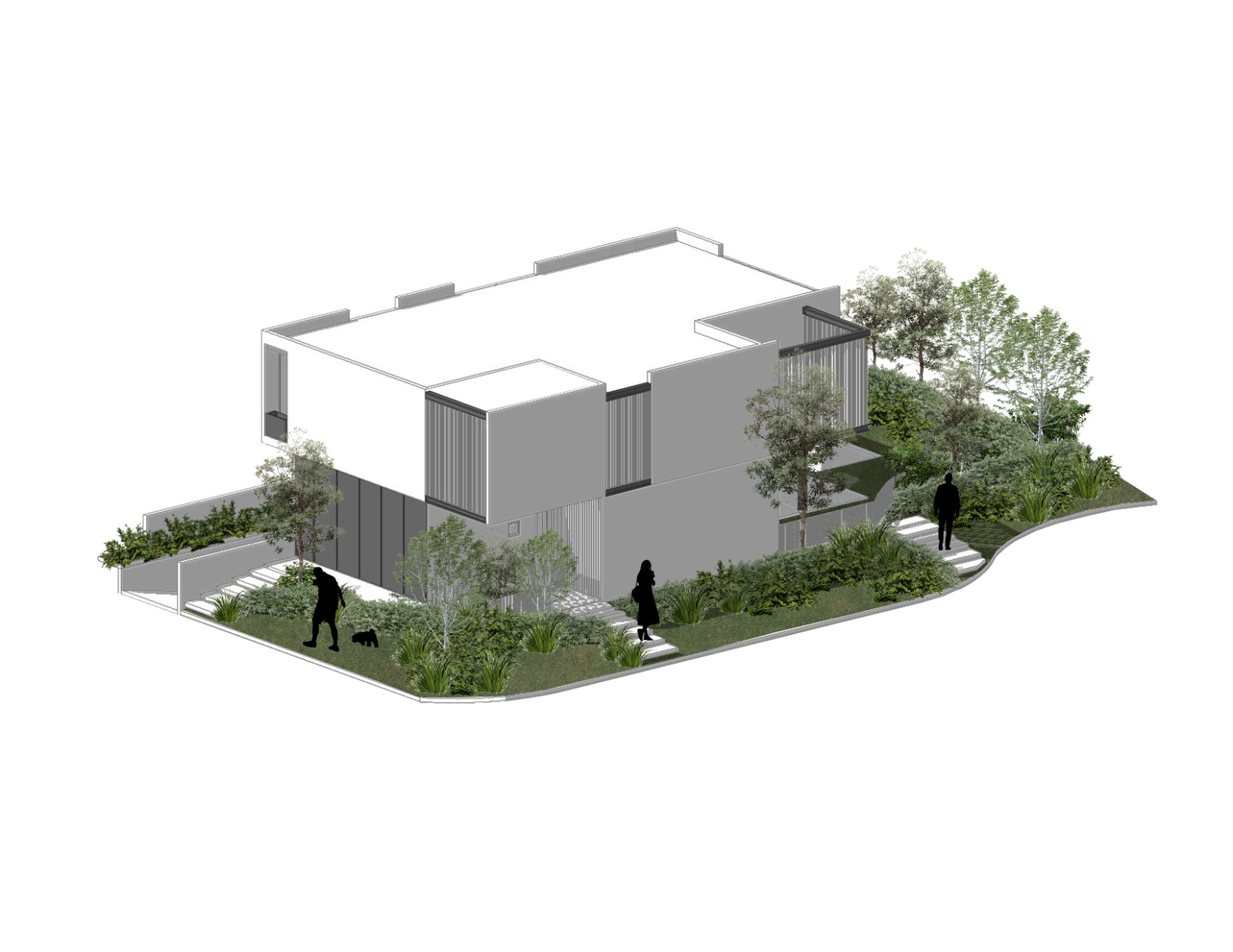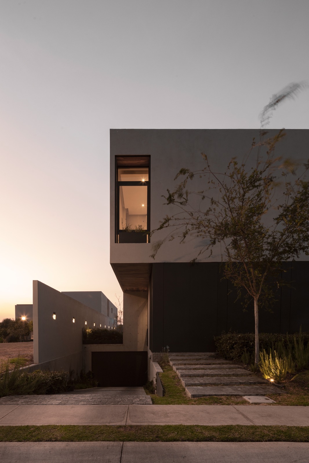 La vivienda busca de esta forma su intimidad, conectando todos los espacios de la casa por medio de la vegetación. La geometría de la vivienda se complementa con el concreto aparente de sótano, planta baja y el acero de planta alta que conecta los diferentes volúmenes del proyecto, creando así un vestíbulo en el ingreso principal que va desde el sótano hasta la planta alta creando una triple altura y recibiendo al visitante por medio de este puente que te lleva a la puerta principal.