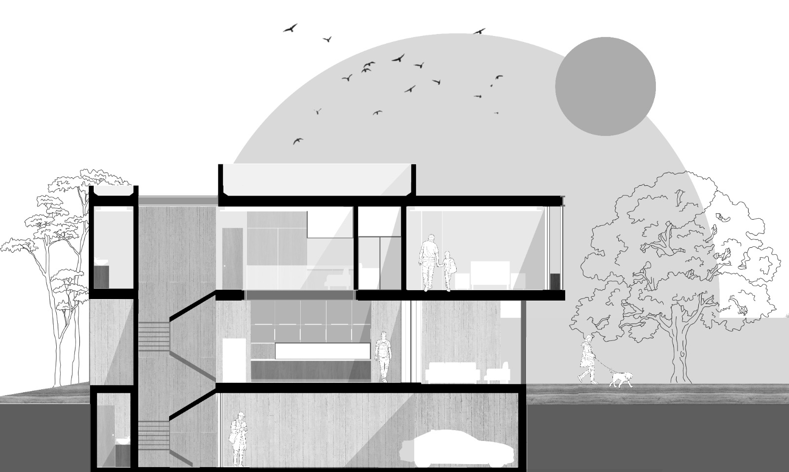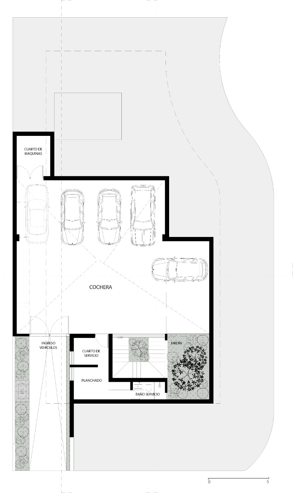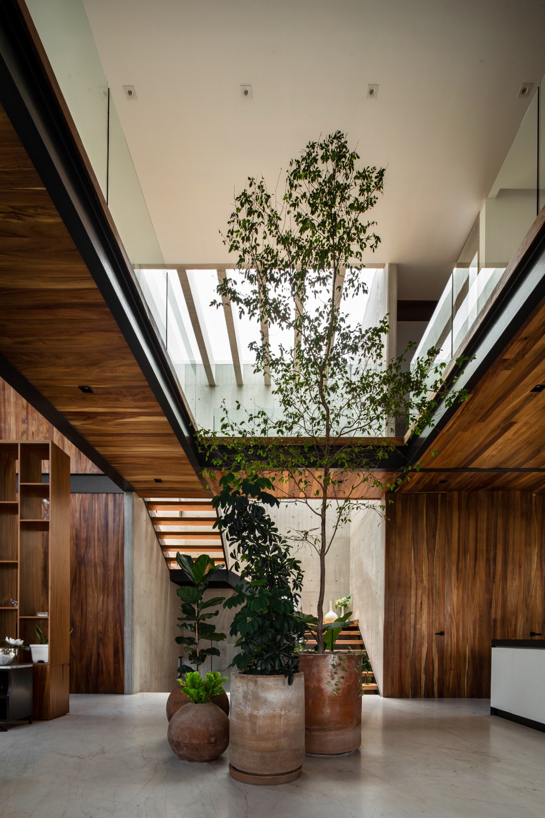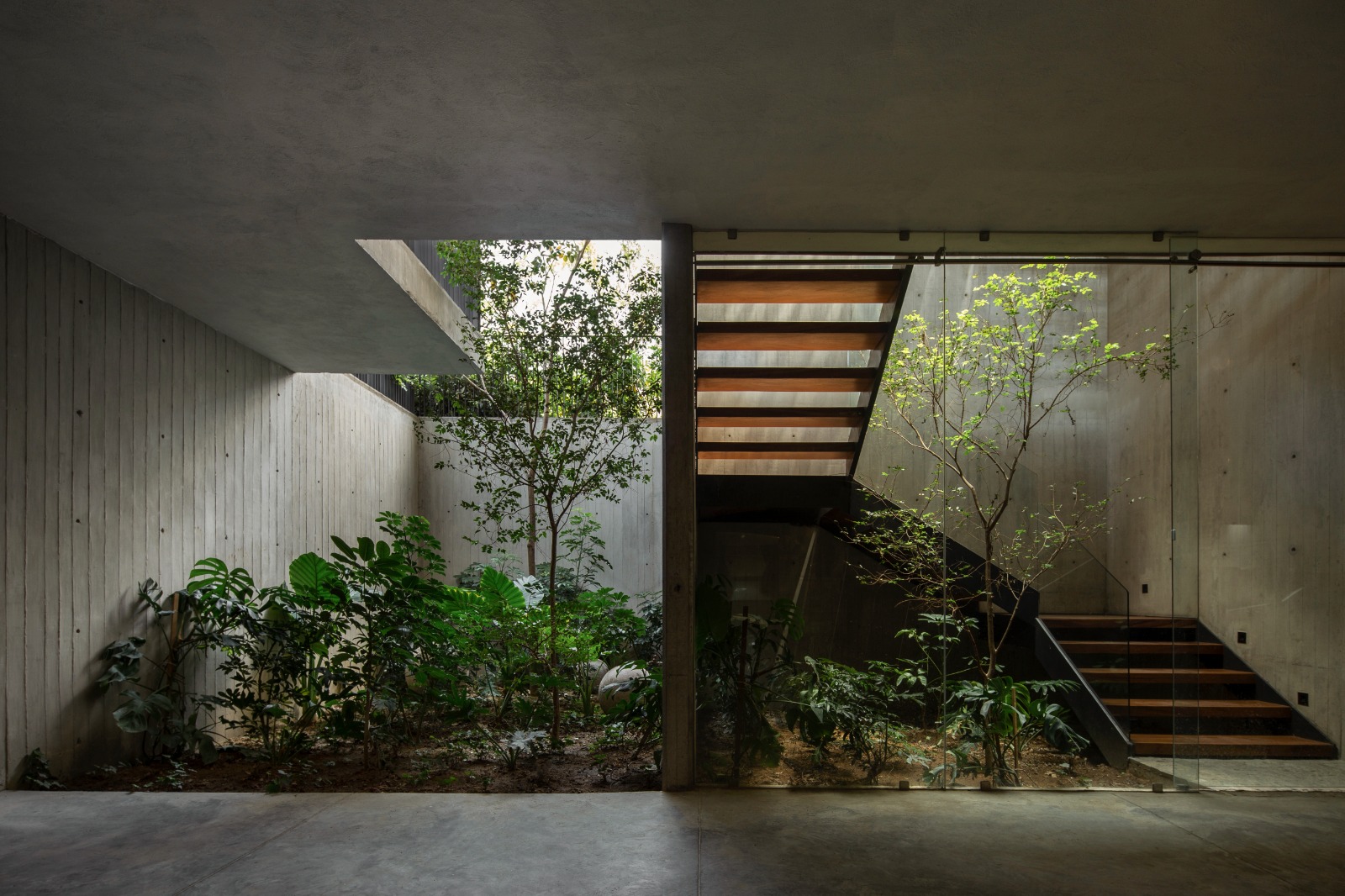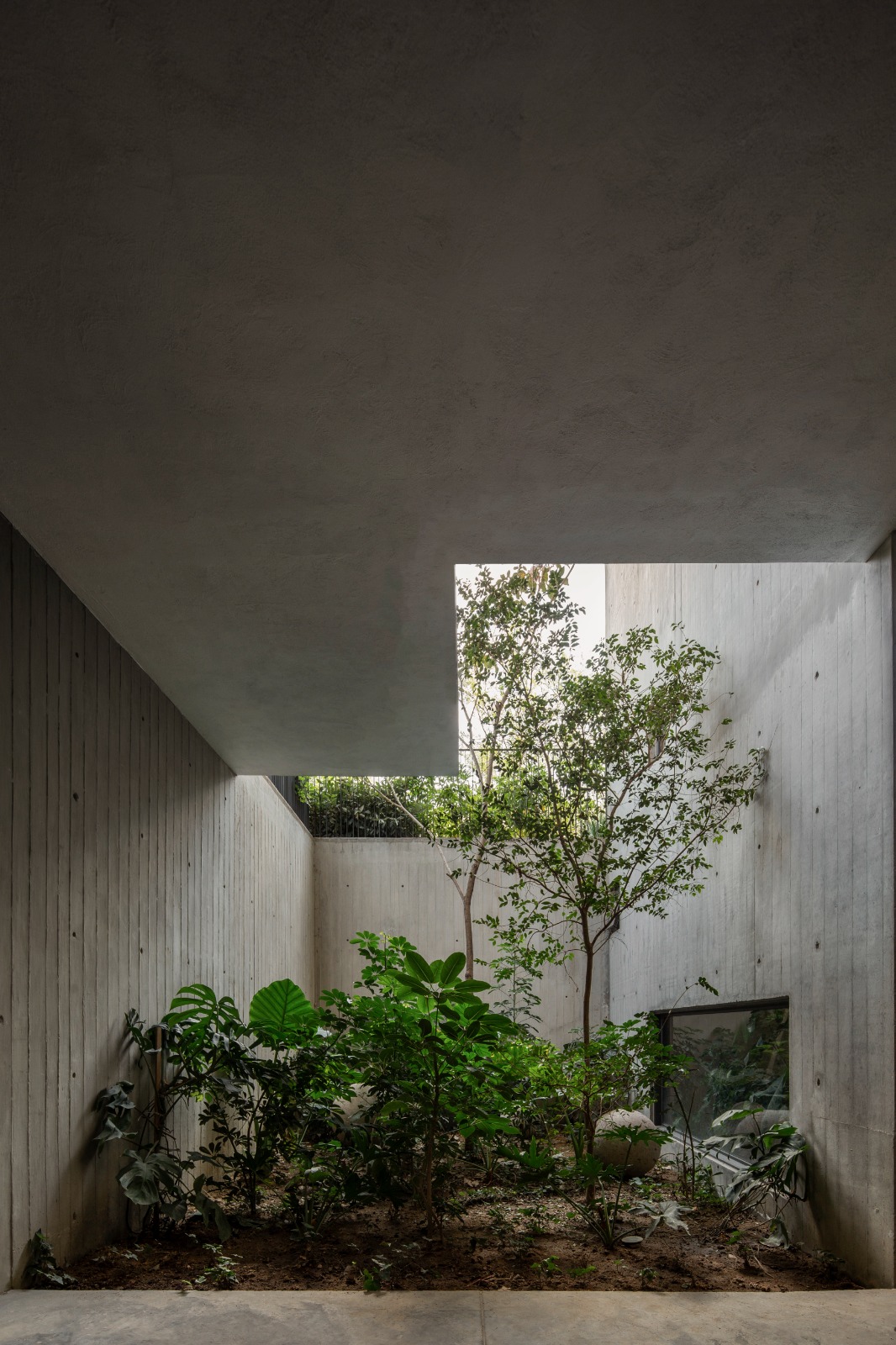 El sótano es la crujía de este proyecto, ya que de ahí emergen todos los elementos importantes de la vivienda, como lo es su doble patio interior, que abraza el ingreso principal y crea este núcleo de paisajismo que sobresale por las copas de los árboles en su planta baja. Dando carácter a la iluminación y ventilación natural que baña estos muros de concreto aparente que te llevan a lo largo de todo el recorrido del proyecto.