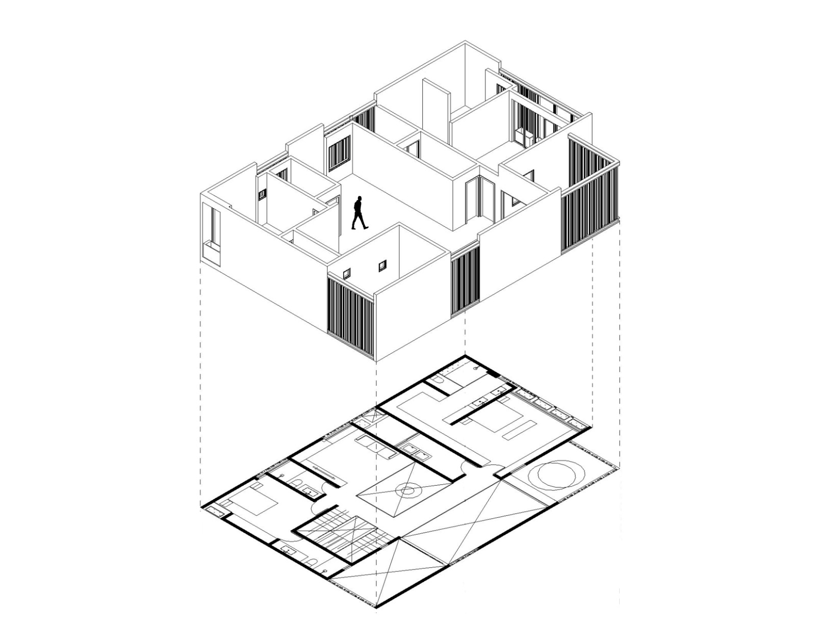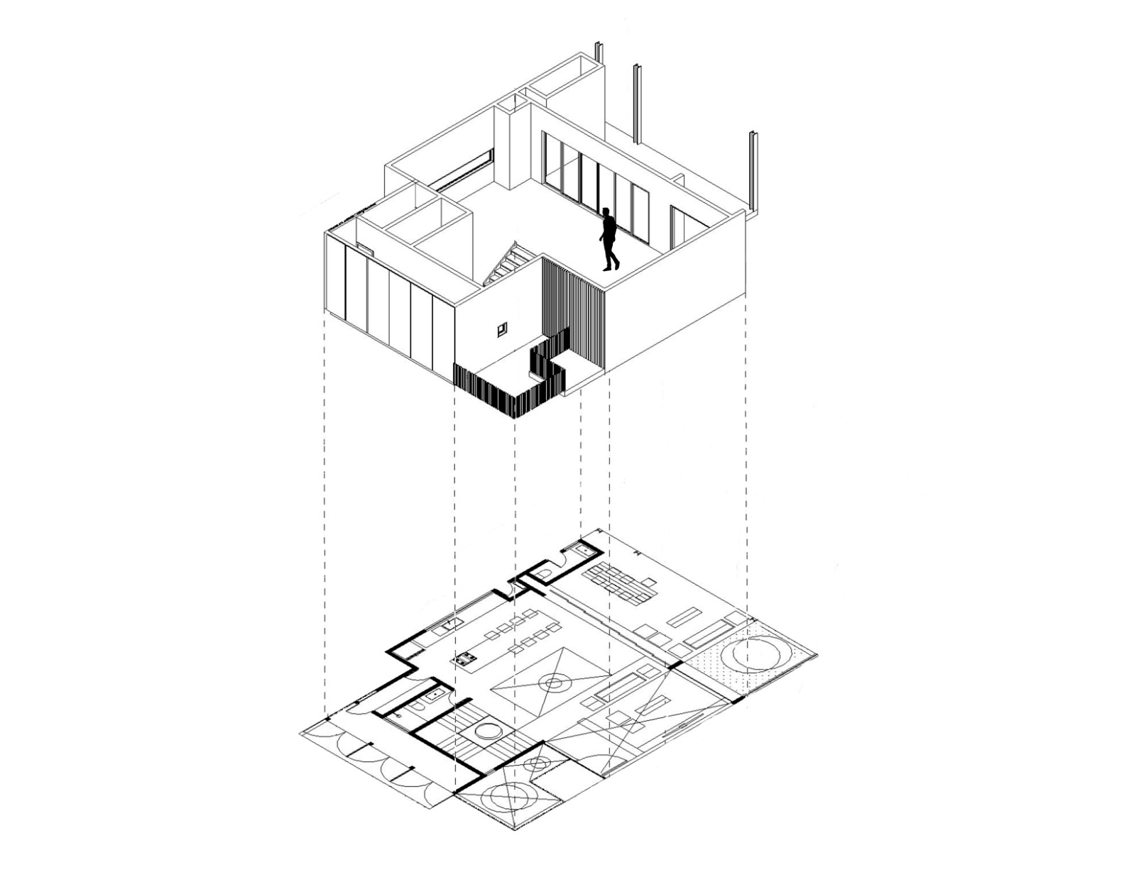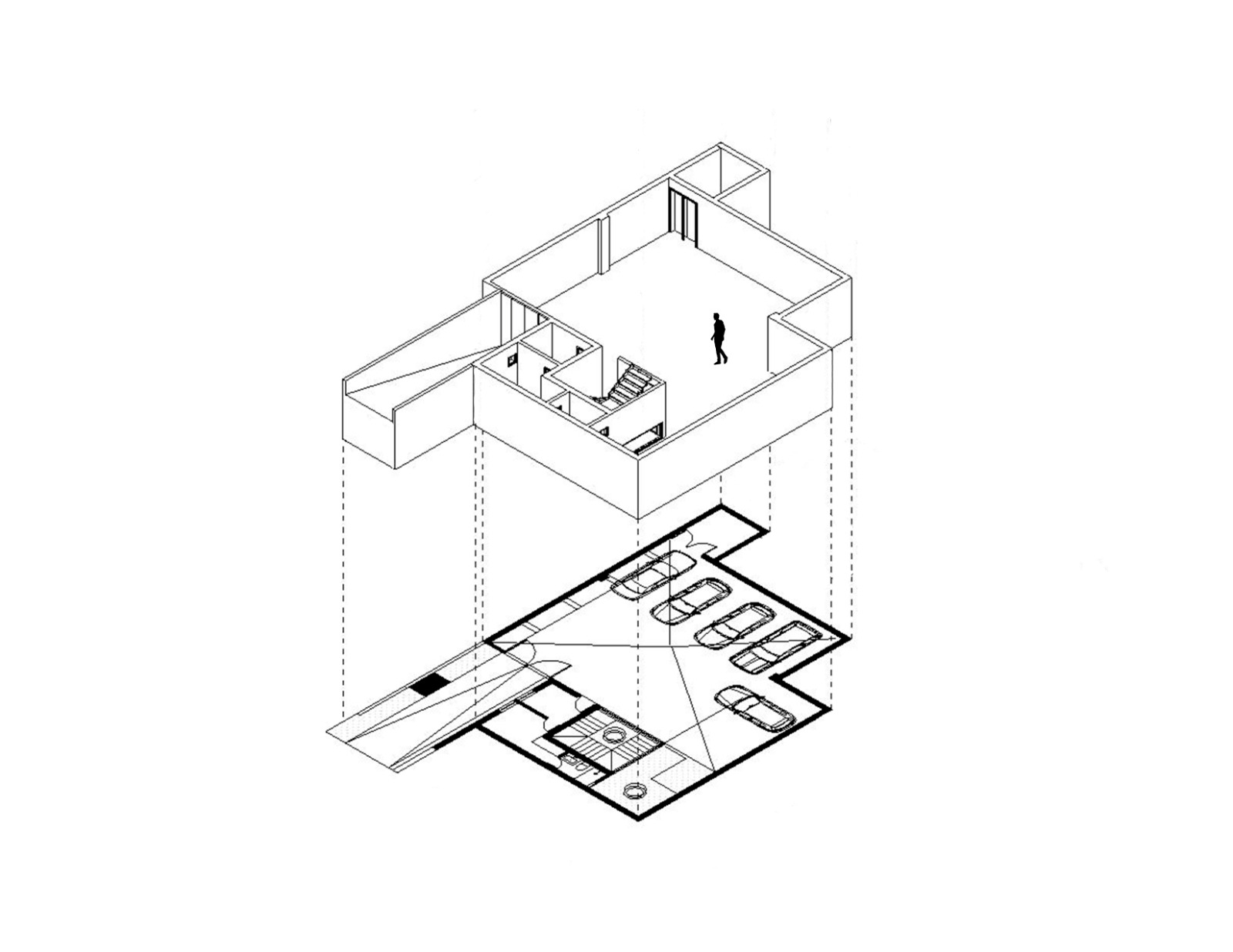 Este mismo, busca reducir los metros cuadrados posibles de construcción sin afectar las dimensiones de los espacios, por lo que radican las dobles alturas a lo largo de todo el recorrido y de esta manera podemos unificar la vivienda, sin tener muros interiores de por medio que obstruyan la visual del recorrido que queremos generar.