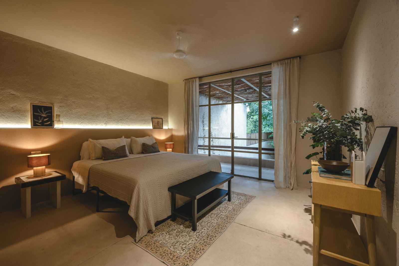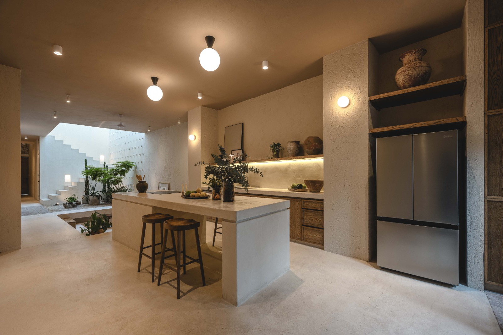 Para enriquecer la percepción espacial, se hundió la sala algunos escalones por debajo del nivel principal, generando un cambio de altura que aporta intimidad y jerarquía. Esta área se abre hacia un jardín interior, donde un muro de doble altura revestido en rajuela local se convierte en el eje visual y emocional del espacio.