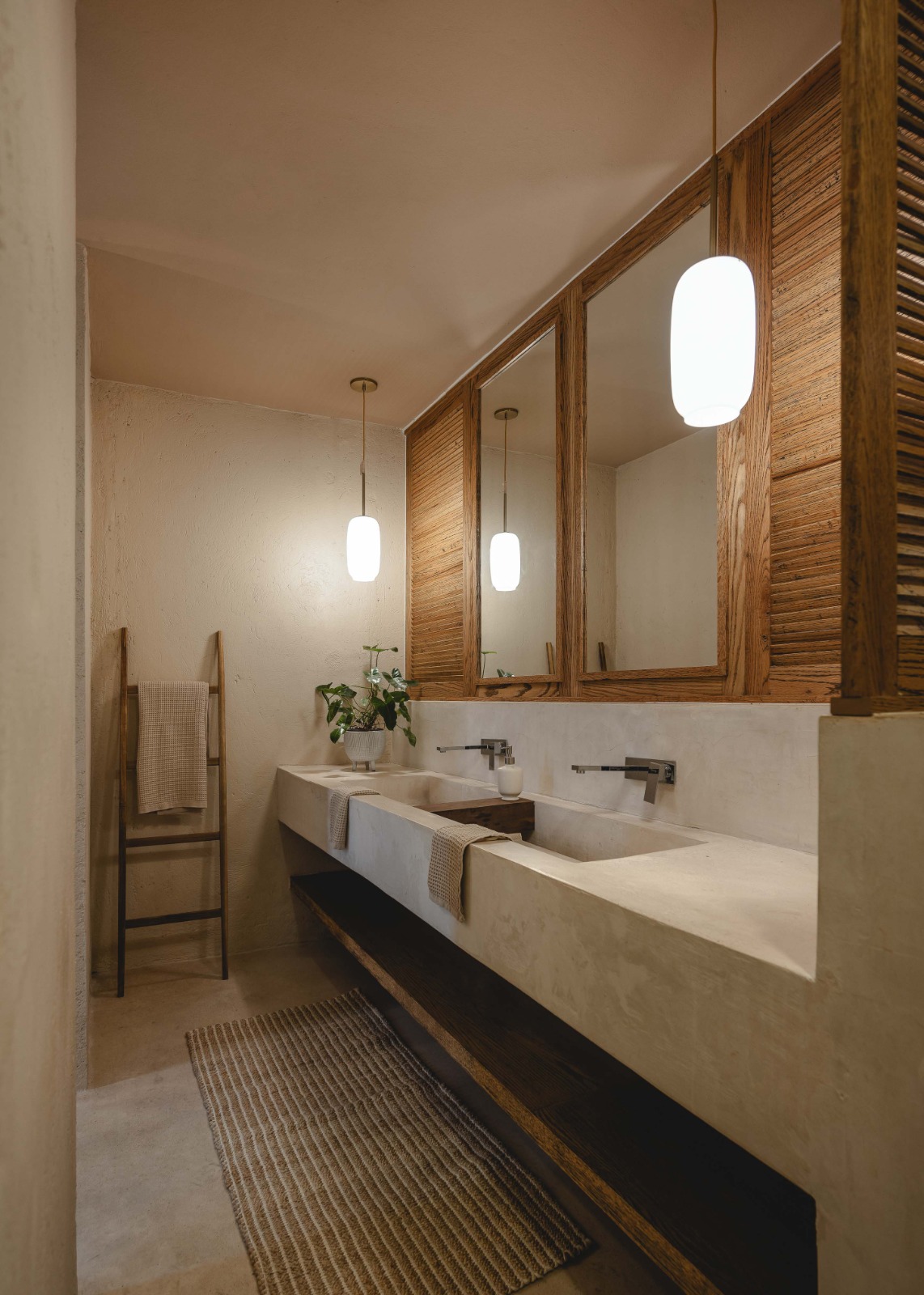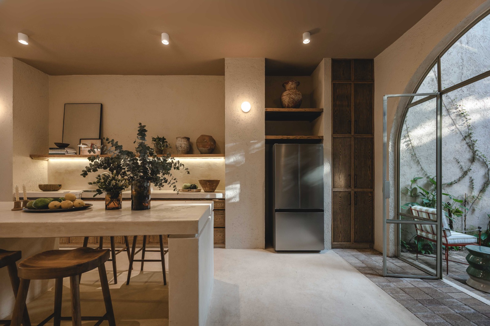 La paleta de colores fue cuidadosamente seleccionada para fundirse con la arquitectura, permitiendo que esta fuera la verdadera protagonista. El interiorismo, sobrio y atemporal, fue concebido con especial atención al detalle, buscando una armonía silenciosa que acompañe la experiencia espacial sin distraerla.