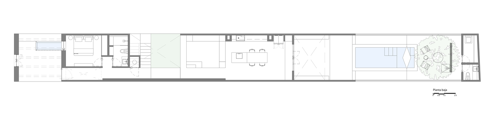 Desde el primer gesto, el proyecto busca rendir homenaje al pasado: se conservó la fachada original como parte del tejido histórico del centro de Mérida, así como las vigas de madera de la primera crujía, que fueron restauradas e incorporadas al nuevo lenguaje arquitectónico. Esta convivencia entre lo antiguo y lo contemporáneo permite que la casa respire su historia sin renunciar a la innovación.